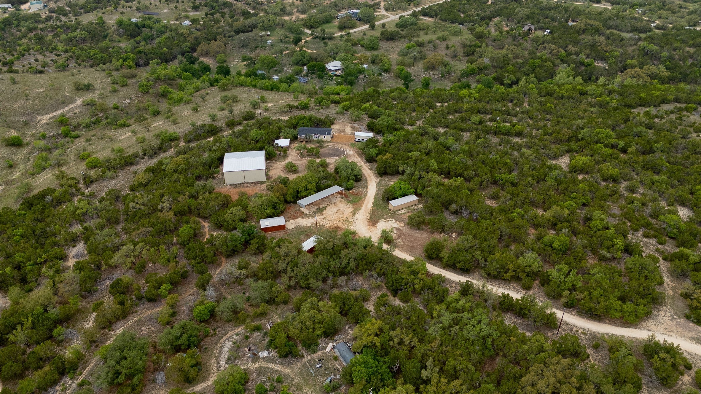 Set in the desirable Highway 290 corridor area between Dripping Springs and Johnson City, this unrestricted 8.892 acre Hill Country property offers space, flexibility, and sweeping views, perfect for full time living, weekend use, or a multi purpose homestead. The 2018 manufactured home features 3 bedrooms, 2 baths, an open floor plan, and inviting front porch and back deck ideal for enjoying the surrounding landscape and Hill Country VIEWS. The land is thoughtfully improved with exceptional infrastructure, including a 3,600+/- sq ft insulated metal barn with two roll-up doors and electricity, well suited for equipment, hobbies, or business use. Additional improvements include an RV port with hookups, oversized single car garage (which also houses the well equipment), a two car carport, and a large equipment carport, offering ample covered parking and storage. The property is gated and fenced, providing privacy and security. A water well with softener, aerobic septic system, and available wireless internet round out the utilities. All appliances will convey. Enjoy peaceful Hill Country views, Johnson City ISD, and low property taxes, all while being conveniently located near Johnson City and Hill Country amenities. With no restrictions, the possibilities here are endless: live, work, expand, or simply enjoy wide-open Texas living. **Buyer and Buyer's Agent are responsible for conducting all due diligence and verifying all information, including but not limited to property condition, zoning, permits, taxes, and square footage.**