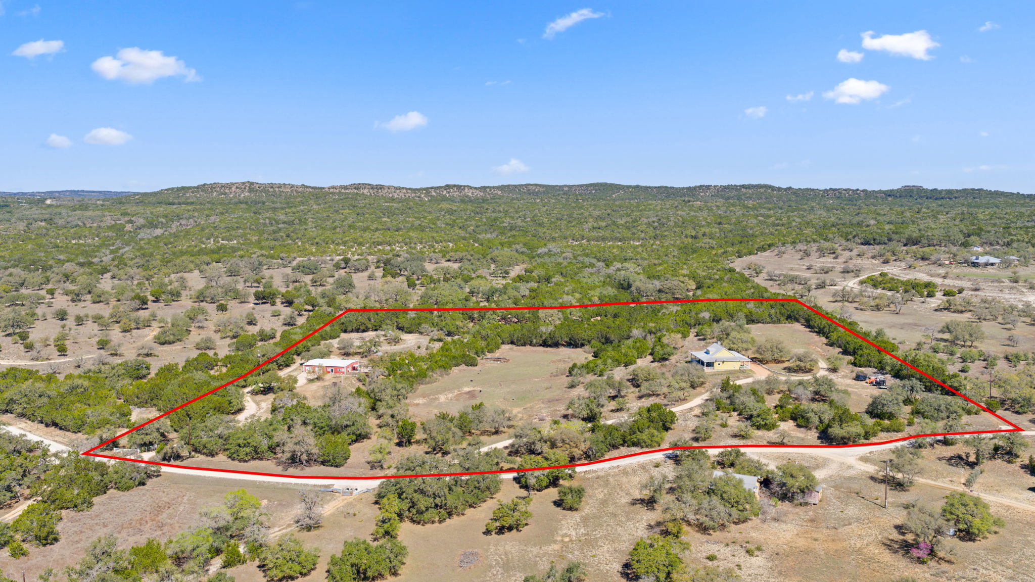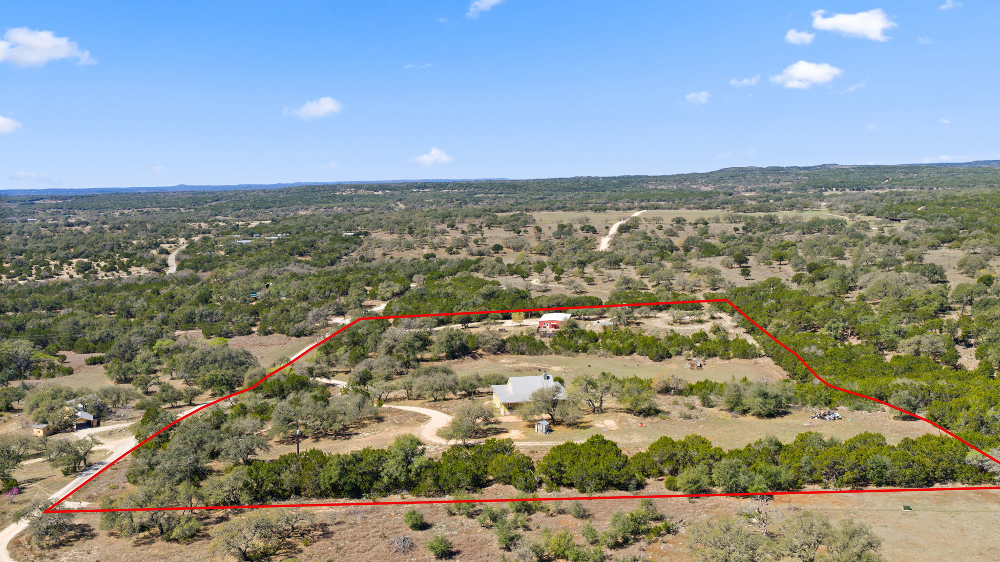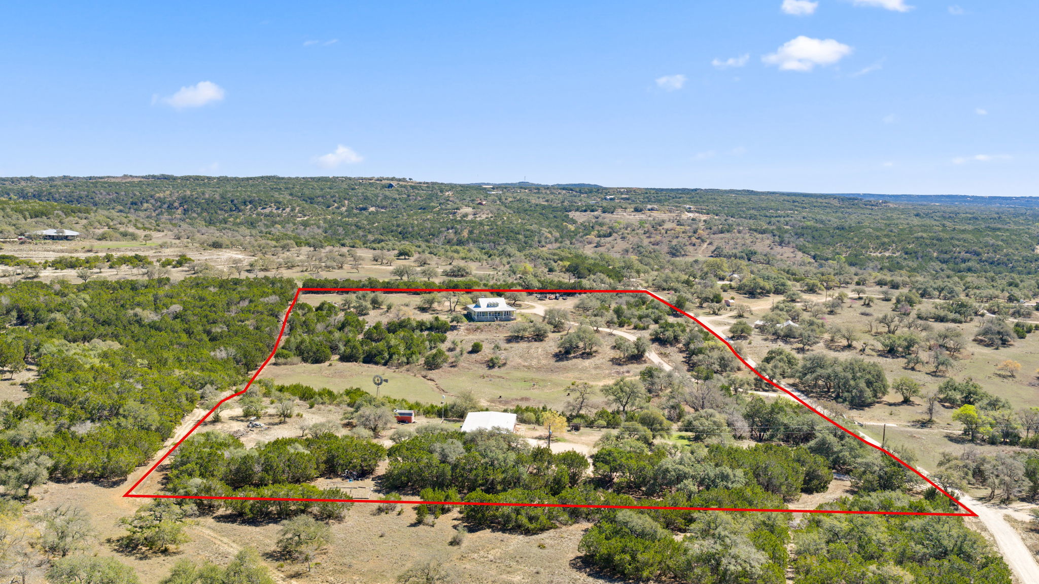 Perched on 11 Ag Exempt breathtaking acres with sweeping panoramic Hill Country views, this exceptional property offers the perfect blend of privacy, natural beauty, and refined country living. The gently rolling landscape provides a stunning backdrop of wide-open skies, mature native trees, and spectacular big Texas sunset views. The main residence is thoughtfully positioned to capture the incredible scenery and has 1904 square feet of comfortable, well-designed living spaces that blend seamlessly with the surrounding landscape. Expansive windows bring in abundant natural light and frame the views, creating a peaceful and inviting atmosphere throughout the home. The main house has an independent well and septic system from the guest apartment. The property has 2 wells and 2 septic systems. A separate guest house has an additional 1200 square feet of living space and 1200 square feet of workshop/storage and provides ideal accommodations for visitors or extended family offering flexibility and privacy while remaining conveniently close to the main residence. This 11 acre property offers private Hill Country land to explore, entertain, and create your dream outdoor living environment. Whether adding a pool, gardens, outdoor kitchen, or additional structures, the possibilities are endless. Enjoy the tranquility of country living while being just minutes from town—yet worlds away. Perfect as a full-time residence or lock-and-leave Hill Country retreat, this property has it all- views, privacy, and a setting ideal for entertaining and gathering with family and friends. A rare opportunity to own a truly special piece of the Texas Hill Country.