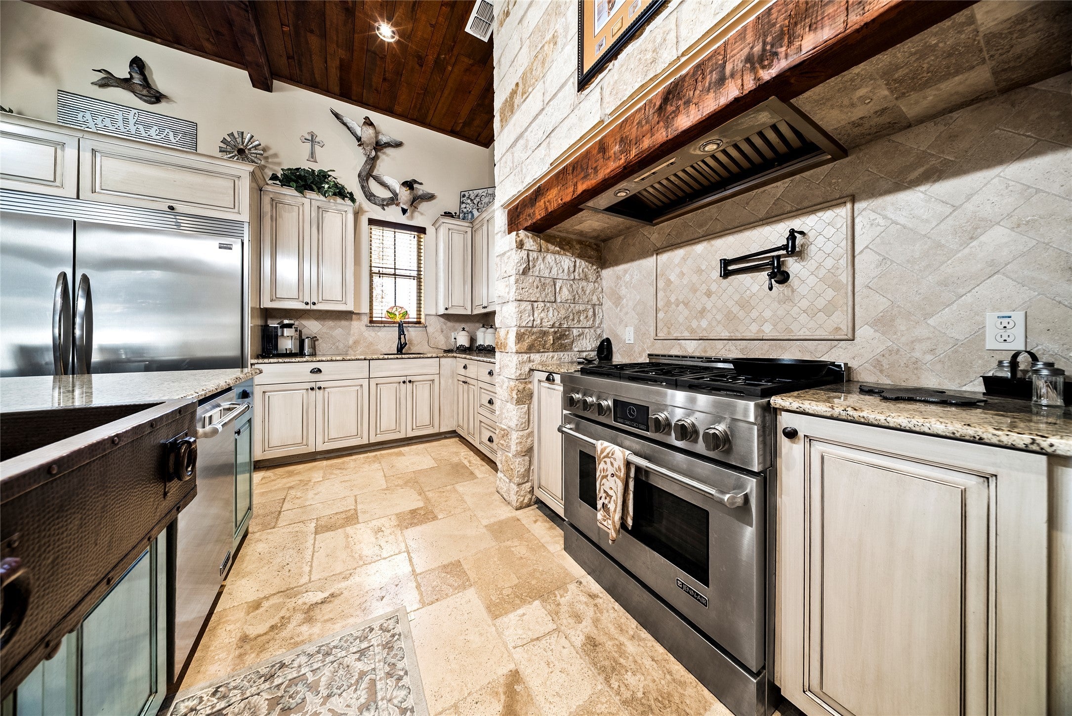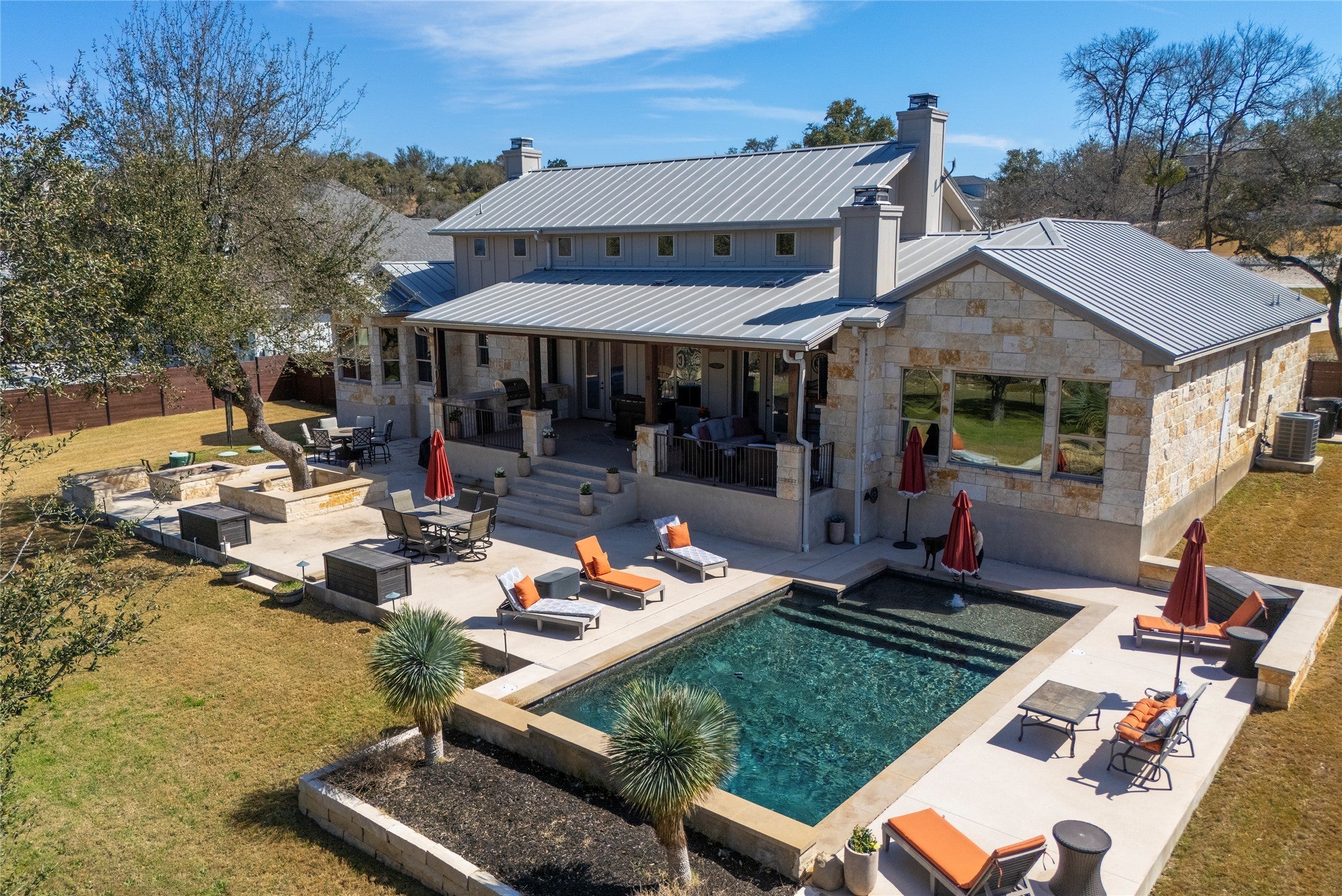 Situated on a 1.011 acre homesite in Liberty Hill, this thoughtfully designed property offers open living spaces, timeless character, and the Hill Country lifestyle buyers are searching for. A durable metal roof adds long-term value and classic Texas style to the exterior. Inside, soaring ceilings with exposed beams highlight the main living and dining areas, while a fireplace anchors the space and creates a warm, inviting focal point. Large windows bring in natural light and connect the interior to the surrounding landscape. The kitchen is both functional and welcoming, featuring a large center island with a distinctive copper sink, a built-in refrigerator, abundant cabinetry, pot filler and an additional prep sink that makes cooking and entertaining effortless. The open layout allows the kitchen to flow naturally into the living and dining areas, making it ideal for everyday living and gatherings. The home offers four bedrooms and three full bathrooms along with a dedicated study. The 4th bedroom can easily serve as a guest suite, game room, media or additional living area. The primary suite provides a relaxing retreat with a spacious bathroom that includes a soaking tub designed for comfort and relaxation. Outdoor living truly shines with a large covered patio featuring an outdoor kitchen and fireplace, creating the perfect setting for entertaining year-round. The backyard offers a pool and peaceful views, while a wet weather creek adds character and a natural backdrop to the one-acre property. Additional features include a laundry room with utility sink and a three-car garage with epoxy flooring providing a clean, durable finish and plenty of space for vehicles, storage, or hobbies. Located in Liberty Hill-north of Austin, this property offers Hill Country charm with convenient access to shopping, dining, and commuting routes.