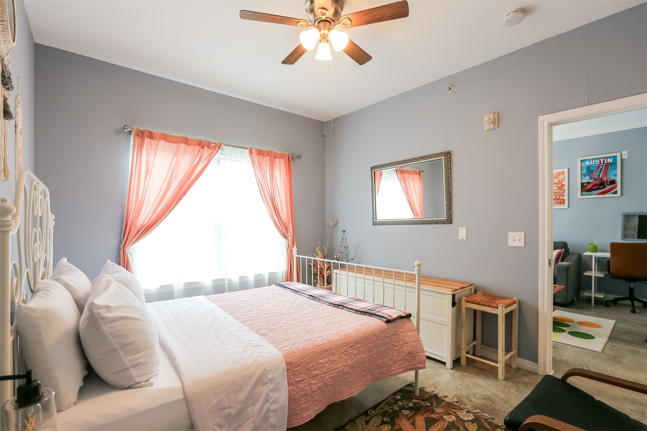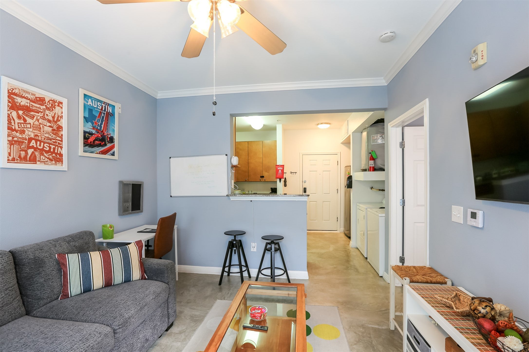 FULLY FURNISHED and poolside at Texan Shoal Creek Condos, this bright and modern 4th-floor one-bedroom West Campus condo is available for August 1, 2026 pre-leasing (**an earlier move-in date may also be available - contact us for details**). Located within walking distance of UT Austin, this open floor plan features stainless steel appliances, granite countertops, and stained concrete and tile flooring throughout. The owner plans to install a brand new washer and dryer in the unit. The spacious bedroom connects to a large walk-in closet and includes a motorized blind installed just six months ago. Your private balcony overlooks the community swimming pool and central sundeck courtyard. In addition to the pool courtyard, this gated community features a parking garage, elevator access, and a trash chute for easy disposal, and mailboxes are within the controlled access area. Google Fiber Webpass high-speed internet is available. The condo is just one block from the UT Shuttle, one block from the 24-hour Orange Market, and only a couple of blocks from Shoal Creek Trail and Caswell Tennis Center, with countless restaurants, cafes, and shops within walking distance. Pets are not allowed. Pre-lease now and enjoy the ease of securing a fully furnished condo in advance, making your move-in seamless and ready from day one.
