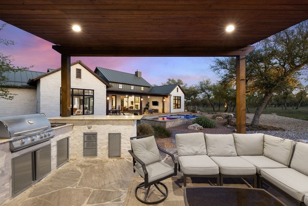 This stunning Wimberley gem is both distinctive and full of character, featuring reclaimed beams and rich wood flooring that create warmth and timeless appeal throughout the home. Thoughtfully designed, the property offers expansive living and entertaining spaces, complemented by beautiful flagstone patios that seamlessly blend indoor and outdoor living. A state-of-the-art pool with an aquatic fast lane provides the perfect setting for continuous swimming and exercise. The home is also equipped with over $100,000 in advanced water systems, including rainwater harvesting and a deep water well—just a few of the many luxury features that set this property apart. The estate welcomes you with a serene courtyard entrance and sits on 5+ acres of meticulously maintained land, fully cleared of cedar for both beauty and usability. Located within River Mountain Ranch, residents enjoy private water access along with free-roaming livestock, offering valuable agricultural tax benefits.
