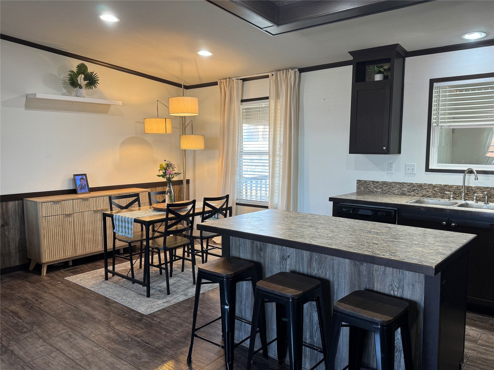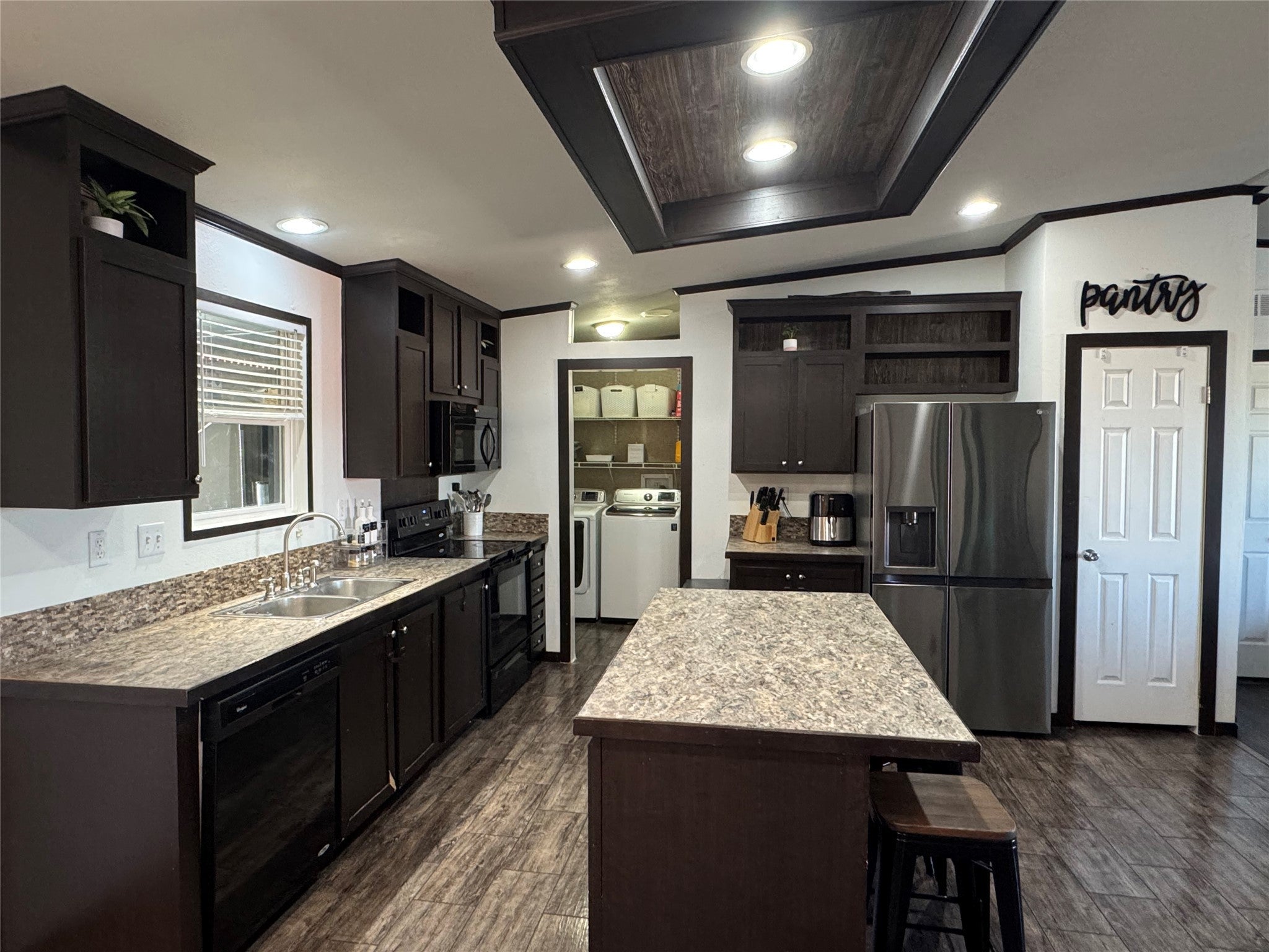 Perfectly nestled home in the Summit Ridge subdivision with family amenities. Home features front and back covered patios, 2 separate driveways and a storage shed. When you enter the home you are welcomed by a large open floorplan with a beautiful kitchen with a center island and dark cabinets with black appliances. Separate laundry room and pass through to the back flex space for playroom, man cave, etc. Spacious primary bedroom is located on one side of the home for privacy & offers a spacious bath with double sinks, separate shower/tub and walk in closet. Plus the backyard has a fenced in turf area (8x13) perfect for kids and pets. Back room add on is 8x29'10 feet~Covered back patio is 8x8 feet~ Front deck 6x27 feet with 8ft covered ~Side ramp (3'11x15'10 feet) to side back door for easy access to unload groceries, etc. Loaded with extras!!! LOT rent is $720 a month. Ask for lender contact to get approved.