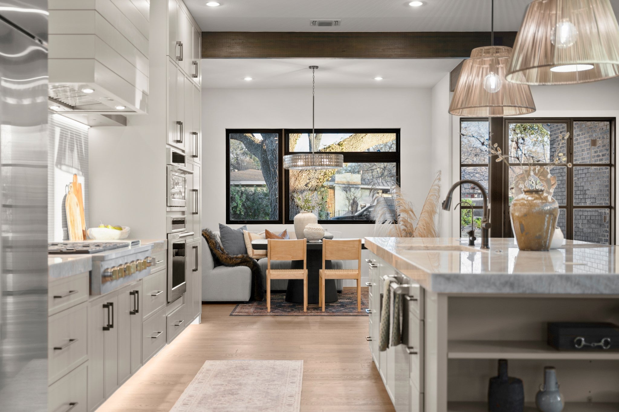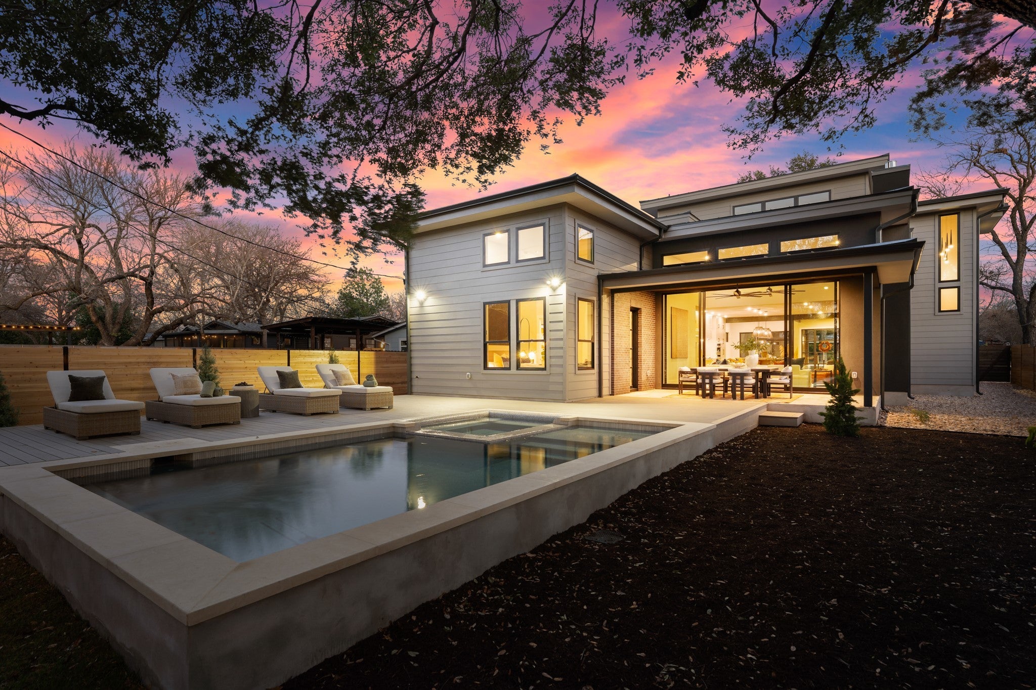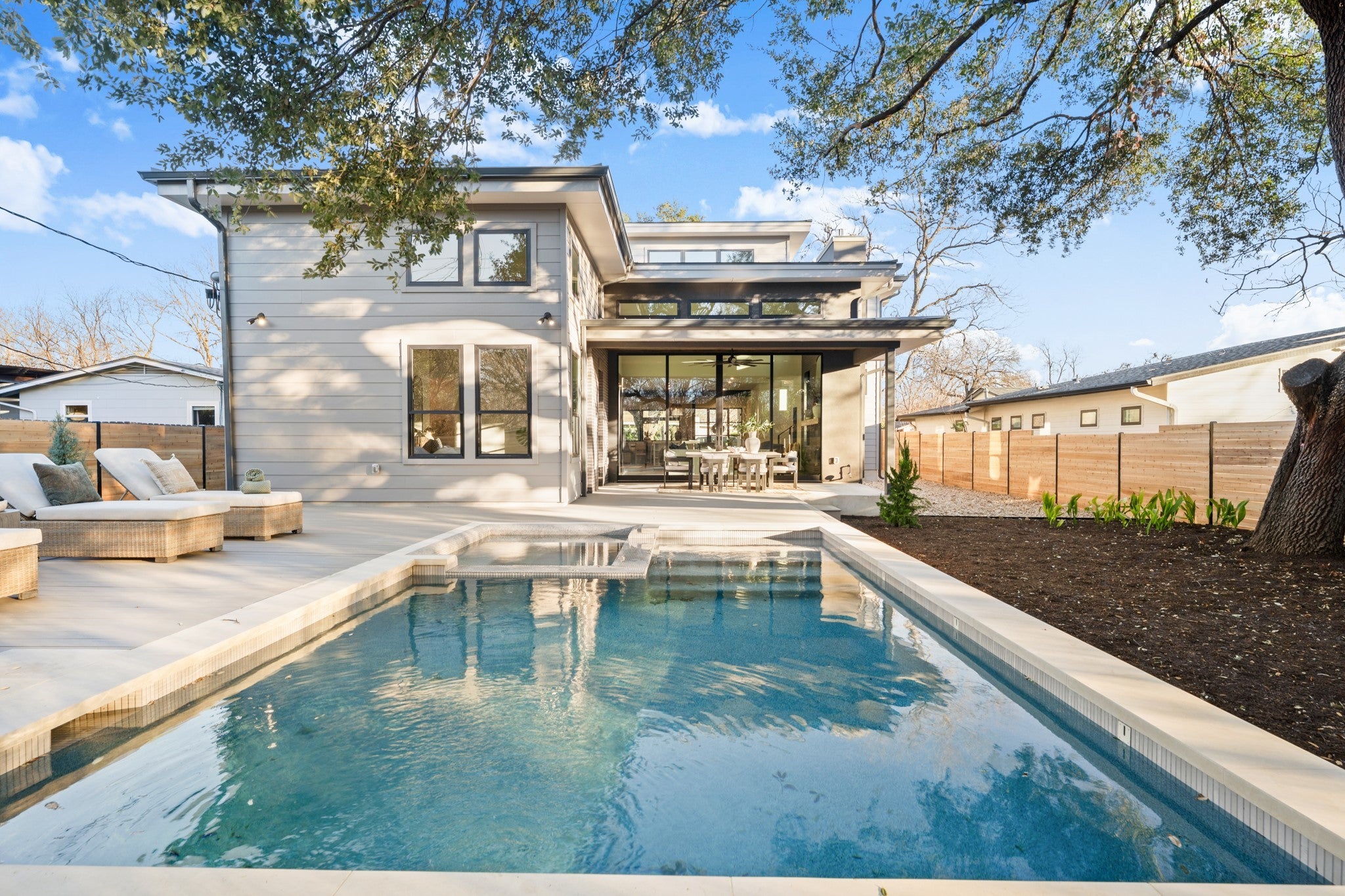 Rare. Refined. Ready. On one of Crestview's most established streets, beneath the canopy of a magnificent heritage oak, stands a home that stops you the moment you pull up. This is 7706 Rutgers — 3,311 square feet of new construction by Essential Elements, where elevated design and indoor-outdoor Austin living come together without compromise. The great room is unforgettable. Soaring ceilings rise above a full floor-to-ceiling charcoal brick accent wall anchored by a sleek linear gas fireplace. Wide-plank hardwood floors and a wall of black-framed sliding glass doors dissolve the line between inside and out — opening directly to the covered patio, the pool, and the heritage oaks beyond. The kitchen was built for someone who actually cooks. A full GE Monogram suite — 48" professional gas cooktop, built-in column refrigerator, and double wall ovens — is framed by floor-to-ceiling custom cabinetry, a shiplap hood, open wood shelving, exposed beams, and a marble Taj Mahal Island with seating for five. The primary bath is spa-level: floor-to-ceiling marble, frameless glass shower, built-in bench, and brushed champagne bronze fixtures throughout. Outside, a rectangular heated pool and spa, covered patio, and privacy-fenced yard shaded by heritage oaks deliver the private resort experience Central Austin rarely offers. Five bedrooms. Four baths. Zoned to Brentwood Elementary, Lamar Middle, and McCallum High. Walkable to Burnet Road and minutes from The Domain, UT, and Downtown. This is the one you've been waiting for.