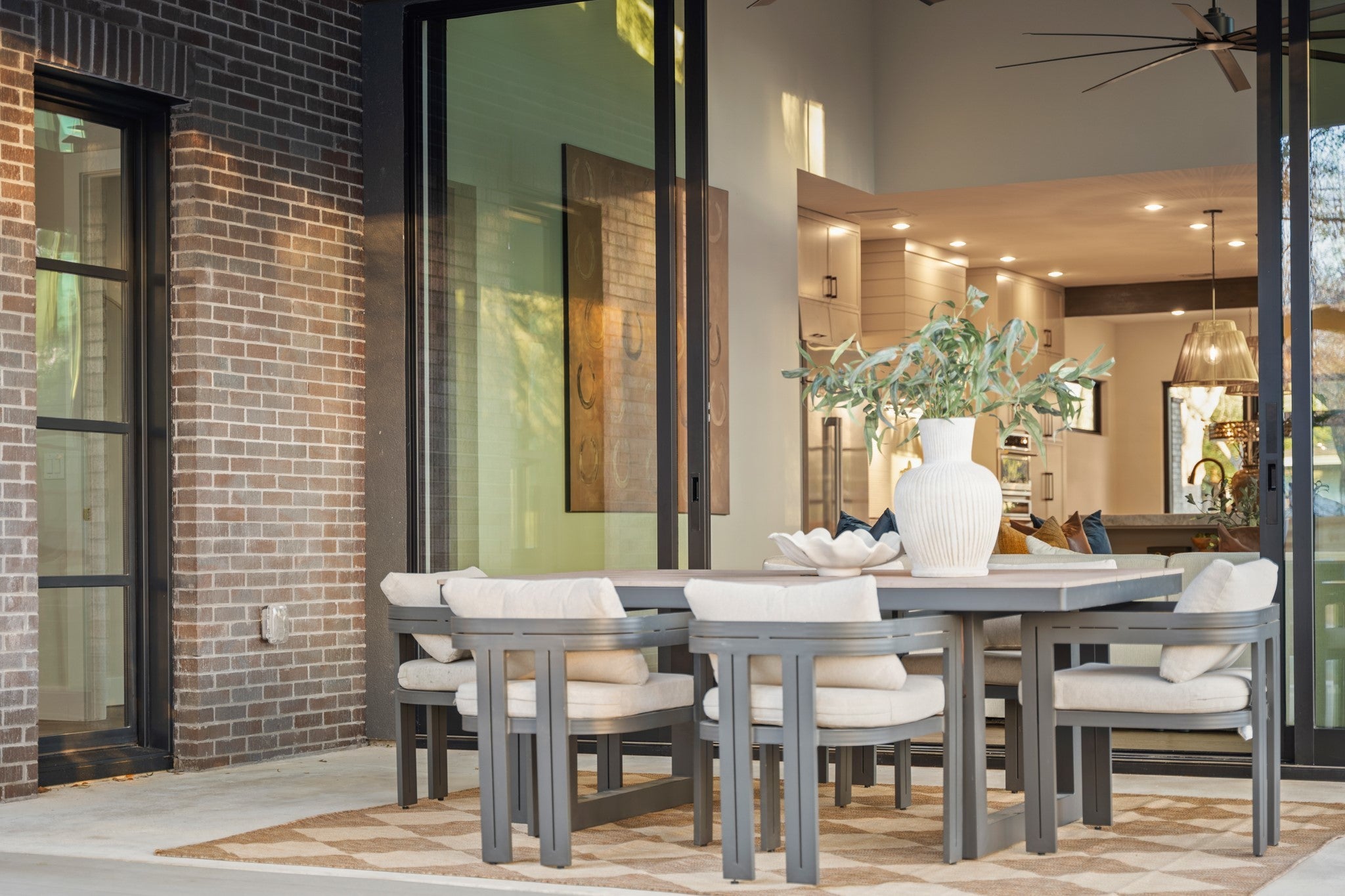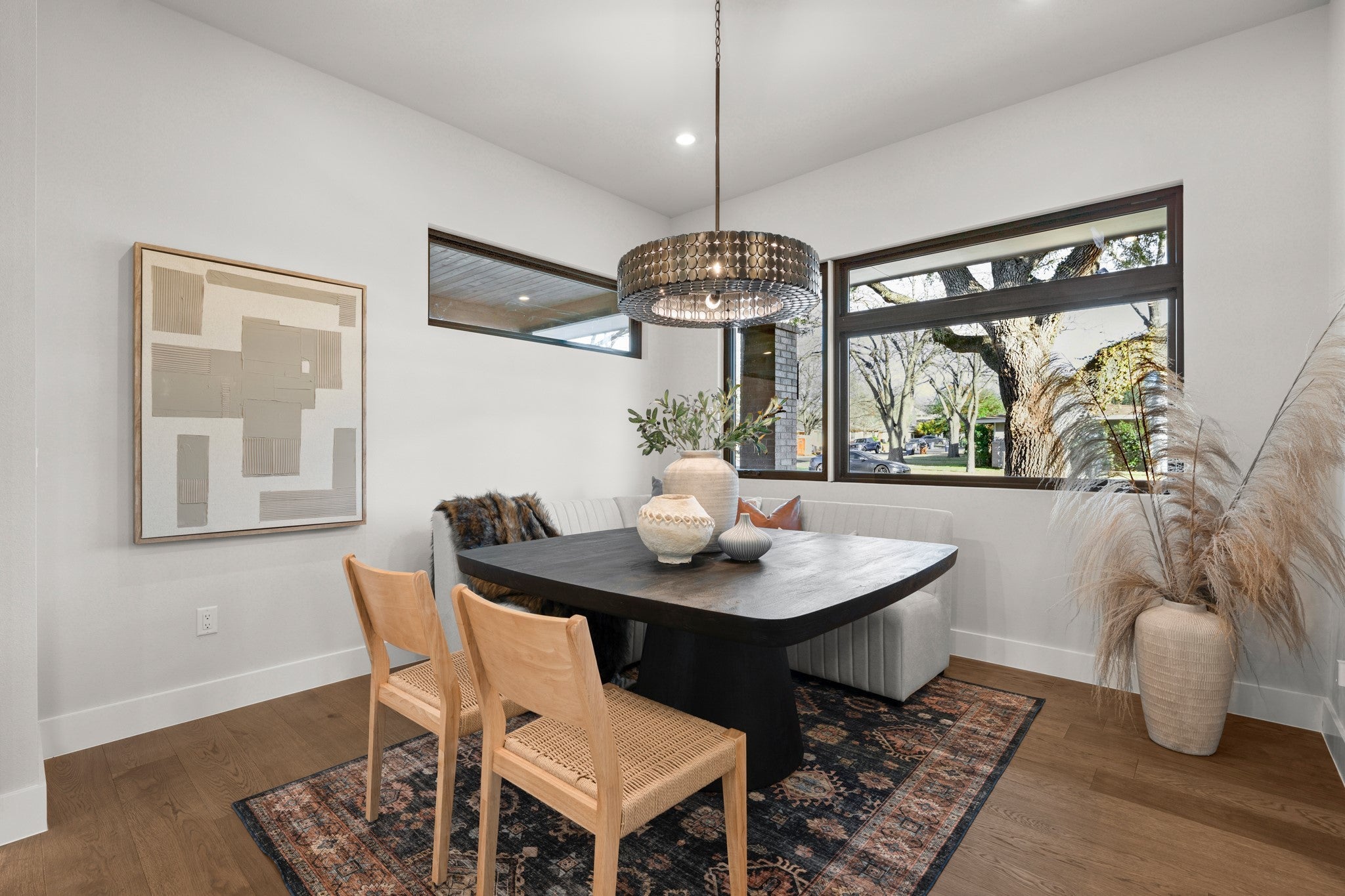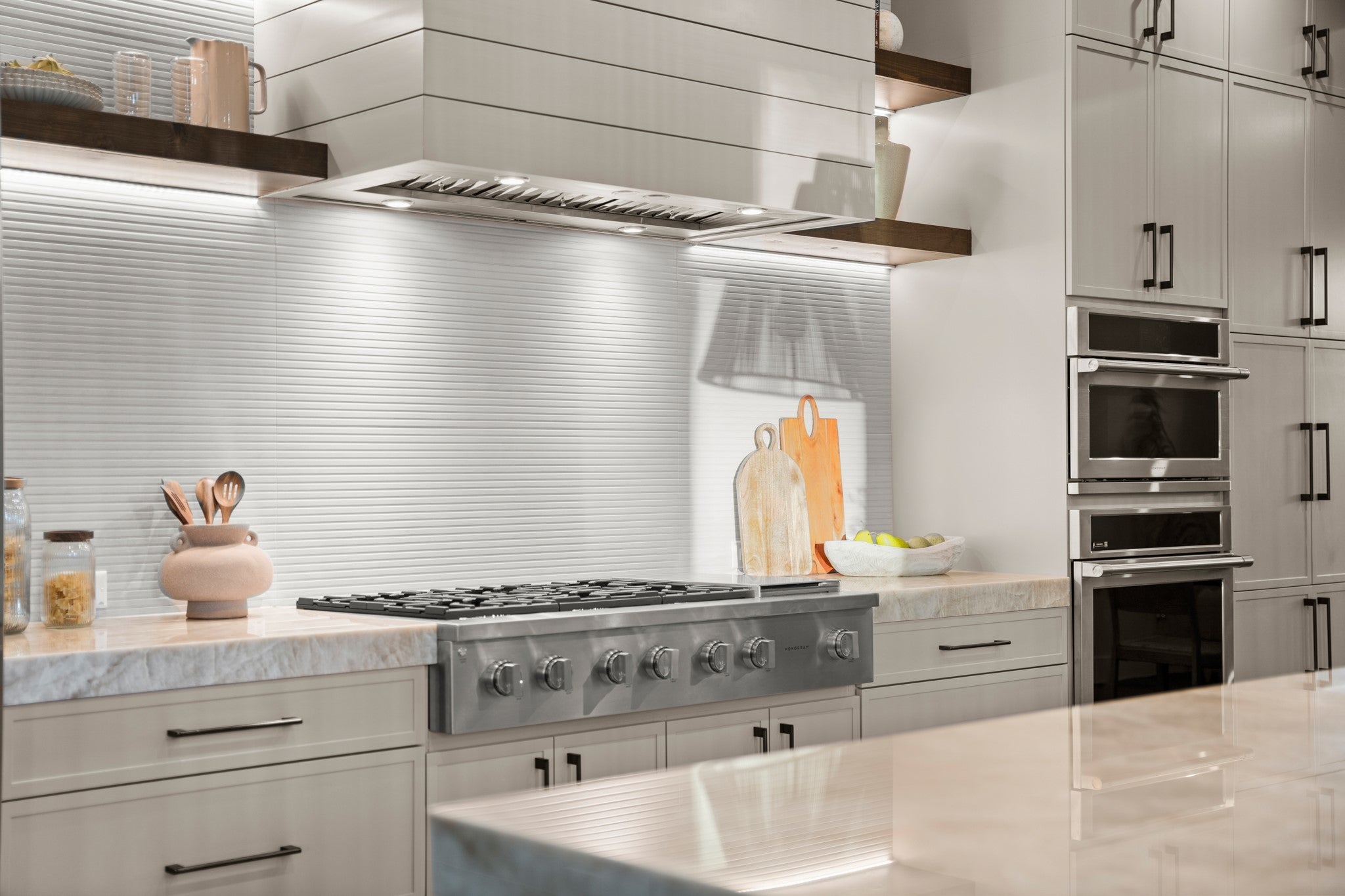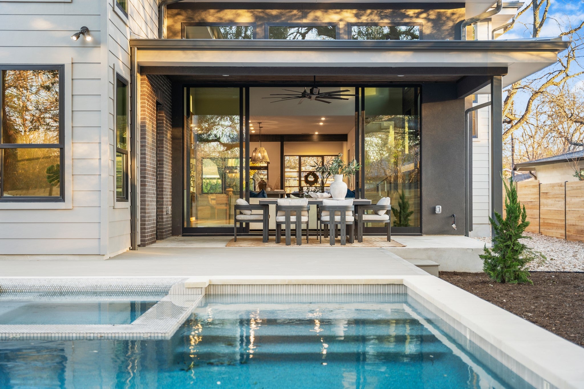 Rare. Refined. Ready. On one of Crestview's most established streets, beneath the canopy of a magnificent heritage oak, stands a home that stops you the moment you pull up. This is 7706 Rutgers — 3,311 square feet of new construction by Essential Elements, where elevated design and indoor-outdoor Austin living come together without compromise. The great room is unforgettable. Soaring ceilings rise above a full floor-to-ceiling charcoal brick accent wall anchored by a sleek linear gas fireplace. Wide-plank hardwood floors and a wall of black-framed sliding glass doors dissolve the line between inside and out — opening directly to the covered patio, the pool, and the heritage oaks beyond. The kitchen was built for someone who actually cooks. A full GE Monogram suite — 48" professional gas cooktop, built-in column refrigerator, and double wall ovens — is framed by floor-to-ceiling custom cabinetry, a shiplap hood, open wood shelving, exposed beams, and a marble Taj Mahal Island with seating for five. The primary bath is spa-level: floor-to-ceiling marble, frameless glass shower, built-in bench, and brushed champagne bronze fixtures throughout. Outside, a rectangular heated pool and spa, covered patio, and privacy-fenced yard shaded by heritage oaks deliver the private resort experience Central Austin rarely offers. Five bedrooms. Four baths. Zoned to Brentwood Elementary, Lamar Middle, and McCallum High. Walkable to Burnet Road and minutes from The Domain, UT, and Downtown. This is the one you've been waiting for.