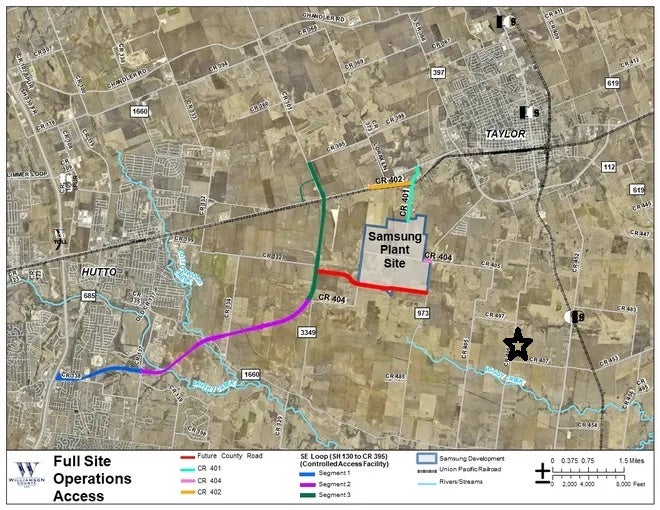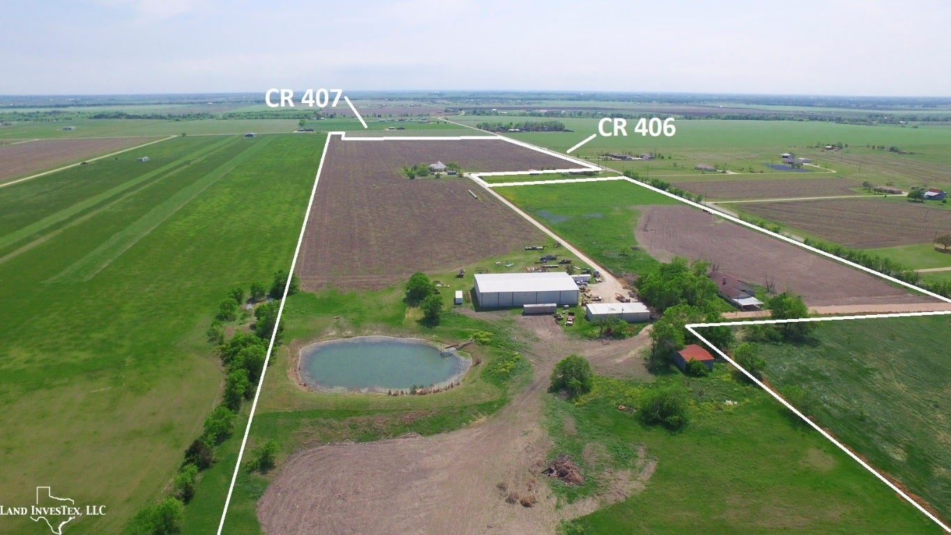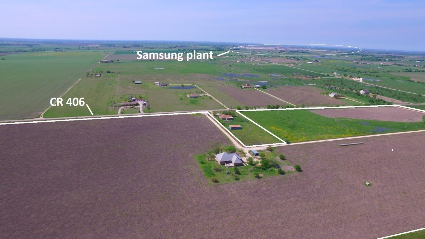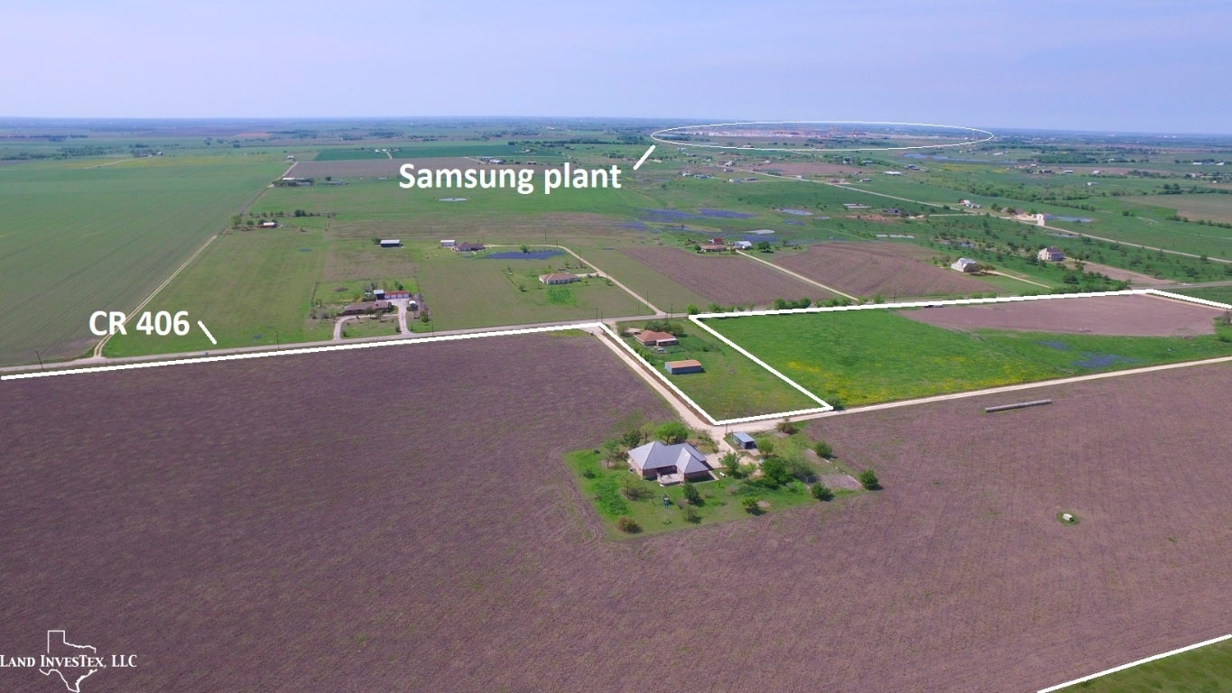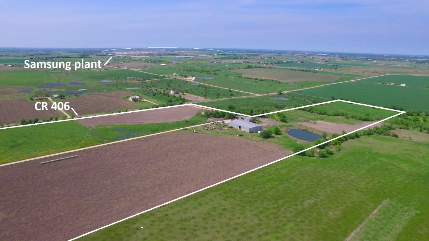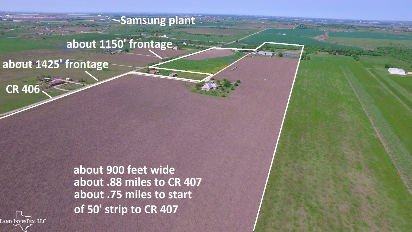 Ideally located property outside Taylor city limits and ETJ but near the new Samsung development site. Frontage on two paved county roads contribute to about a half mile of options for ingress and egress to this agriculture tax exempt property. Improvements include, community water, a brick home built on concrete piers with steel I-beams having about 3,150 sf under roof, and barn with about 10,000 sf under roof, two sheds with a total of about 3,200 sf under roof, and a half acre pond. $2.30/sq ft