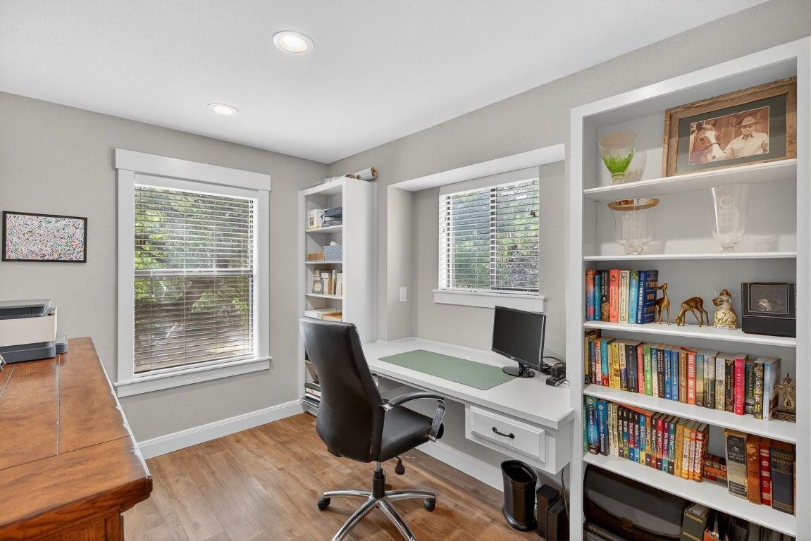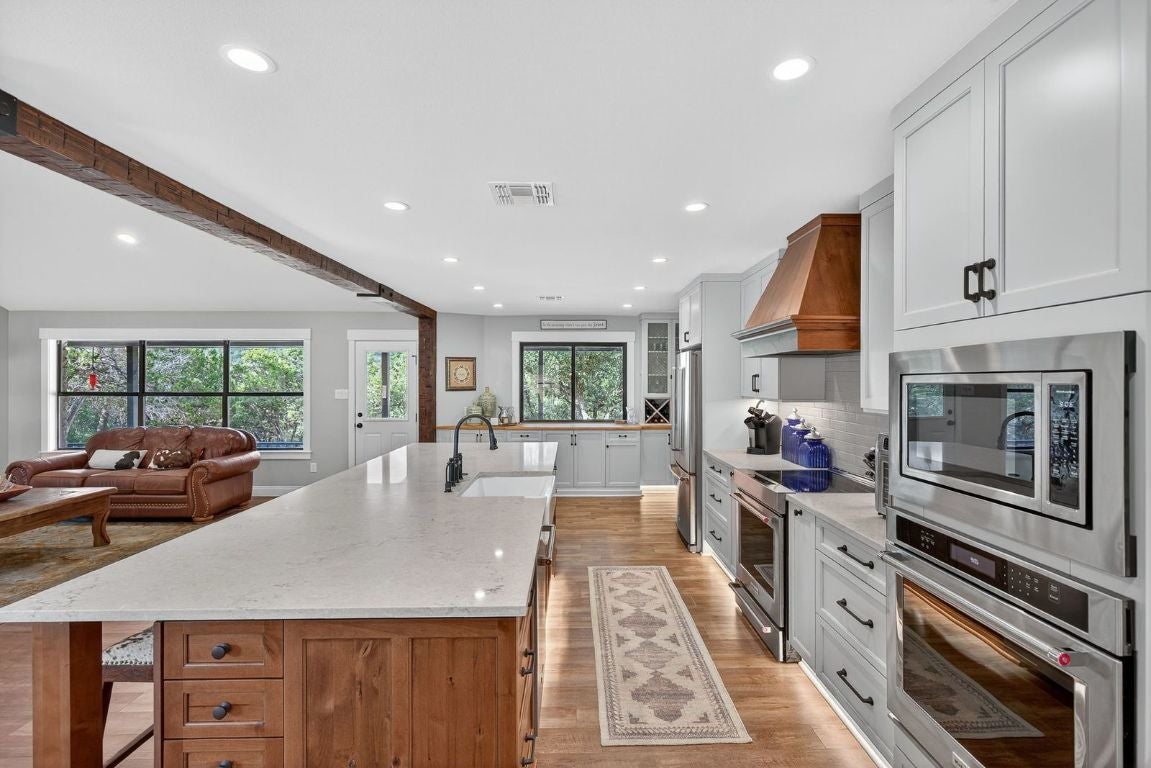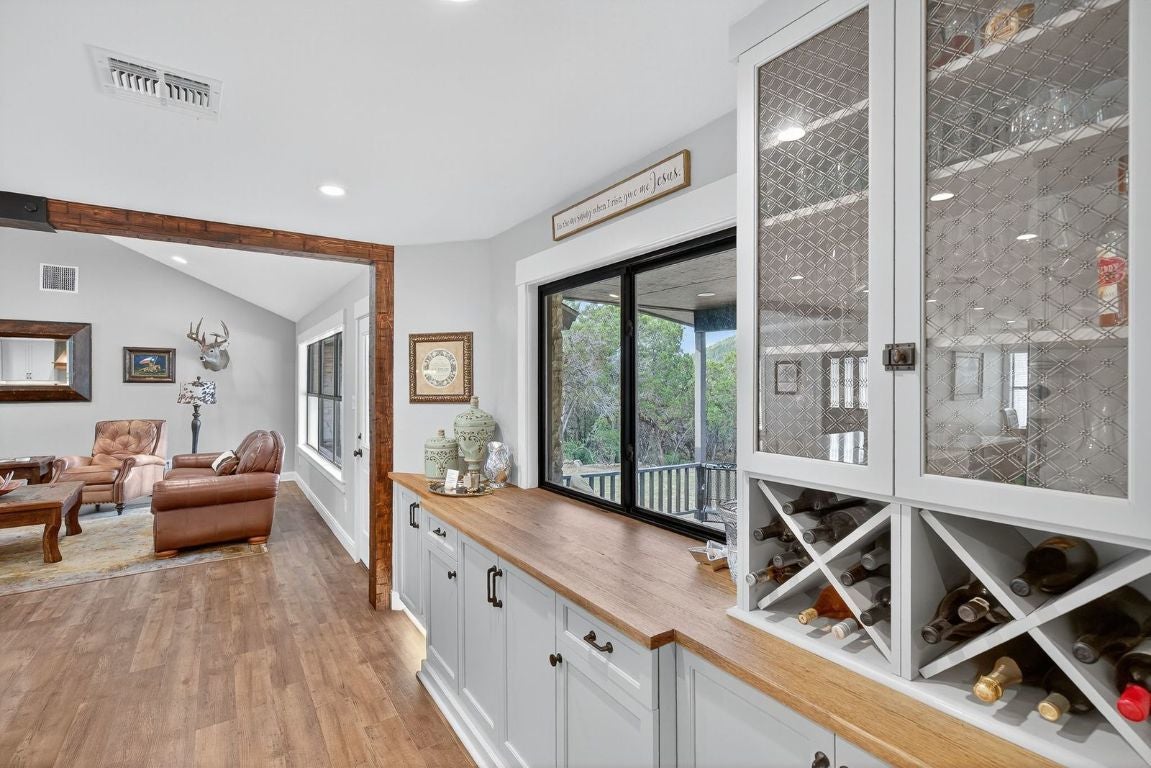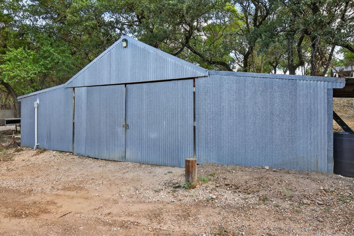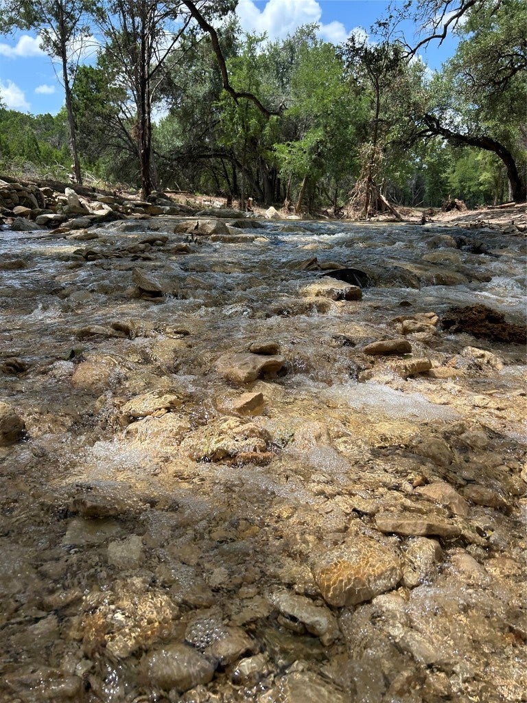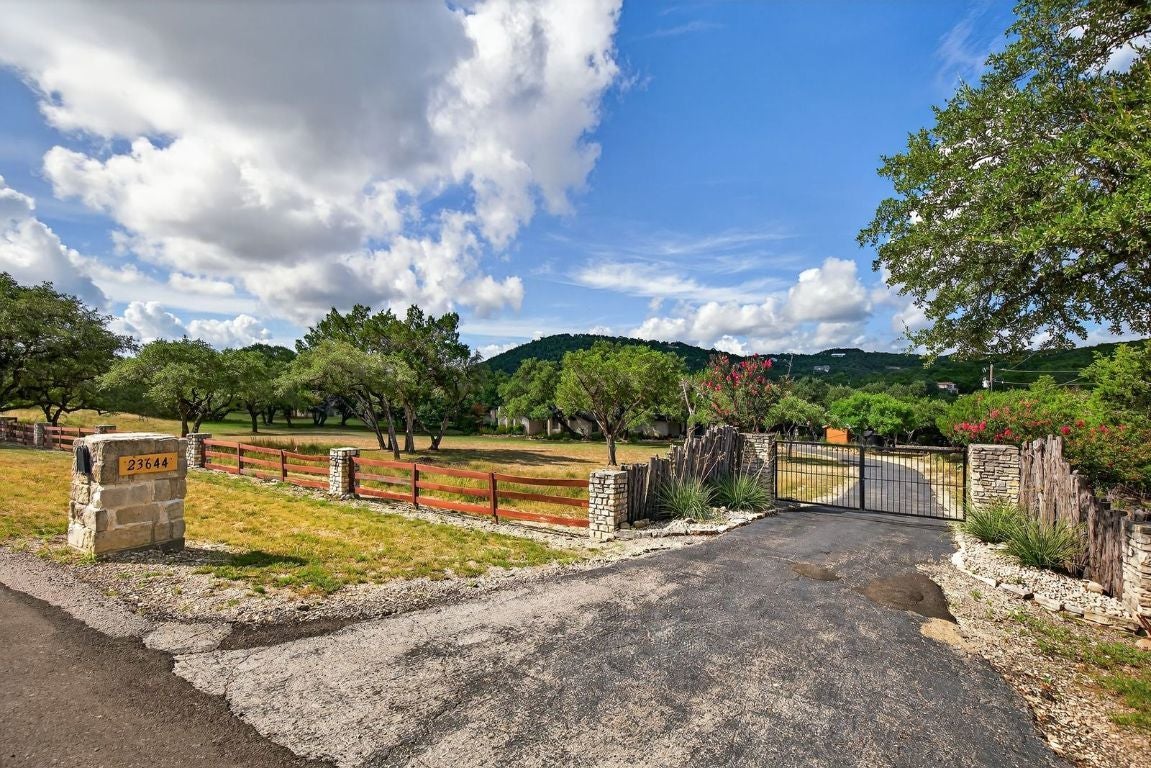 Prime unrestricted acreage with over 240 feet of frontage on Nameless Road, located directly across from the prestigious Travisso community in Leander—one of the fastest-growing cities in the Greater Austin Metro area. This property offers a rare blend of private, ranch-style living with easy access to city amenities and incredible future potential. The home and guest house were thoughtfully remodeled and upgraded in 2021, while selective removal of brush and cedar brought new life to an already beautiful landscape. The owners were meticulous in selecting native plants, reducing water needs while enhancing the picturesque setting. From the home down to the bluff-lined creek and around the approximately 3,000 square foot irrigated garden surrounded by towering pecan trees, this property truly embodies the Hill Country lifestyle.