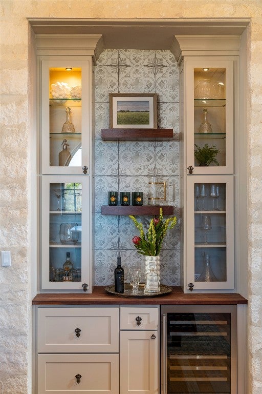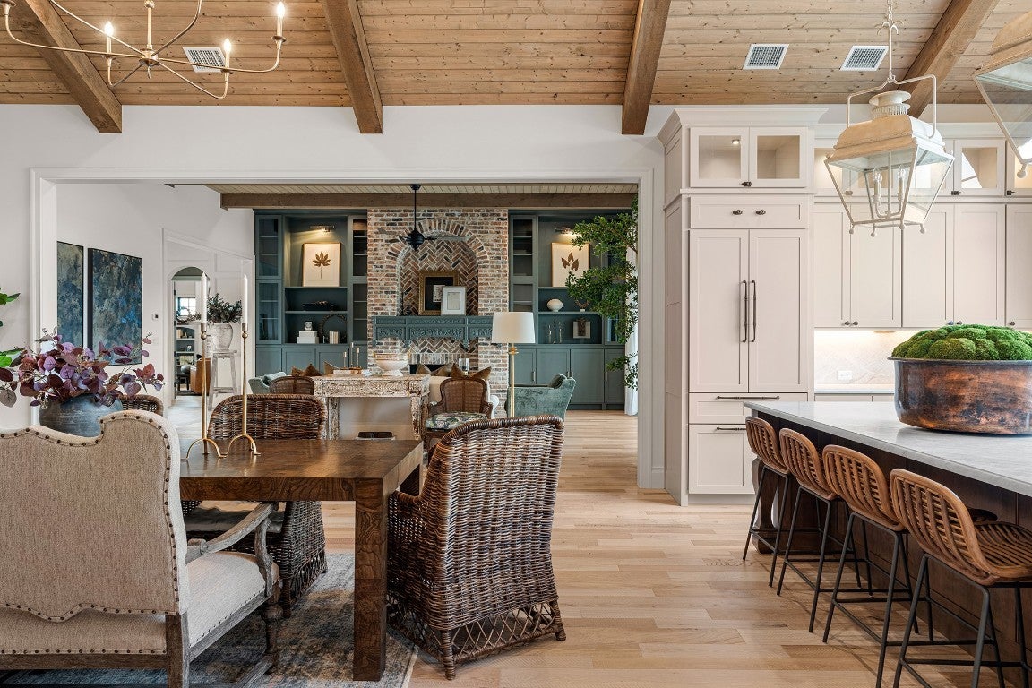 Fantastic Home by Agave Custom Homes, featured in the 2025 Comanche Trace Tour of Homes. This French Country–inspired residence offers a fantastic floor plan with 3–4 bedrooms and 4 full baths. The fourth bedroom can also function as a den, complete with a cozy fireplace. The striking entryway showcases a custom wallpaper mural, leading into a family room with an Old Chicago brick fireplace and built-in cabinets. Vaulted ceilings grace the kitchen and dining area, which features quartzite countertops, high-end appliances, and a stone accent wall. A large arched window in the kitchen frames views of Hole 3 at The Creeks Golf Course. The luxurious master suite offers a clawfoot tub, outdoor shower, and a private porch with a see-through fireplace. His and her closets feature stylish wallpaper, adding a touch of elegance. The home also includes a three-car garage with a storage room and a water softener. Also unique is the hobby room, complete with built-in shelves and a custom desk, which could easily double as a home office or creative space. All draperies to convey with all appliances and a custom sound system for the family room.. So many custom features with this showcase home voted best Floor plan and Styling. As you turn every corner in the home you are taken away from the custom features and beauty that it offers. Comanche Trace is a golf course community featuring a 27 hole private golf course, elegant clubhouse perched high on a hill, pool, pickelball and tennis courts, state of the art fitness center and walking trails throughout.