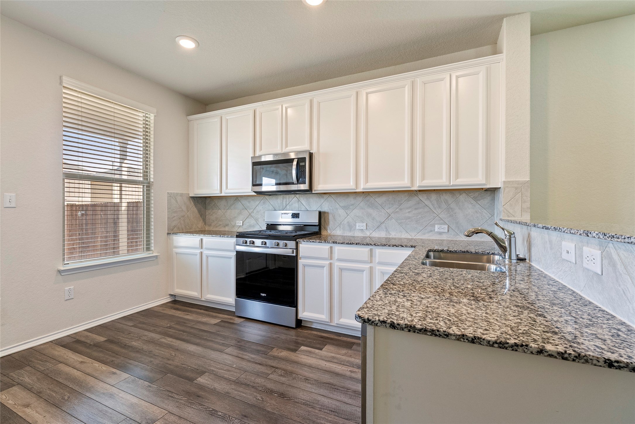 Welcome to 420 Bella Luna Way in Liberty Hill, TX 78642, a beautifully designed 3-bedroom, 2.5-bath home offering comfort and style in every detail. This home features an open floor plan filled with natural light, recessed lighting, and ceiling fans throughout, creating a bright and inviting atmosphere. The modern kitchen boasts granite countertops, a convenient breakfast bar, and plenty of space for cooking and entertaining. The spacious primary suite includes a dual vanity and a walk-in closet, providing both functionality and comfort. Enjoy outdoor living on the covered porch overlooking a fenced backyard, perfect for relaxing or hosting gatherings. This home combines thoughtful finishes and practical amenities in a desirable location, ready for you to move in and make it your own.