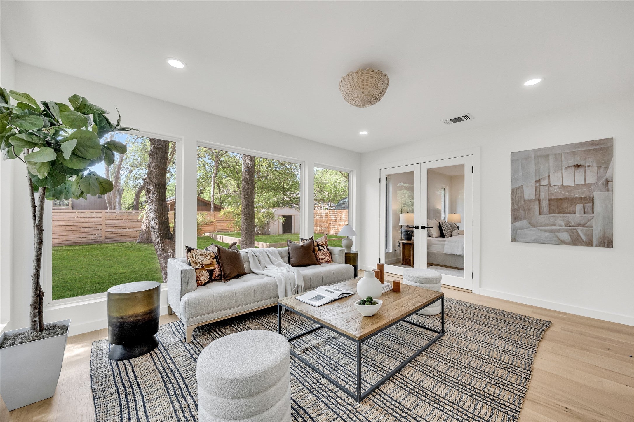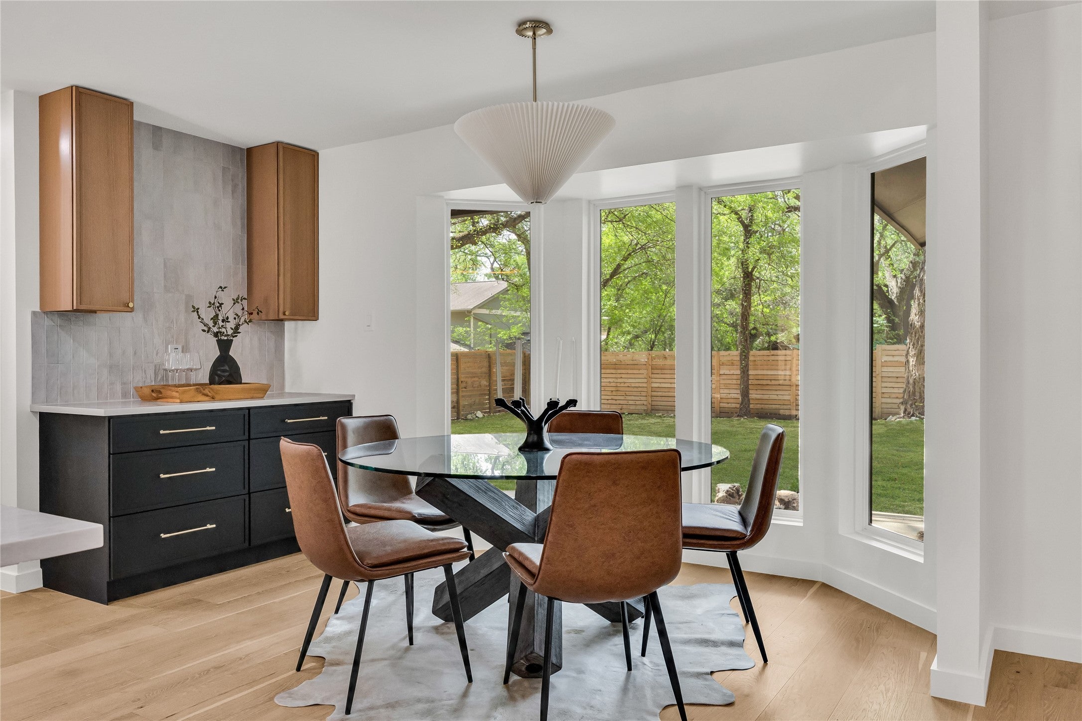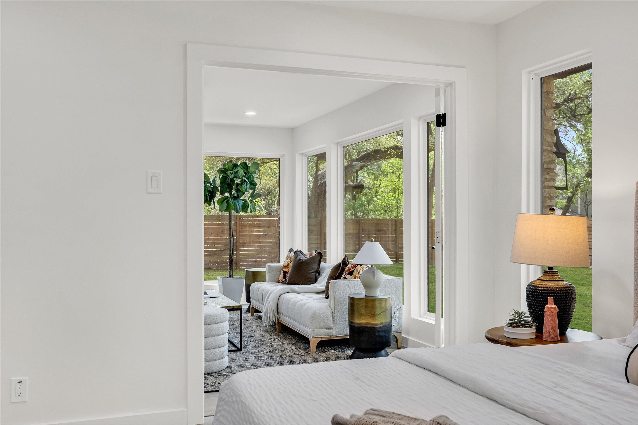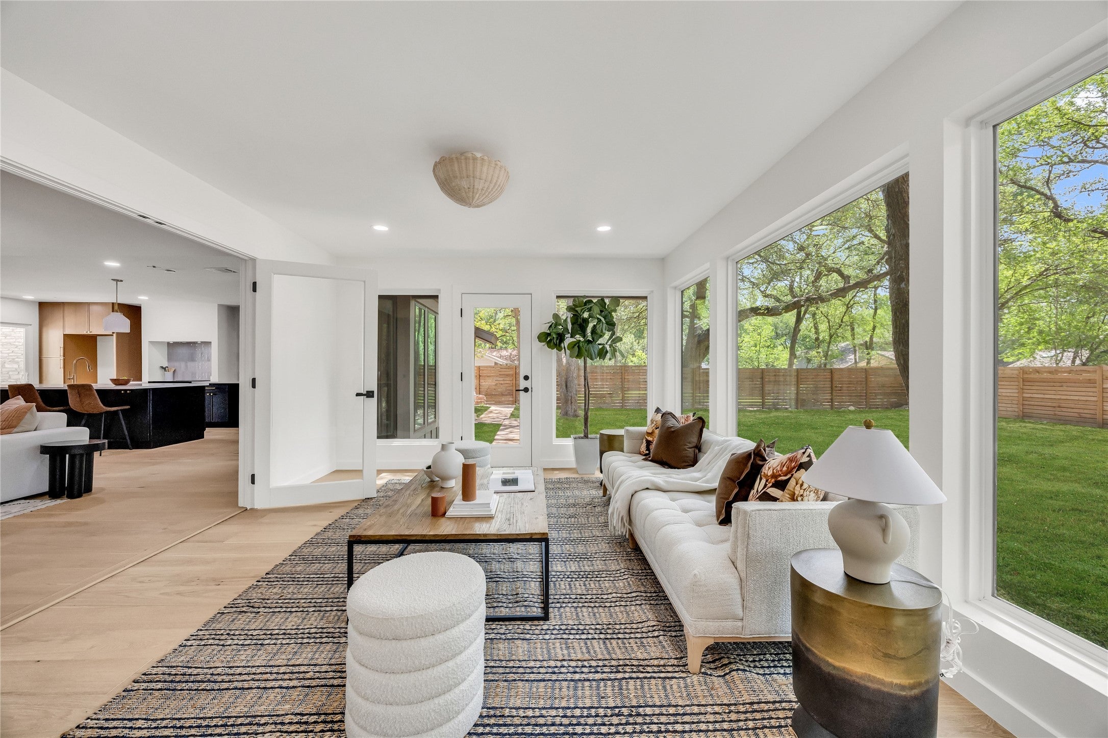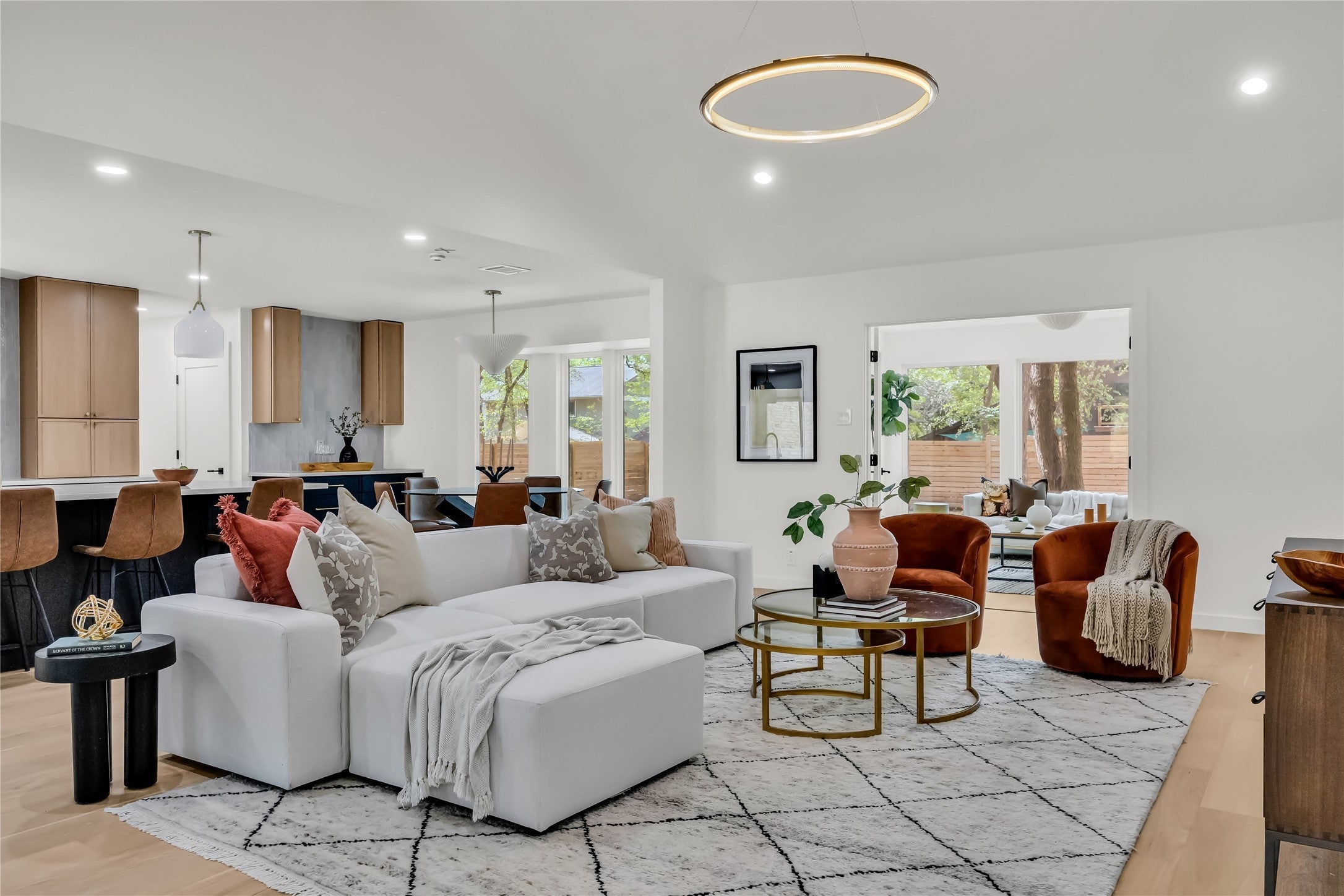 Fully reimagined and thoughtfully designed, this 4-bedroom, 3-bath home sits on an oversized 1/3-acre lot beneath a canopy of mature trees—blending modern design with natural tranquility. Inside, clean lines and warm finishes create an inviting, elevated feel throughout. The open-concept living spaces are anchored by a vaulted ceiling with exposed beam, wide-plank flooring, and seamless indoor-outdoor flow. A beautifully positioned dining area with statement lighting and expansive windows brings in natural light and backyard views. The home features a highly sought-after dual primary suite layout, ideal for multi-generational living, guests, or added flexibility. The main primary suite offers a spa-like retreat with a freestanding soaking tub, walk-in shower, and serene natural light. Secondary bedrooms are well-sized, complemented by a stylishly designed hall bath with custom finishes. Designed with everyday living in mind, the home features a functional mudroom, a spacious laundry room conveniently located off the garage, and a separate pantry with custom cabinetry—offering a seamless blend of organization and practicality. Step outside to a private backyard with mature trees, fresh landscaping, and plenty of room to create your ideal outdoor living space—perfect for entertaining or relaxing in a peaceful setting. A rare opportunity to own a design-forward home on a large lot with a flexible layout—offering space, style, and functionality in one exceptional package. *Renovations were fully permitted through the City of Austin.*