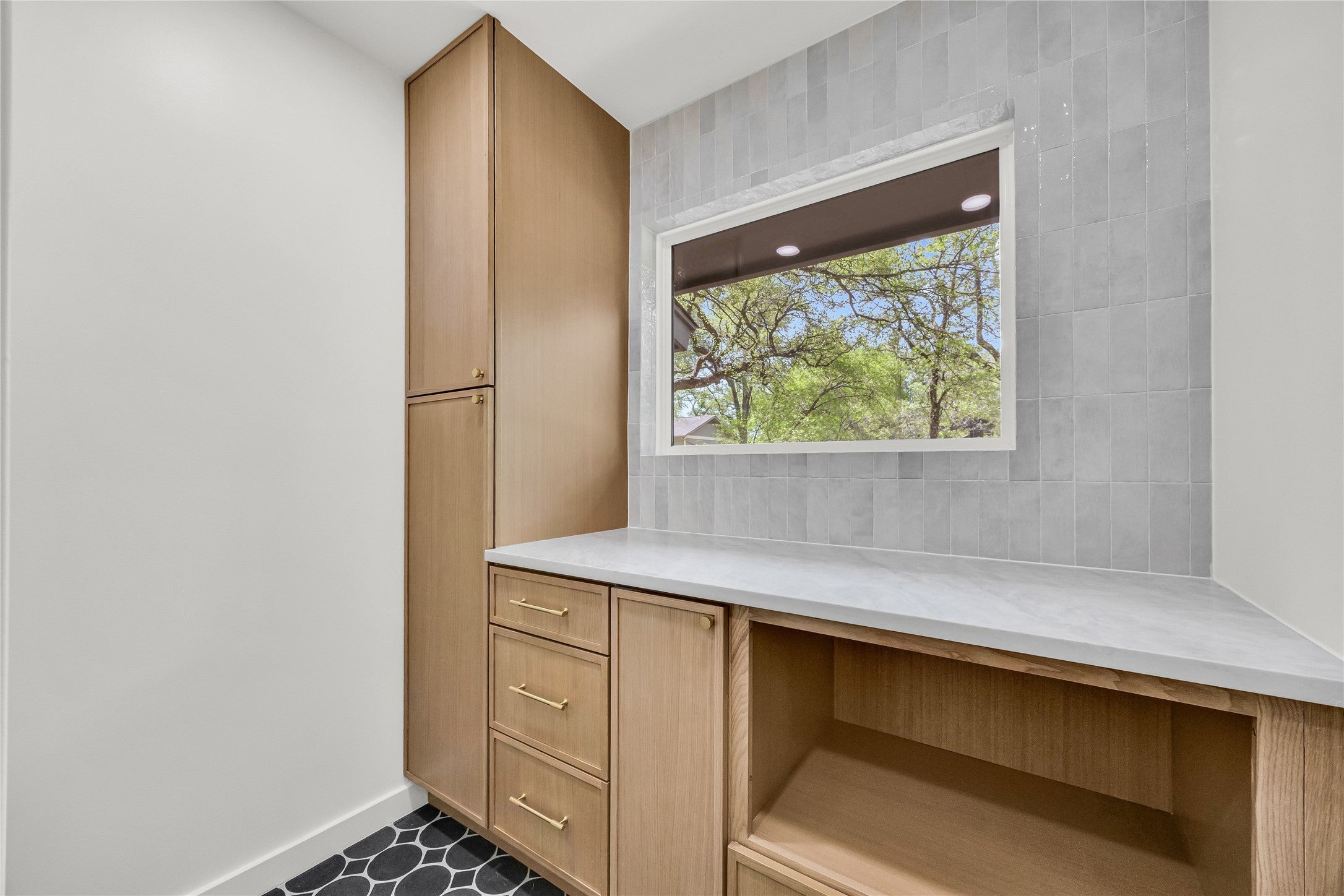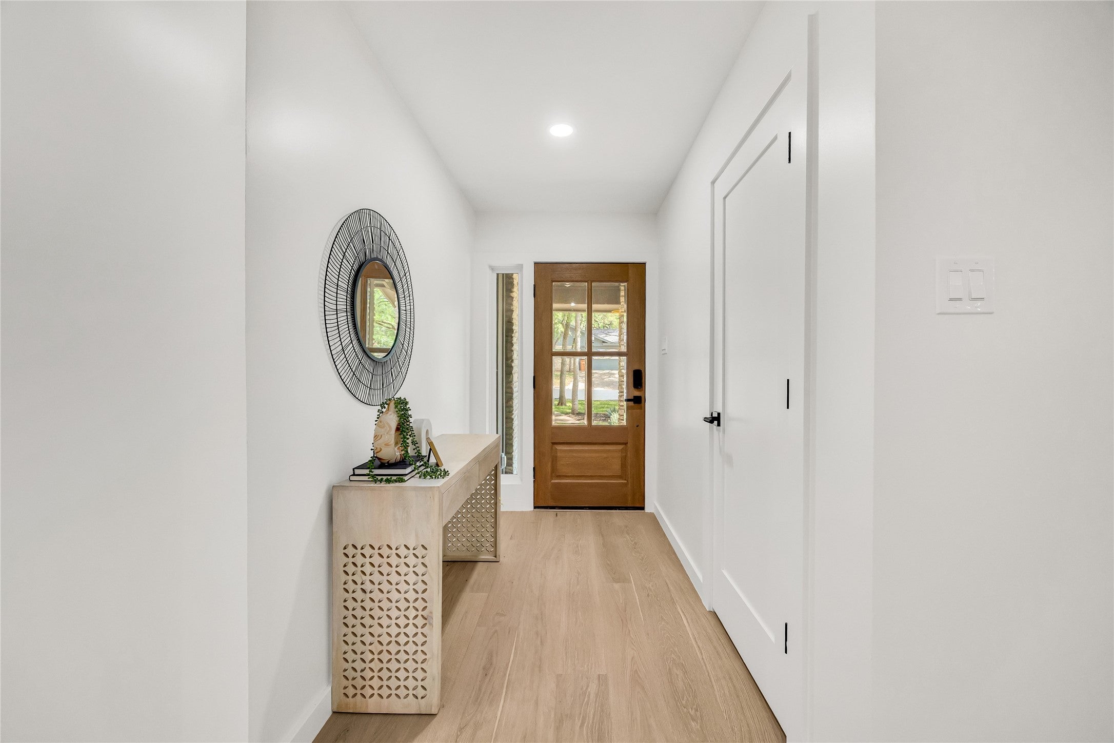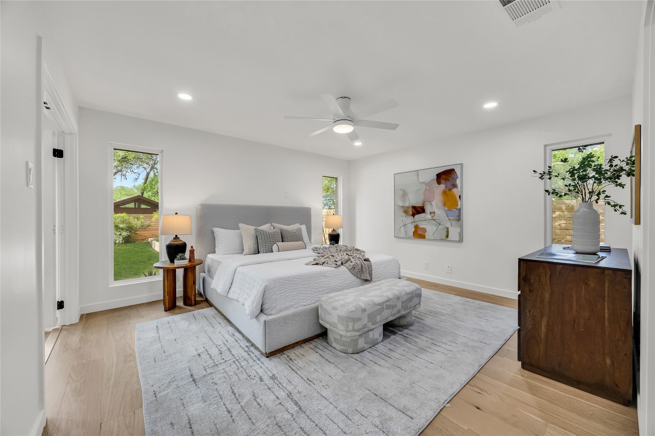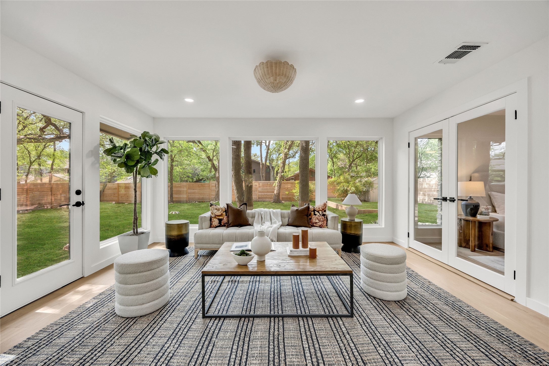 Fully reimagined and thoughtfully designed, this 4-bedroom, 3-bath home sits on an oversized 1/3-acre lot beneath a canopy of mature trees—blending modern design with natural tranquility. Inside, clean lines and warm finishes create an inviting, elevated feel throughout. The open-concept living spaces are anchored by a vaulted ceiling with exposed beam, wide-plank flooring, and seamless indoor-outdoor flow. A beautifully positioned dining area with statement lighting and expansive windows brings in natural light and backyard views. The home features a highly sought-after dual primary suite layout, ideal for multi-generational living, guests, or added flexibility. The main primary suite offers a spa-like retreat with a freestanding soaking tub, walk-in shower, and serene natural light. Secondary bedrooms are well-sized, complemented by a stylishly designed hall bath with custom finishes. Designed with everyday living in mind, the home features a functional mudroom, a spacious laundry room conveniently located off the garage, and a separate pantry with custom cabinetry—offering a seamless blend of organization and practicality. Step outside to a private backyard with mature trees, fresh landscaping, and plenty of room to create your ideal outdoor living space—perfect for entertaining or relaxing in a peaceful setting. A rare opportunity to own a design-forward home on a large lot with a flexible layout—offering space, style, and functionality in one exceptional package. *Renovations were fully permitted through the City of Austin.*