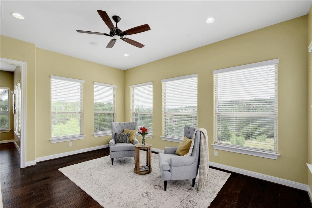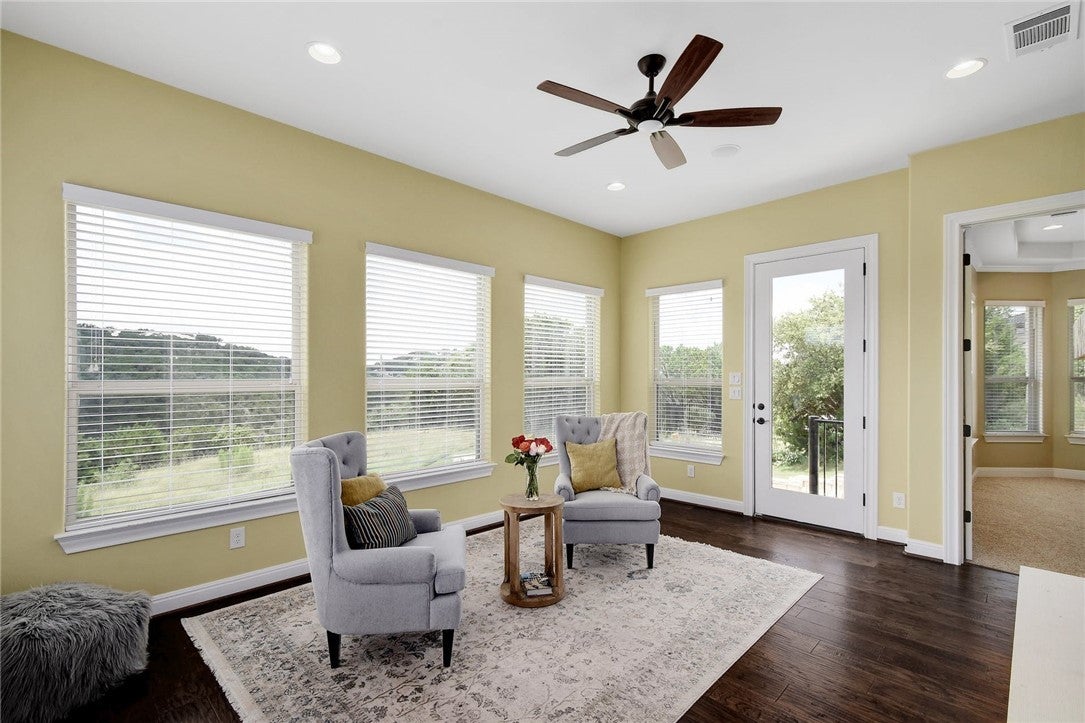 Spectacular Hill Country views on a 2+ acre with a level yard and manicured soccer field/large play space with mature perimeter trees. Ultimate Texas outdoor living- stone surround covered patio, tongue & groove ceiling, stained concrete, and an open-air patio with a massive wood-burning outdoor fireplace. This is a stunning custom home designed on two levels – enter on the main level to an open concept floor plan with rich warm wood plank flooring in the main living area. This area features a floor to ceiling stone surround fireplace – double sided - between the main living area and a cozy lookout area to enjoy the magical Hill Country views. A wall of built-in cabinetry with curved niche shelving and plenty of recessed lighting. Finish details include contemporary fixtures, crown, chair molding and picture molding. Soft cream cabinetry offset with soft-toned granite counters, double built-in ovens, 2 separate counter/cabinet niches for coffee, beverage service or other creative uses. Primary suite is on main level – tray ceilings w/recessed lighting and a perfect bank of windows to relax with the amazing views in sight. Dedicated office with French doors near entrance. The lower level is situated for a perfect indoor/outdoor entertainment experience – easy- care stained concrete floors, second living area, media room and kitchenette with granite counter and bar top. 3 more bedrooms and a large, finished storage room complete the lower level. For the green thumb, a high-fenced garden to protect your veggie or flower crop. Energy efficiencies built in wherever possible including spray foam insulation, lowe- E windows, MERV 13, sealed insulated ducts, indoor airPLUS certification, insulated garage doors, weather-sensing irrigation, energy efficient lighting, high performance air filtration, multi-speed HVAC and ENERGY STAR dishwasher and appliances. CHECK ATTACHMENTS to see how energy efficent it really is!!For more info, go to: https://wkf.ms/4bdqKq8