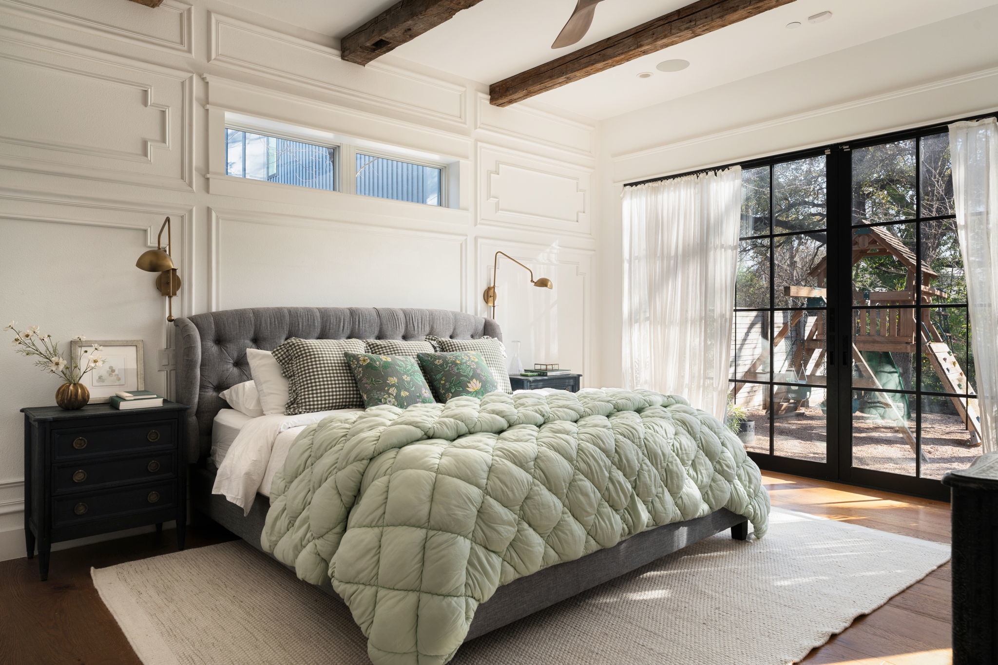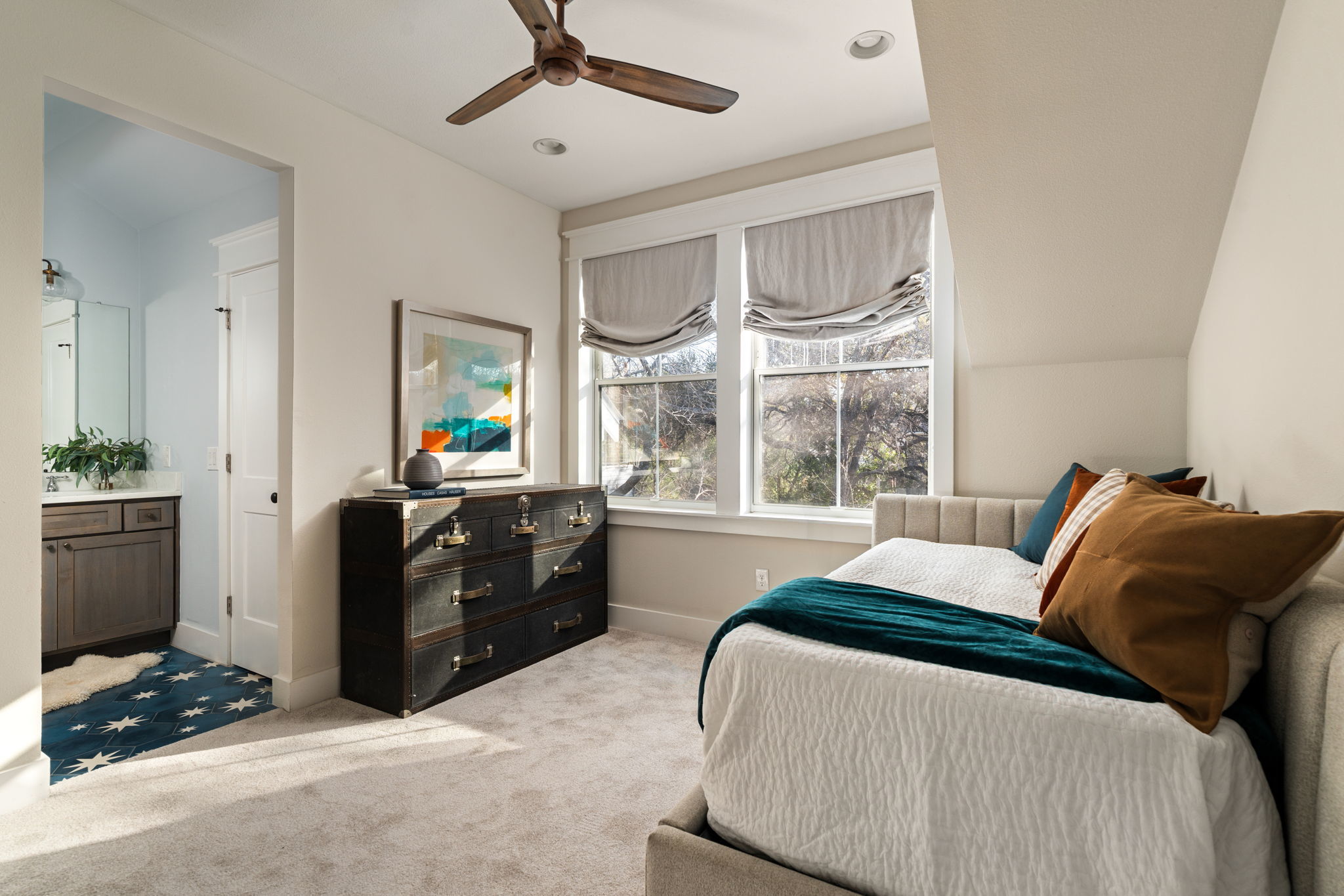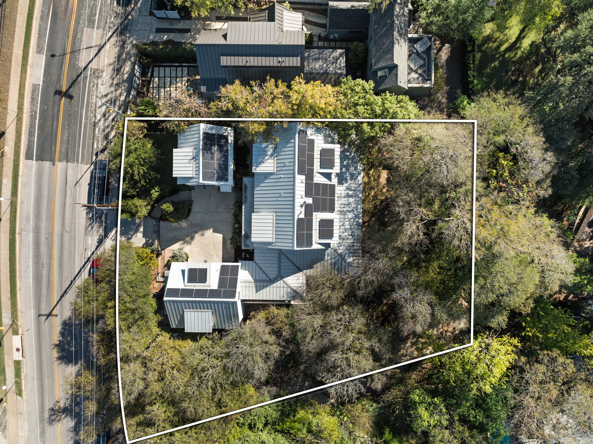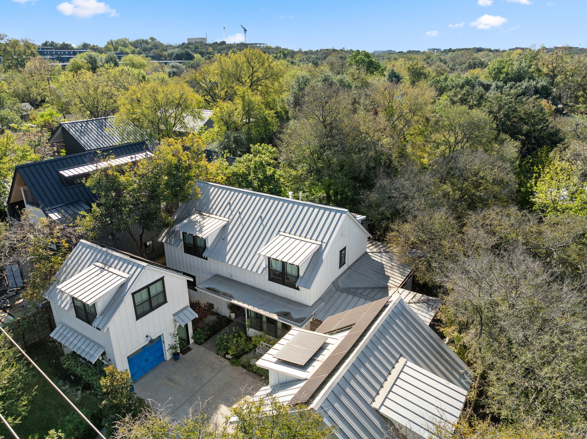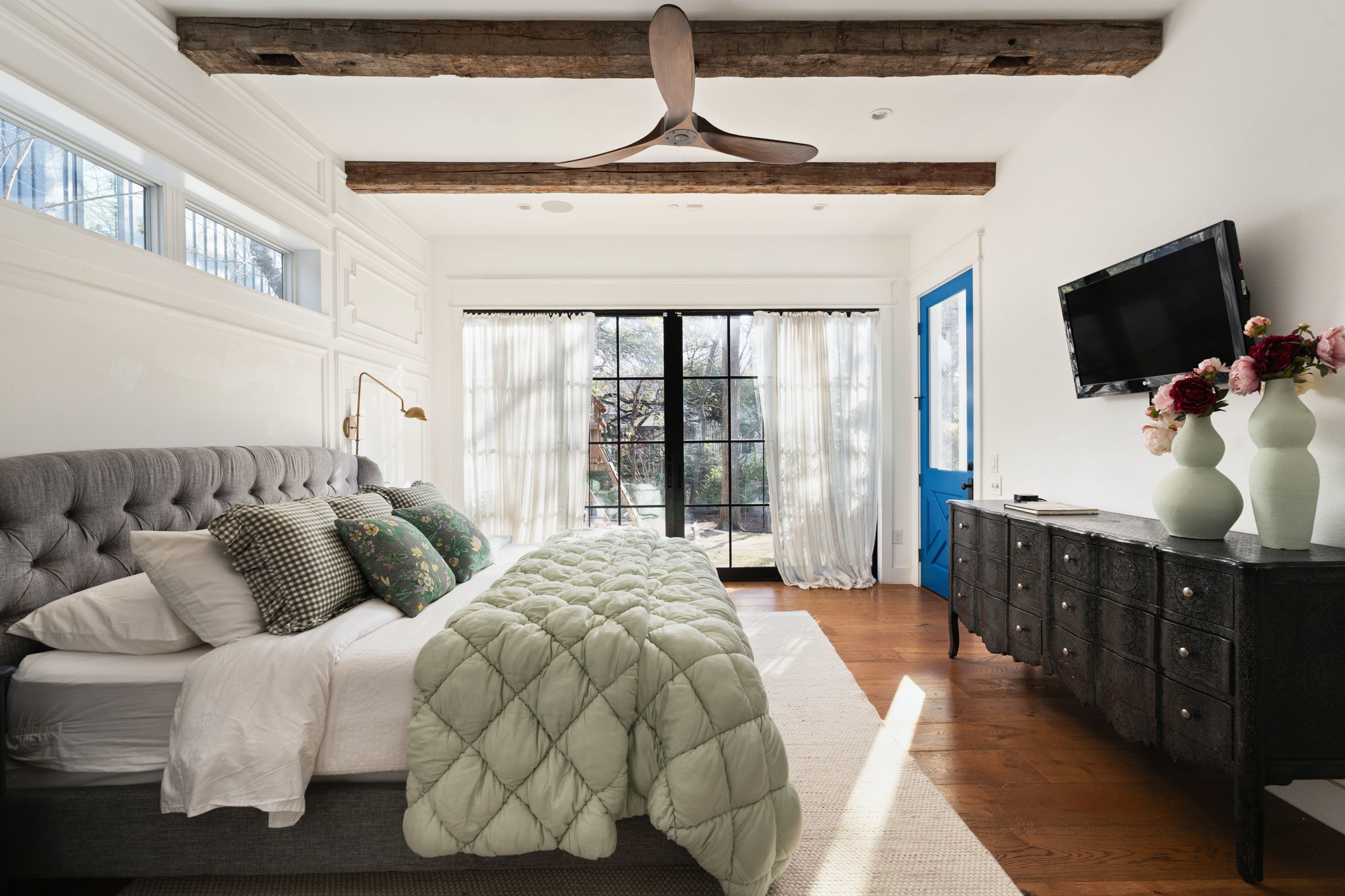 Tucked in the heart of Travis Heights just steps from South Congress, this modern farmhouse feels like a private retreat layered with color, texture, and thoughtful design. A white exterior with blue doors, metal rooflines, and warm wood accents sits behind a gated yard surrounded by lush landscaping, an expansive lawn, flourishing gardens, and a serene creek bed that creates a true urban oasis. Inside, reclaimed Austin shiplap walls and 1800s farmhouse beams add warmth and character throughout. Hardwood floors run across the open living space, anchored by a corner fireplace, custom media cabinetry, and walls of windows framing peaceful backyard views. The kitchen blends charm and high-end function with hand-laid tile flooring, an island crafted from an antique door, and a curated appliance suite including a Wolf induction cooktop, Thermador 6-burner gas range, Miele steam oven, Sub-Zero refrigerator, and drink drawers. Quartz countertops, a wood vent hood, and a classic farmhouse sink complete the space. Accordion windows open to outdoor bar seating, while a screened porch creates seamless indoor-outdoor living. The primary suite features exposed beams, architectural molding, and glass doors overlooking the trees. The spa-like bath— inspired by Hotel Saint Cecilia— showcases bold wallpaper, black-and-white tile, a soaking tub, glass shower, and penny round tile floors. Upstairs, three spacious bedrooms surround a large second living area. A Jack-and-Jill bath features blue star tile floors, quartz counters, and wood vanities, while another bedroom enjoys its own bath with printed tile and soaking tub. A detached guest suite adds flexibility or potential rental income with a kitchenette, full bath, and upstairs bedroom suite. Located directly across from Big Stacy Park and pool with easy access to the Blunn Creek Greenbelt and Lady Bird Lake, this home pairs tranquil creekside living with walkable Travis Heights energy.