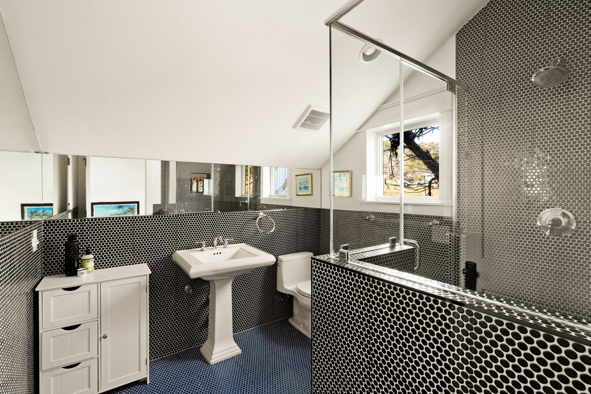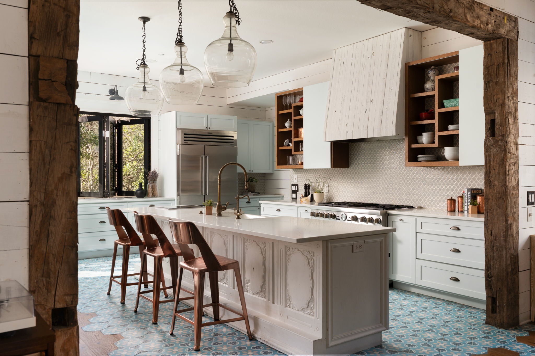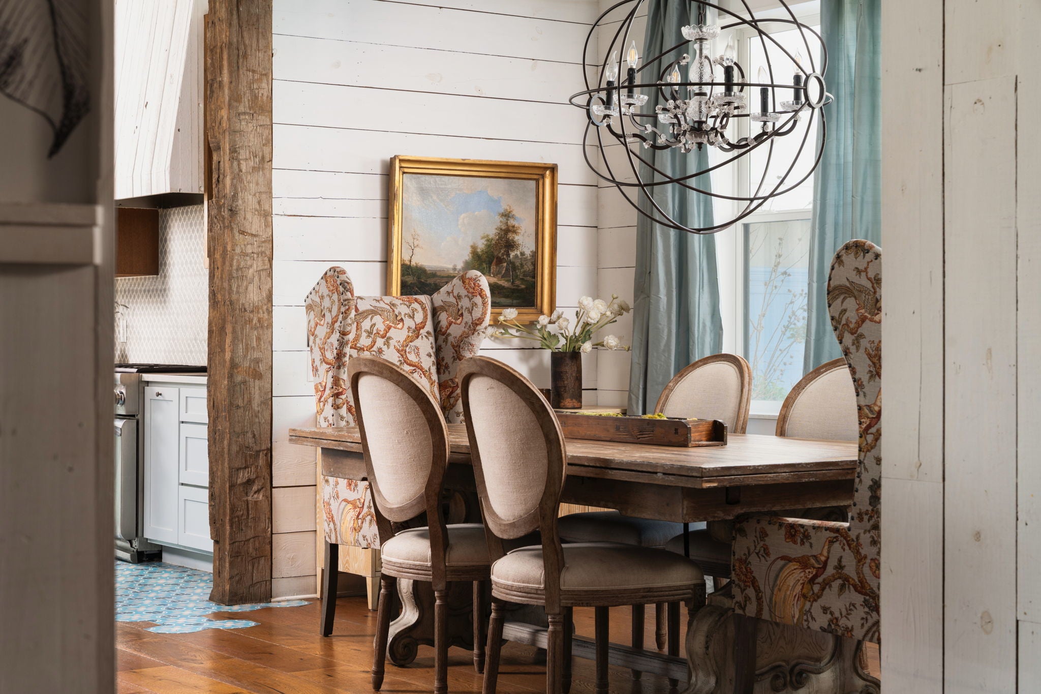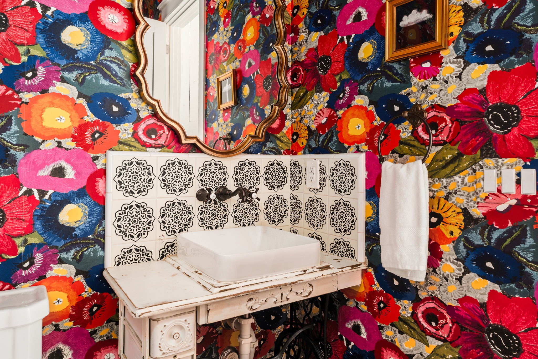 Tucked in the heart of Travis Heights just steps from South Congress, this modern farmhouse feels like a private retreat layered with color, texture, and thoughtful design. A white exterior with blue doors, metal rooflines, and warm wood accents sits behind a gated yard surrounded by lush landscaping, an expansive lawn, flourishing gardens, and a serene creek bed that creates a true urban oasis. Inside, reclaimed Austin shiplap walls and 1800s farmhouse beams add warmth and character throughout. Hardwood floors run across the open living space, anchored by a corner fireplace, custom media cabinetry, and walls of windows framing peaceful backyard views. The kitchen blends charm and high-end function with hand-laid tile flooring, an island crafted from an antique door, and a curated appliance suite including a Wolf induction cooktop, Thermador 6-burner gas range, Miele steam oven, Sub-Zero refrigerator, and drink drawers. Quartz countertops, a wood vent hood, and a classic farmhouse sink complete the space. Accordion windows open to outdoor bar seating, while a screened porch creates seamless indoor-outdoor living. The primary suite features exposed beams, architectural molding, and glass doors overlooking the trees. The spa-like bath— inspired by Hotel Saint Cecilia— showcases bold wallpaper, black-and-white tile, a soaking tub, glass shower, and penny round tile floors. Upstairs, three spacious bedrooms surround a large second living area. A Jack-and-Jill bath features blue star tile floors, quartz counters, and wood vanities, while another bedroom enjoys its own bath with printed tile and soaking tub. A detached guest suite adds flexibility or potential rental income with a kitchenette, full bath, and upstairs bedroom suite. Located directly across from Big Stacy Park and pool with easy access to the Blunn Creek Greenbelt and Lady Bird Lake, this home pairs tranquil creekside living with walkable Travis Heights energy.