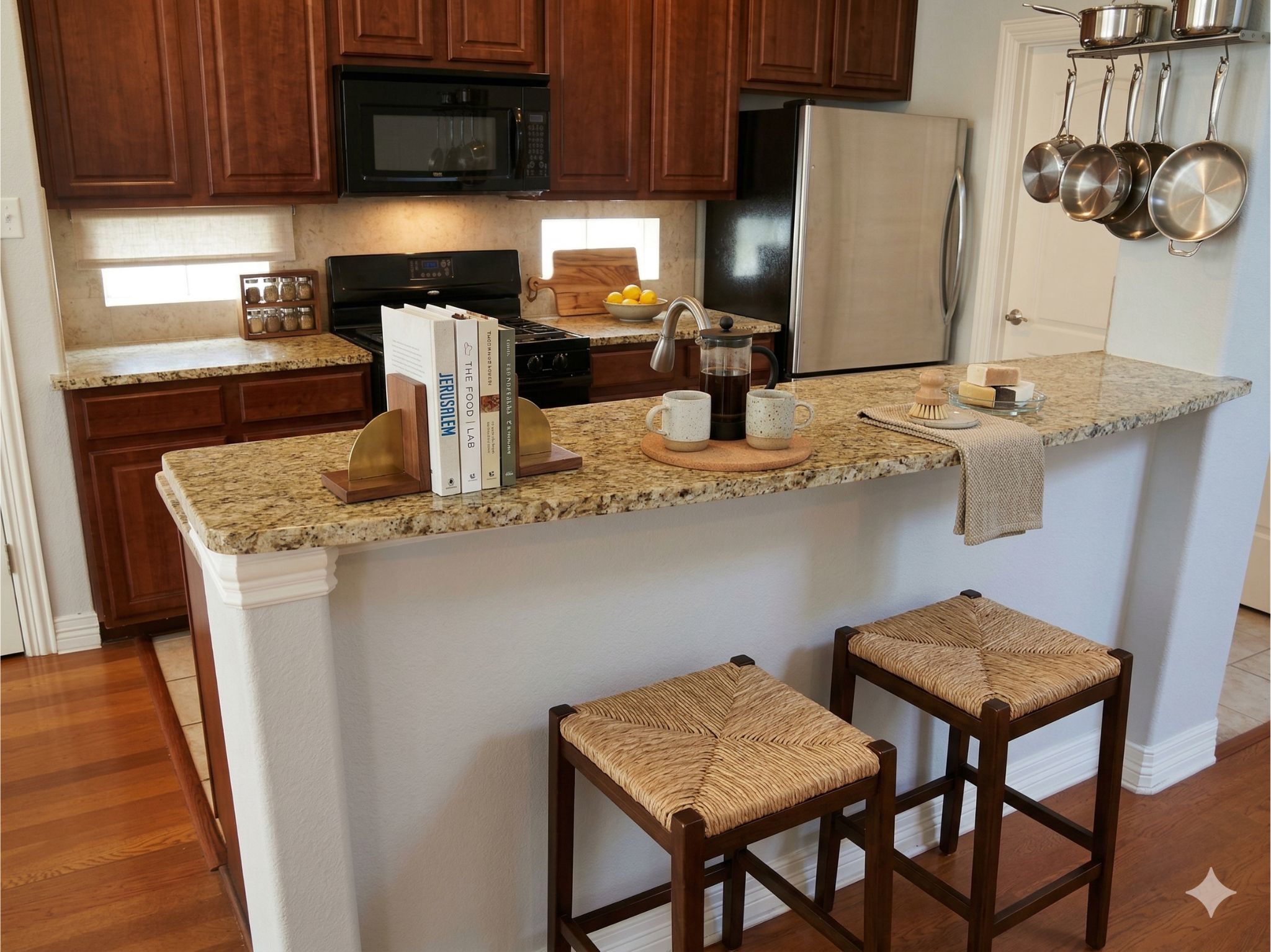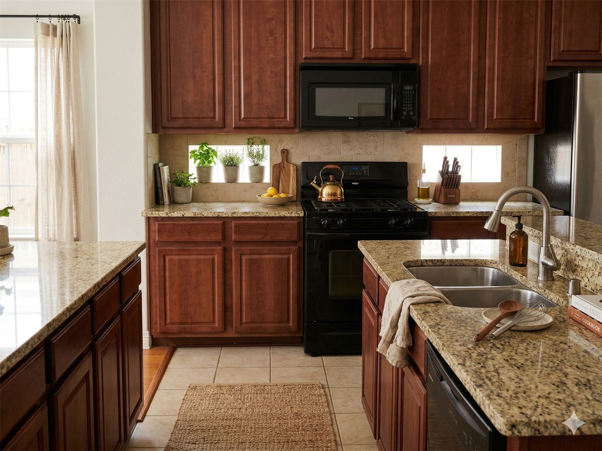 - Dishwasher, Free-Standing Gas Range, Disposal, Microwave, Refrigerator, Self Cleaning Oven