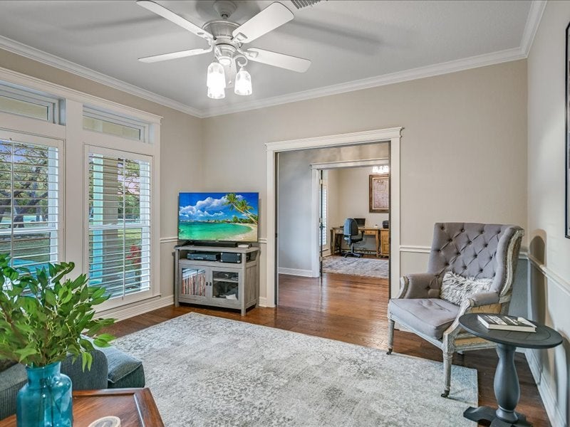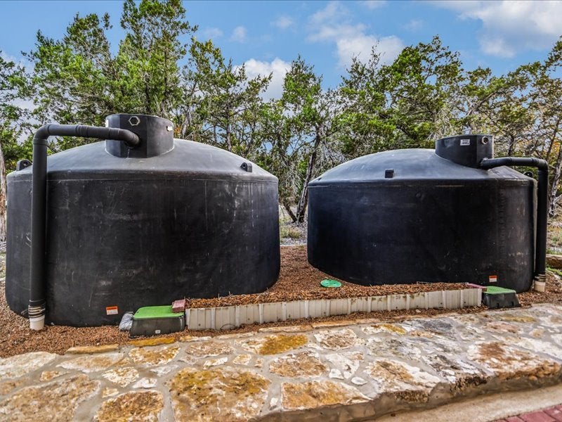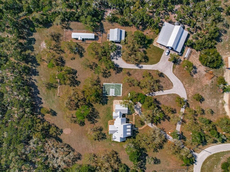 This secluded, gated lot has 3-bedroom, 2.5-bath home with a study offers exceptional privacy with a covered back porch, park-like backyard filled with mature trees, wildlife, and views from the living, breakfast and primary rooms. The gourmet kitchen features Energy Star Thermador appliances, 6 burner gas range with pot filler feature, 2 ovens in the gas range have convection feature, footed cabinetry gives kitchen a custom furniture look, while the spacious primary suite includes his and hers walk-in closets, a shoe rack, a walk-in shower, a separate tub, and a double vanity. The home is equipped with a high-end 4-zone variable-speed Trane HVAC system and includes outdoor amenities such as a basketball/pickleball court and disc golf area. The attached garage has been converted to a workout area. Separate guest quarters provide a full living space with its own bedroom, bathroom, kitchen, dining area, study, and laundry room. A large covered-garage area next to the guest quarters houses a 17' covered RV space with full hook-up along with plenty of room for farm equipment and parking. Dog wash station and separate quiet zone for animals at back of home. Conveniently located near Belterra Village, the property offers quick access to restaurants, breweries, wineries, distilleries, two H-E-B stores, Home Depot, McCoy’s, healthcare and other local services. For full set of features contact agent.