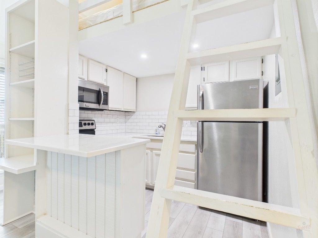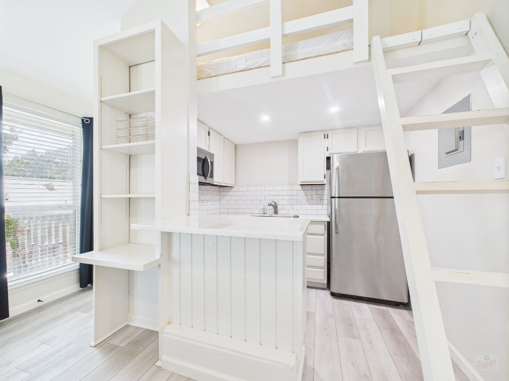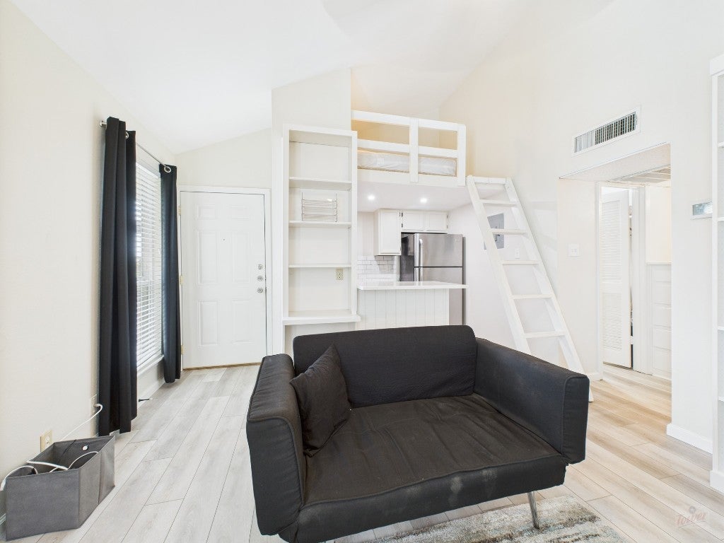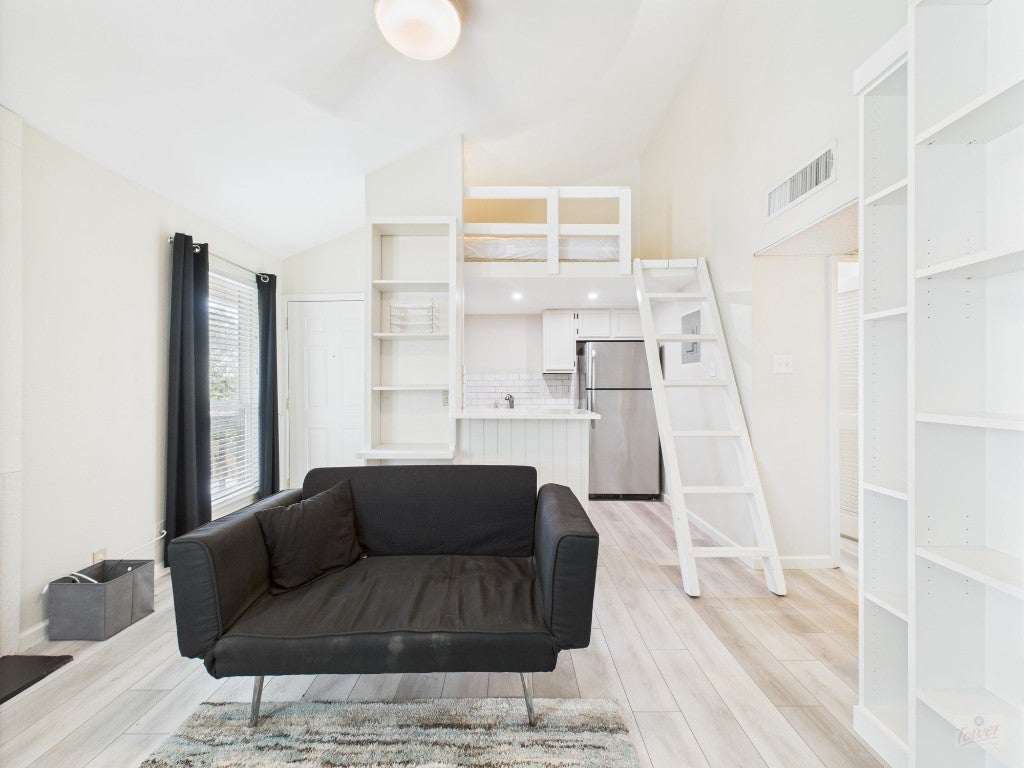 Renovated condo with loft in nice location in West campus. Luxury vinyl flooring throughout, modern kitchen with quartz countertops and stainless steel appliances, and a custom Murphy bed with built-in shelving. Theres a large closet for storage and a loft, accessible by ladder, that works as an extra sleeping or living space. Three large windows bring in plenty of natural light, keeping the space open and inviting. Comes furnished with beds, bookshelf, and dining table/chairs. Water, wastewater, trash, and parking included with rent. Community laundry room and well maintained pool. Available for the 2026-2027 school year!