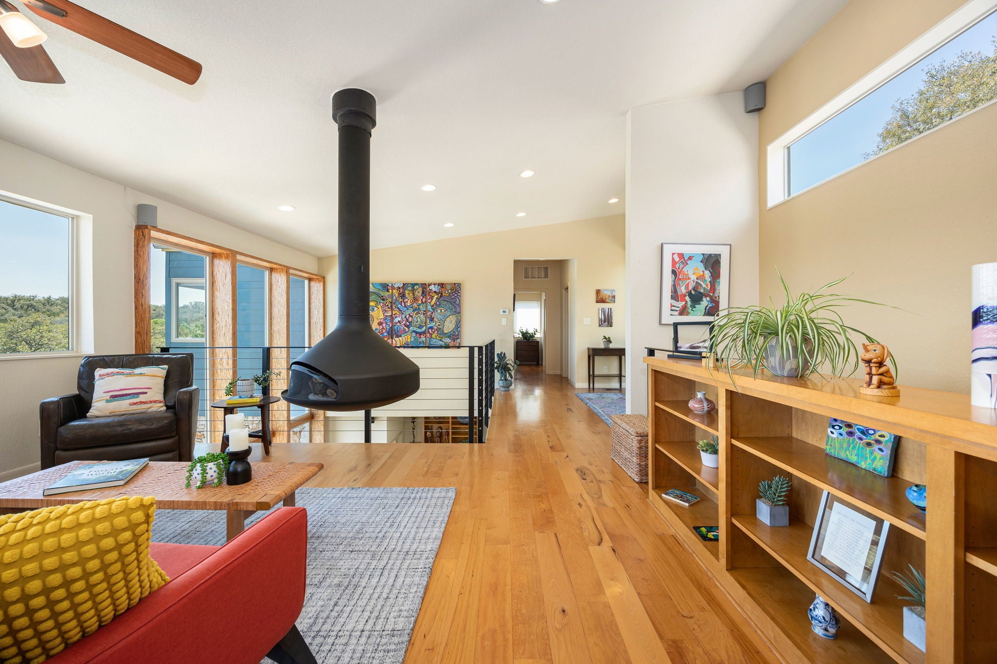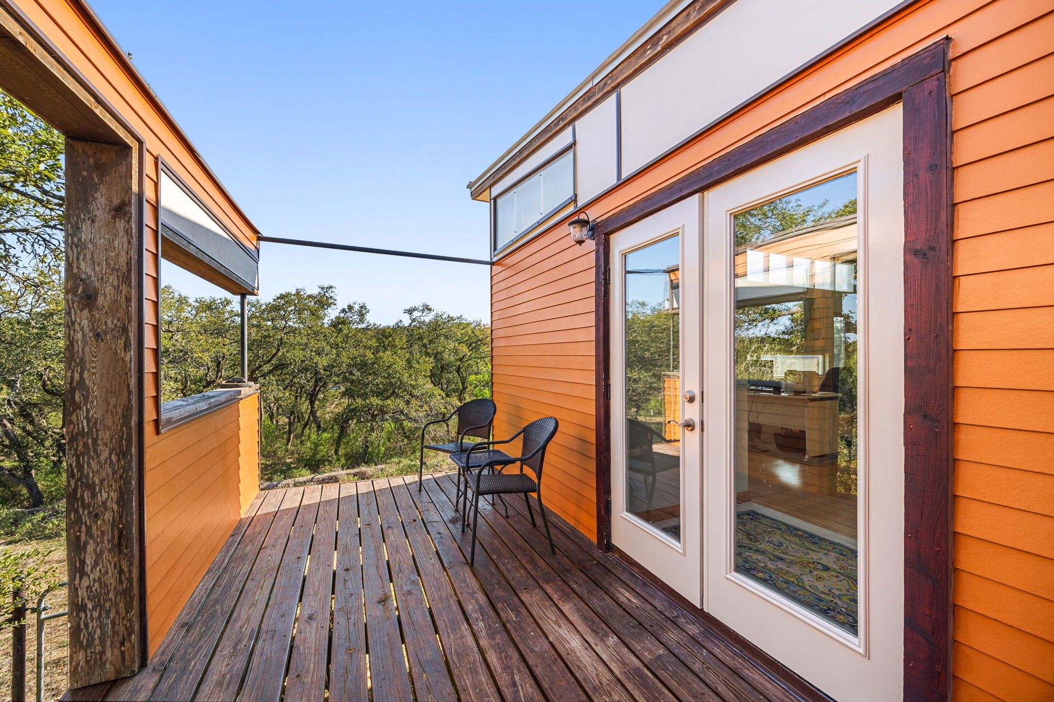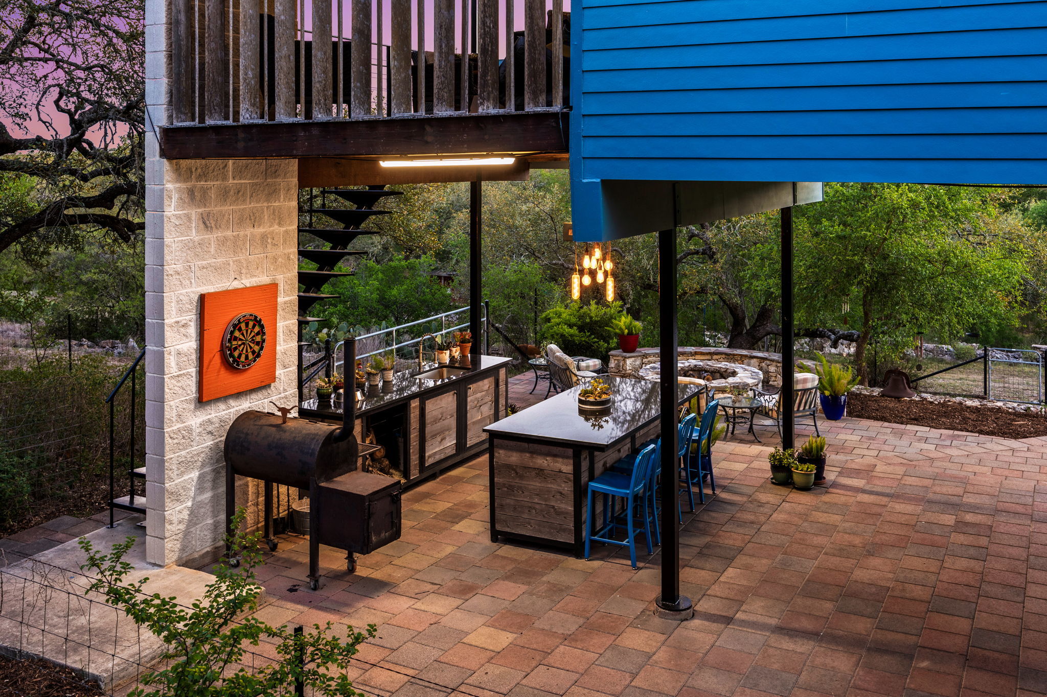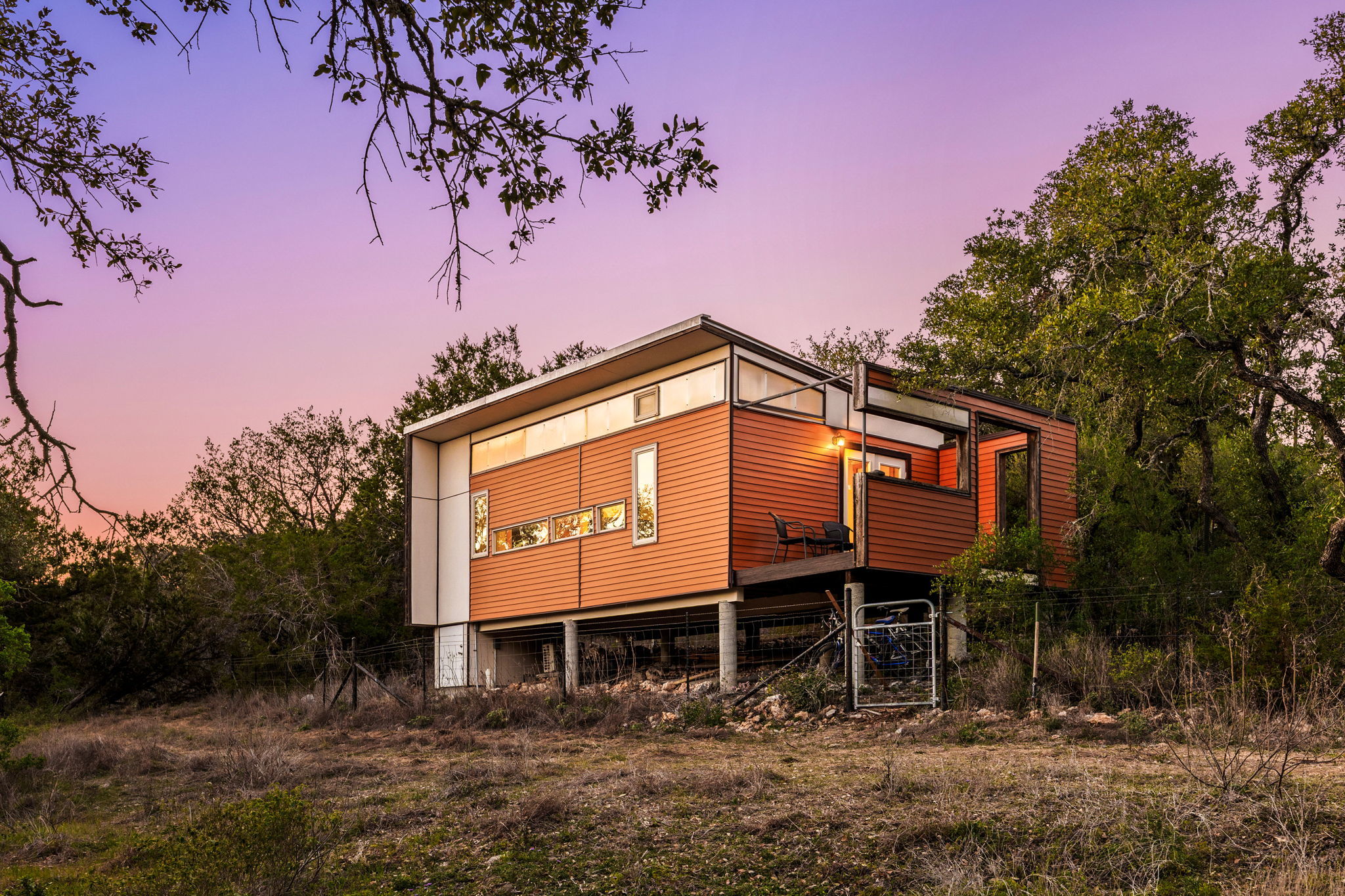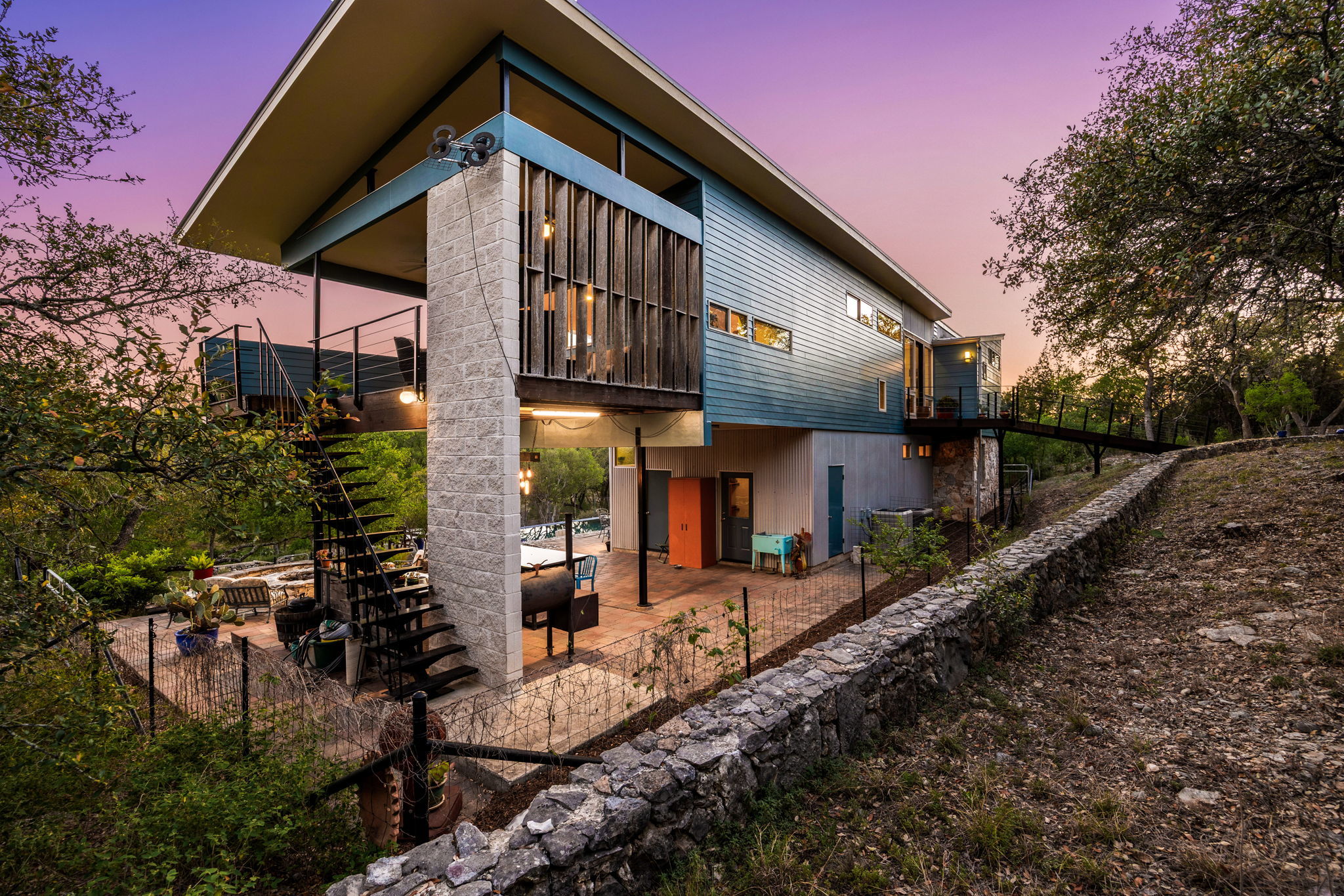 Discover a truly one-of-a-kind residence between Wimberley and San Marcos, thoughtfully designed by A. Gruppo Architects to blend with the natural beauty of the Texas Hill Country. This property consists of a stunning custom main home and guest house. The main home offers 3 bedrooms and 2 full baths, 2 half baths, while the guest home offers a large room, kitchenette and a full bathroom. Showcasing a modern yet organic aesthetic with warm wood flooring, custom built-ins, and inviting, open spaces. Floor-to-ceiling windows fill the homes with natural light, enhancing the open-concept layout and seamless indoor-outdoor connection. The spacious kitchen in the main house features a recycled glass countertop and flows into multiple living and dining areas, ideal for entertaining or everyday living. Positioned to complement the land’s topography, the main living spaces and entry sit on the upper level to maximize privacy and capture sweeping Hill Country views. The dramatic double-height family room frames breathtaking hillside vistas through expansive glass. Southern exposure is optimized for passive solar heating in winter, while deep overhangs provide shade in summer for year-round efficiency. Sustainability is central, passive cooling, attic ventilation, and a high-efficiency HVAC system. A massive 27,000-gallon rainwater collection system supplies 100% of the homes' water. Which has never needed supplemental replenishment from other outside sources. Set on a fully fenced, ag-exempt 15+ acres, this private and secluded property offers no HOA and exceptional outdoor features, including native stone walls, mature live oaks, a sparkling in-ground pool, and versatile barns. Enjoy a covered patio and upper-level balcony with panoramic views, plus a guest house perfect for visitors, a workspace, or potential rental income. Conveniently located just minutes from Wimberley and San Marcos, this is a rare opportunity to own a distinctive Hill Country retreat.
