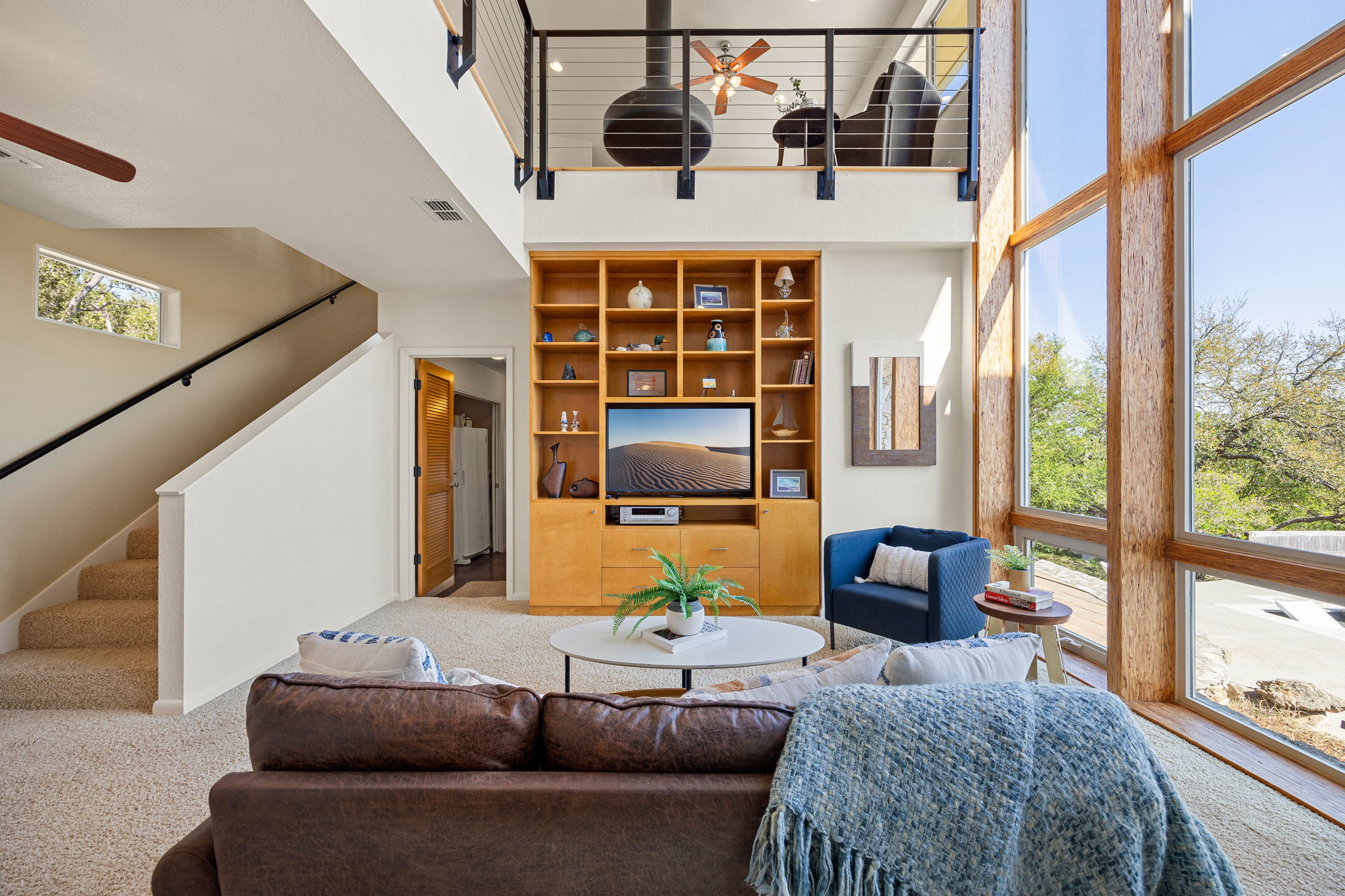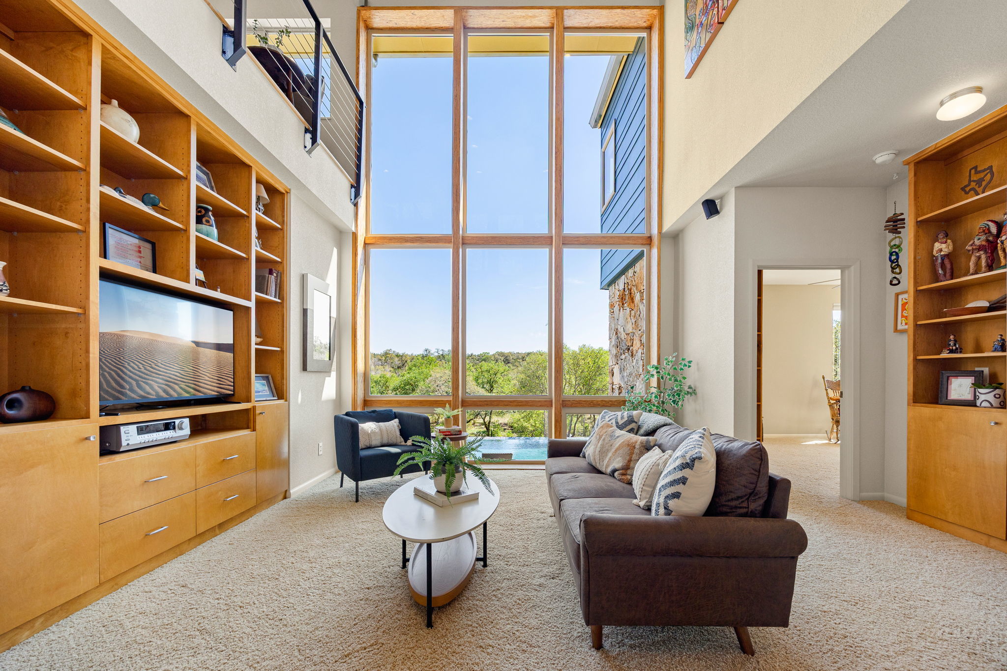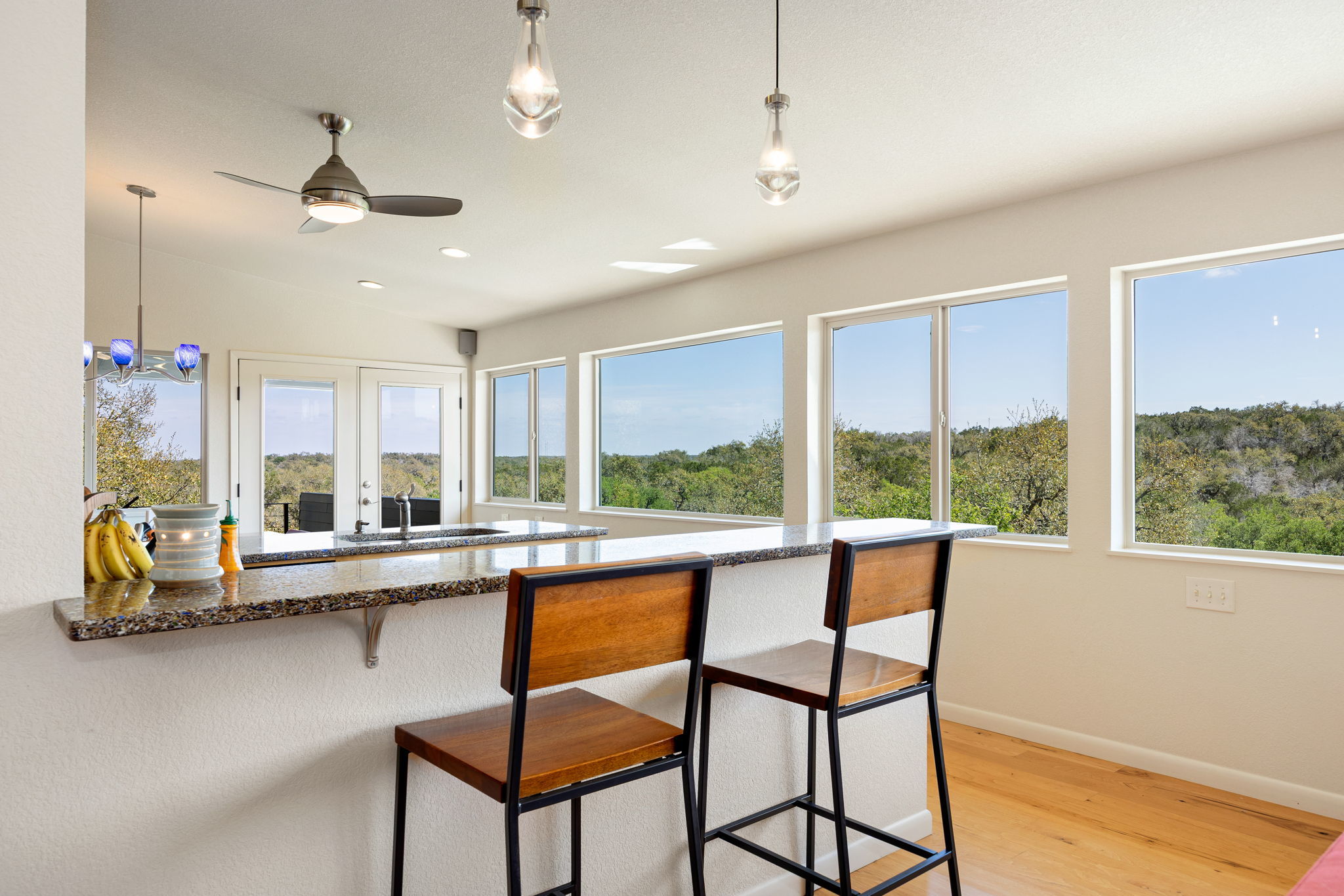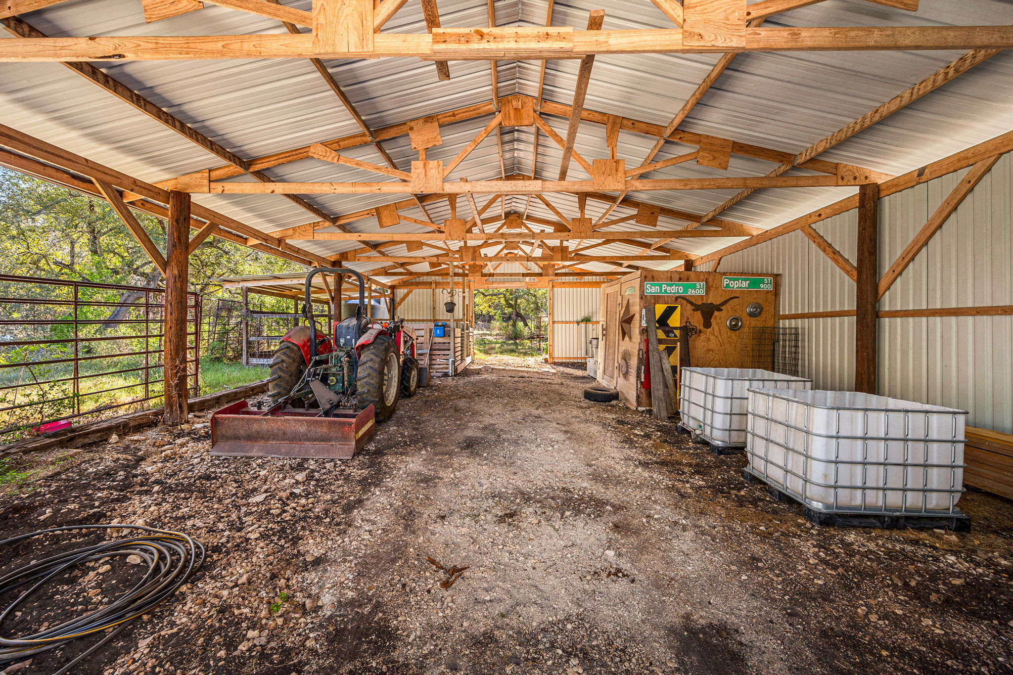 Discover a truly one-of-a-kind residence between Wimberley and San Marcos, thoughtfully designed by A. Gruppo Architects to blend with the natural beauty of the Texas Hill Country. This property consists of a stunning custom main home and guest house. The main home offers 3 bedrooms and 2 full baths, 2 half baths, while the guest home offers a large room, kitchenette and a full bathroom. Showcasing a modern yet organic aesthetic with warm wood flooring, custom built-ins, and inviting, open spaces. Floor-to-ceiling windows fill the homes with natural light, enhancing the open-concept layout and seamless indoor-outdoor connection. The spacious kitchen in the main house features a recycled glass countertop and flows into multiple living and dining areas, ideal for entertaining or everyday living. Positioned to complement the land’s topography, the main living spaces and entry sit on the upper level to maximize privacy and capture sweeping Hill Country views. The dramatic double-height family room frames breathtaking hillside vistas through expansive glass. Southern exposure is optimized for passive solar heating in winter, while deep overhangs provide shade in summer for year-round efficiency. Sustainability is central, passive cooling, attic ventilation, and a high-efficiency HVAC system. A massive 27,000-gallon rainwater collection system supplies 100% of the homes' water. Which has never needed supplemental replenishment from other outside sources. Set on a fully fenced, ag-exempt 15+ acres, this private and secluded property offers no HOA and exceptional outdoor features, including native stone walls, mature live oaks, a sparkling in-ground pool, and versatile barns. Enjoy a covered patio and upper-level balcony with panoramic views, plus a guest house perfect for visitors, a workspace, or potential rental income. Conveniently located just minutes from Wimberley and San Marcos, this is a rare opportunity to own a distinctive Hill Country retreat.