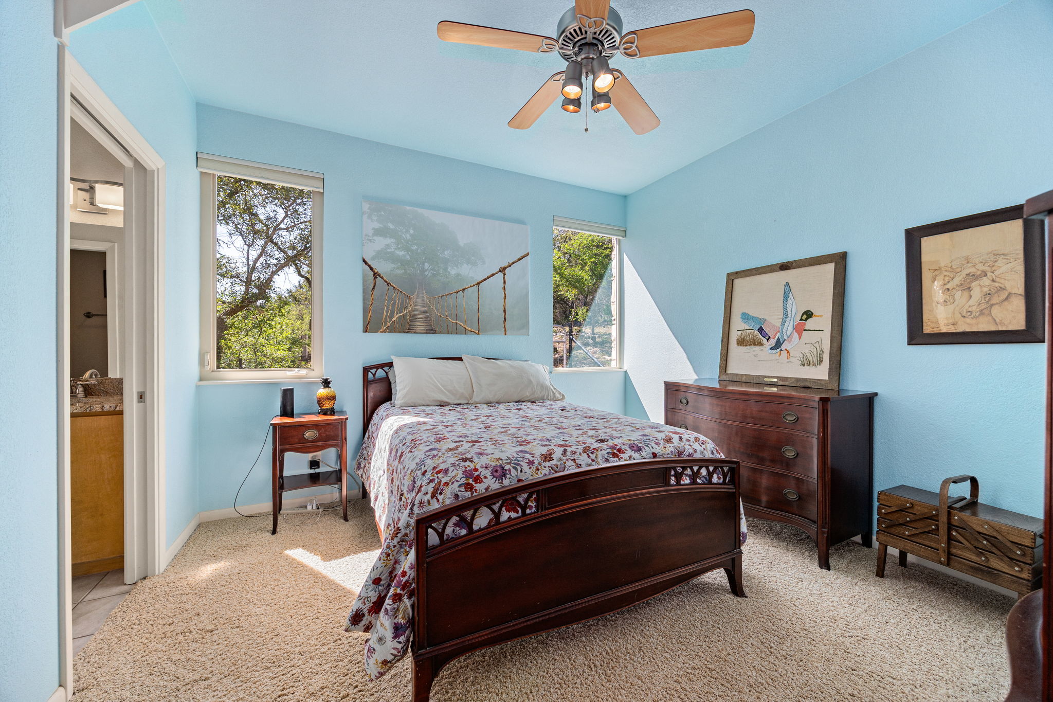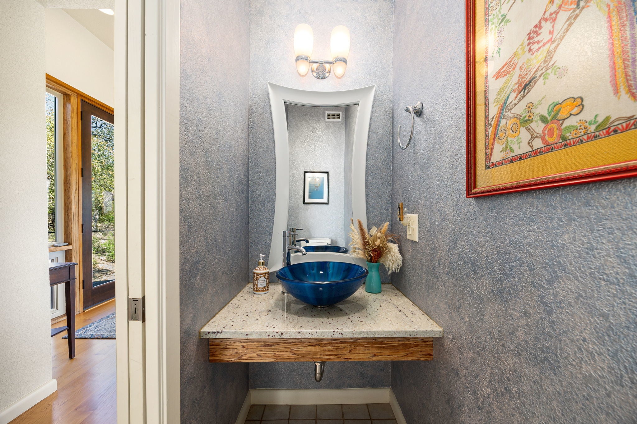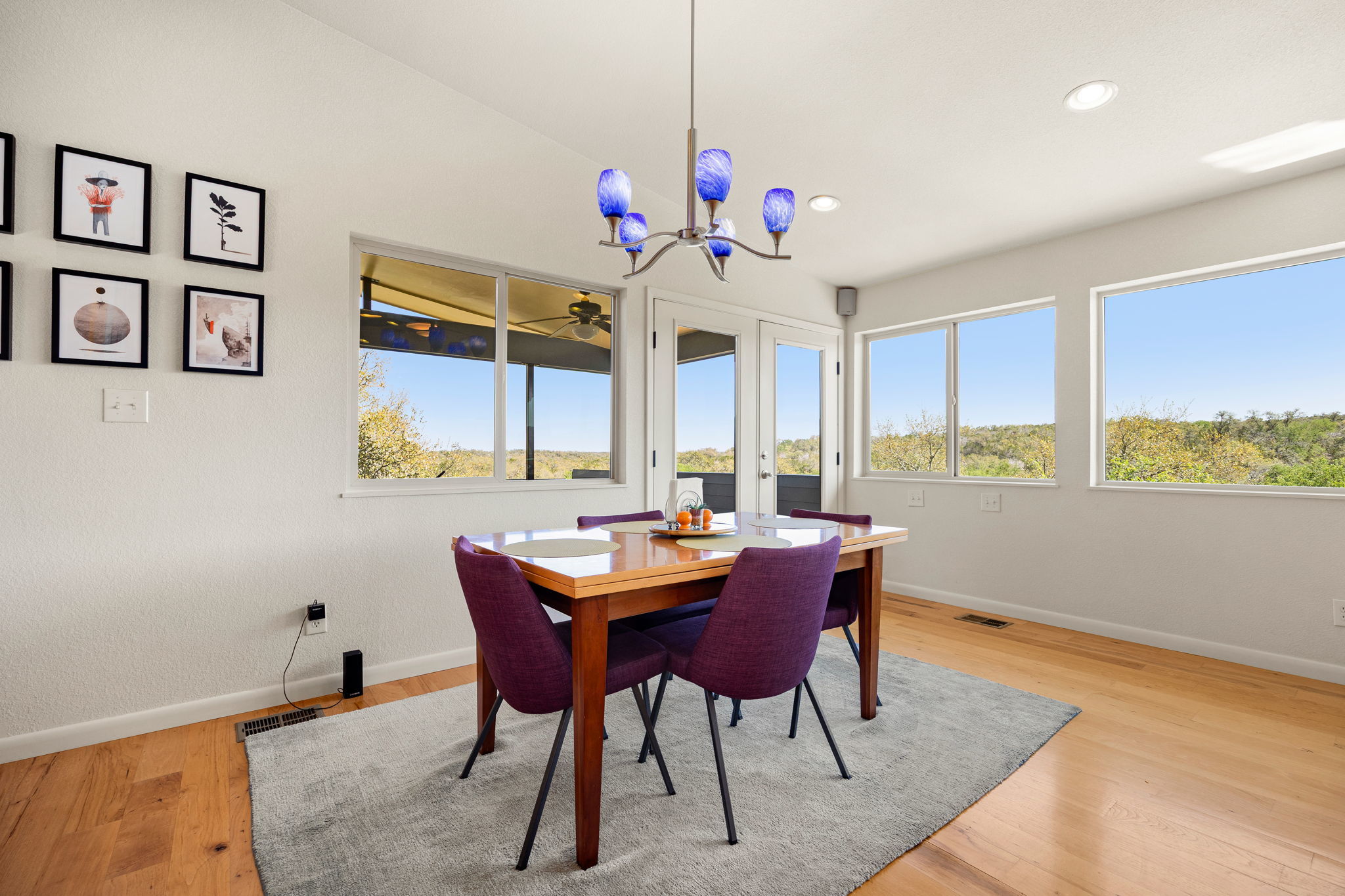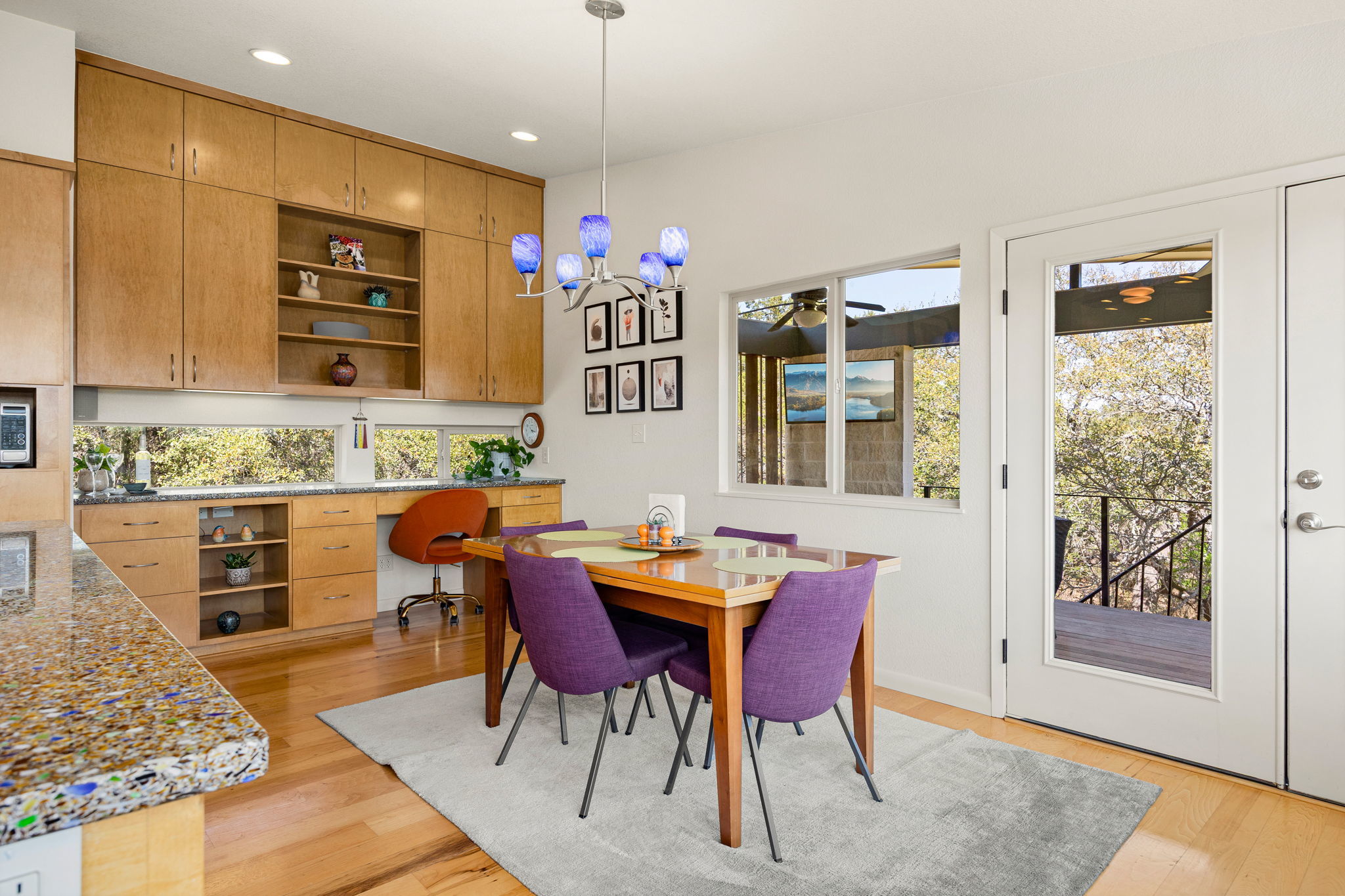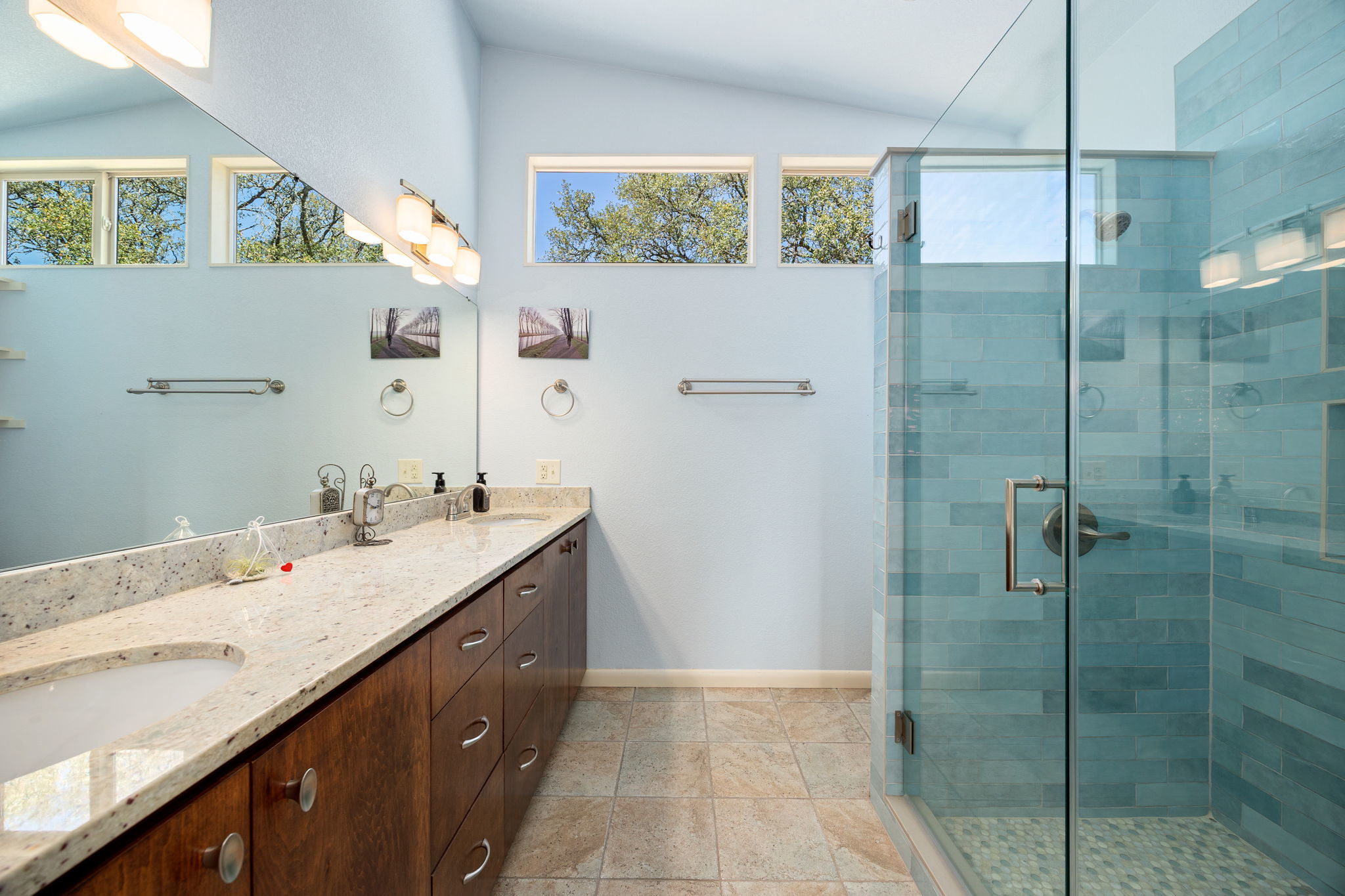 Discover a truly one-of-a-kind residence between Wimberley and San Marcos, thoughtfully designed by A. Gruppo Architects to blend with the natural beauty of the Texas Hill Country. This property consists of a stunning custom main home and guest house. The main home offers 3 bedrooms and 2 full baths, 2 half baths, while the guest home offers a large room, kitchenette and a full bathroom. Showcasing a modern yet organic aesthetic with warm wood flooring, custom built-ins, and inviting, open spaces. Floor-to-ceiling windows fill the homes with natural light, enhancing the open-concept layout and seamless indoor-outdoor connection. The spacious kitchen in the main house features a recycled glass countertop and flows into multiple living and dining areas, ideal for entertaining or everyday living. Positioned to complement the land’s topography, the main living spaces and entry sit on the upper level to maximize privacy and capture sweeping Hill Country views. The dramatic double-height family room frames breathtaking hillside vistas through expansive glass. Southern exposure is optimized for passive solar heating in winter, while deep overhangs provide shade in summer for year-round efficiency. Sustainability is central, passive cooling, attic ventilation, and a high-efficiency HVAC system. A massive 27,000-gallon rainwater collection system supplies 100% of the homes' water. Which has never needed supplemental replenishment from other outside sources. Set on a fully fenced, ag-exempt 15+ acres, this private and secluded property offers no HOA and exceptional outdoor features, including native stone walls, mature live oaks, a sparkling in-ground pool, and versatile barns. Enjoy a covered patio and upper-level balcony with panoramic views, plus a guest house perfect for visitors, a workspace, or potential rental income. Conveniently located just minutes from Wimberley and San Marcos, this is a rare opportunity to own a distinctive Hill Country retreat.