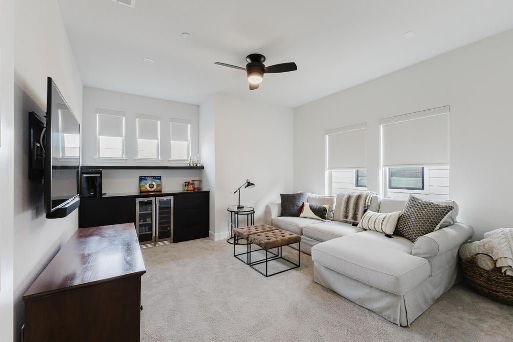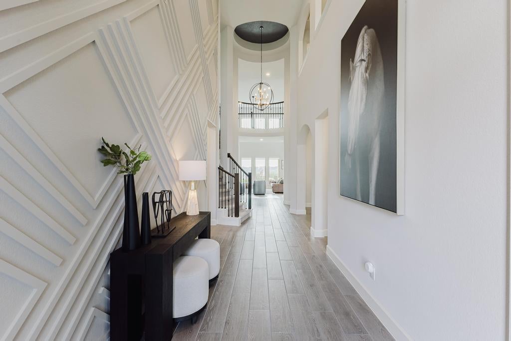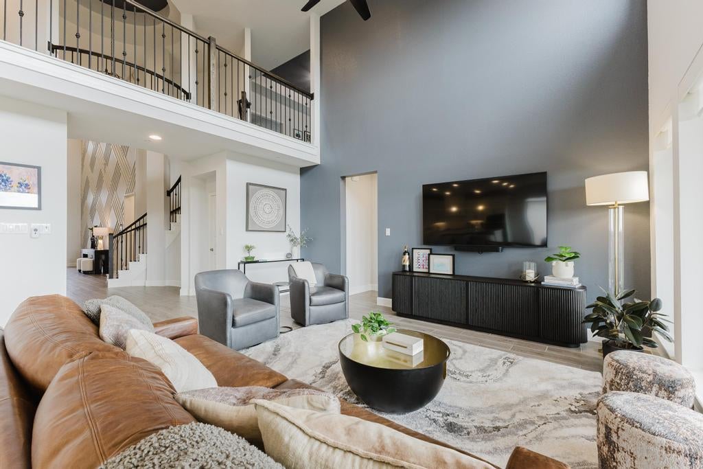 Welcome home to a showstopper entry—an elegant two-story foyer with a sweeping circular staircase sets the tone the moment you walk in. A private home office with French doors makes working from home a breeze. The soaring two-story family room flows seamlessly into the island kitchen and sunlit morning area, creating an ideal space for everyday living and entertaining. You’ll love the storage: a large pantry plus a Butler’s pantry for effortless hosting and extra organization. The downstairs primary suite is a true retreat, highlighted by a dramatic curved wall of windows. The spa-like primary bath offers a double vanity, relaxing garden tub, and separate glass-enclosed shower, plus a generously sized closet with abundant shelving. Upstairs, enjoy flexible entertaining space with a spacious game room and adjoining media room—perfect for movie nights. A convenient mud room just off the three-car garage adds everyday functionality to this beautifully designed home.