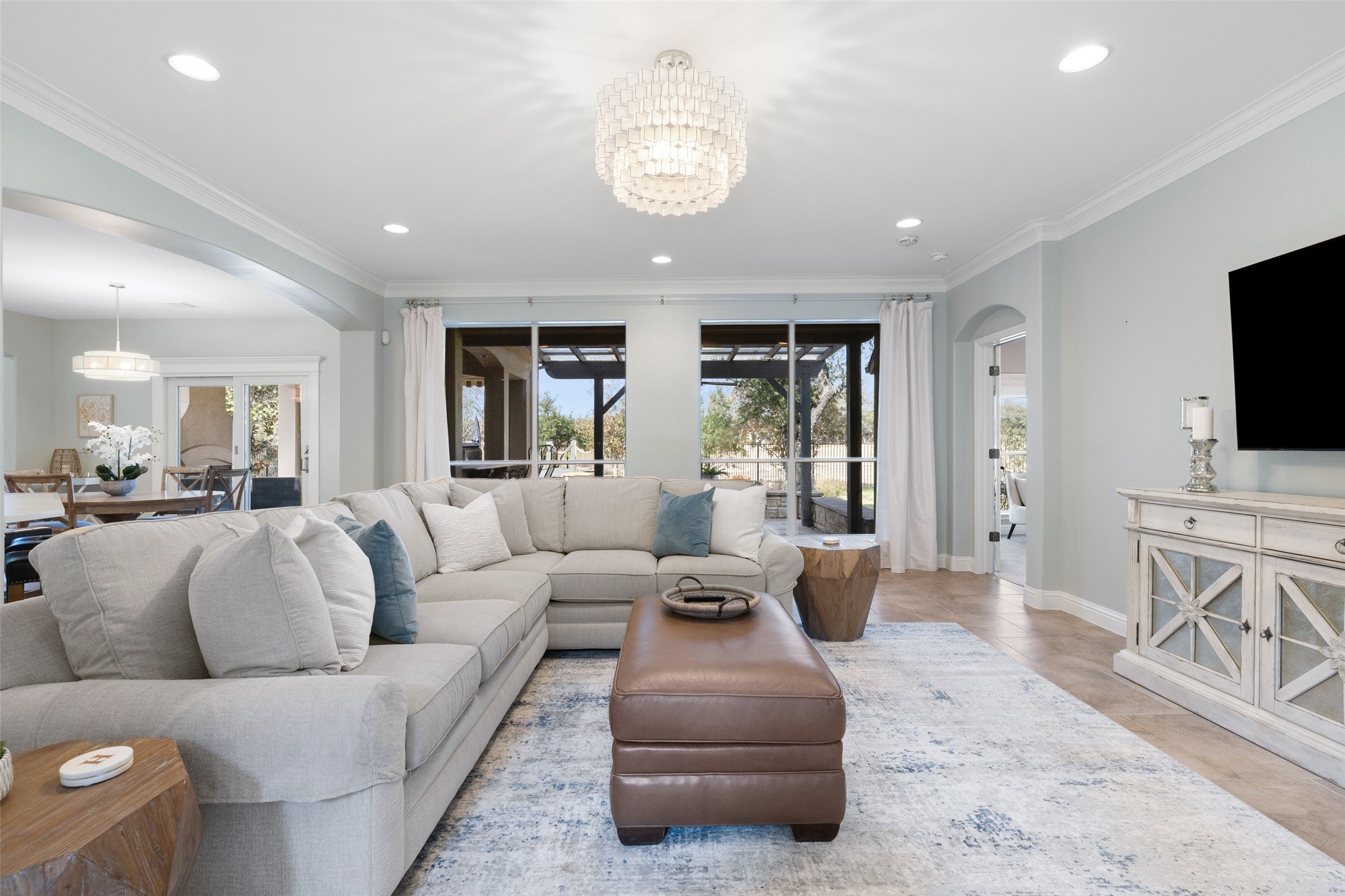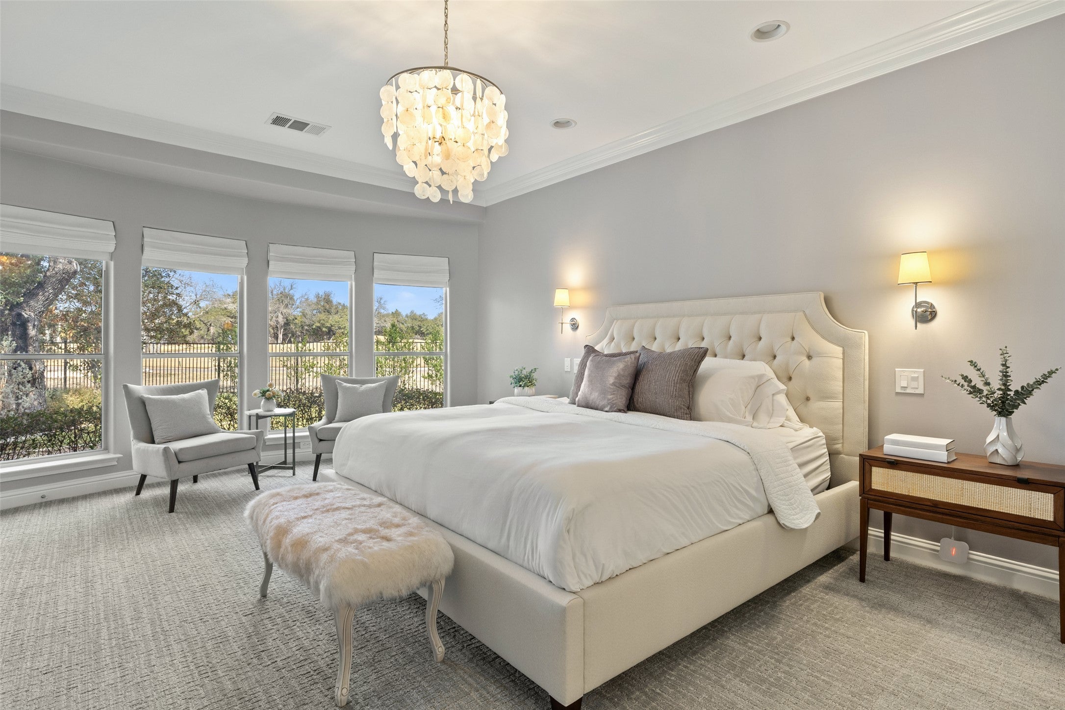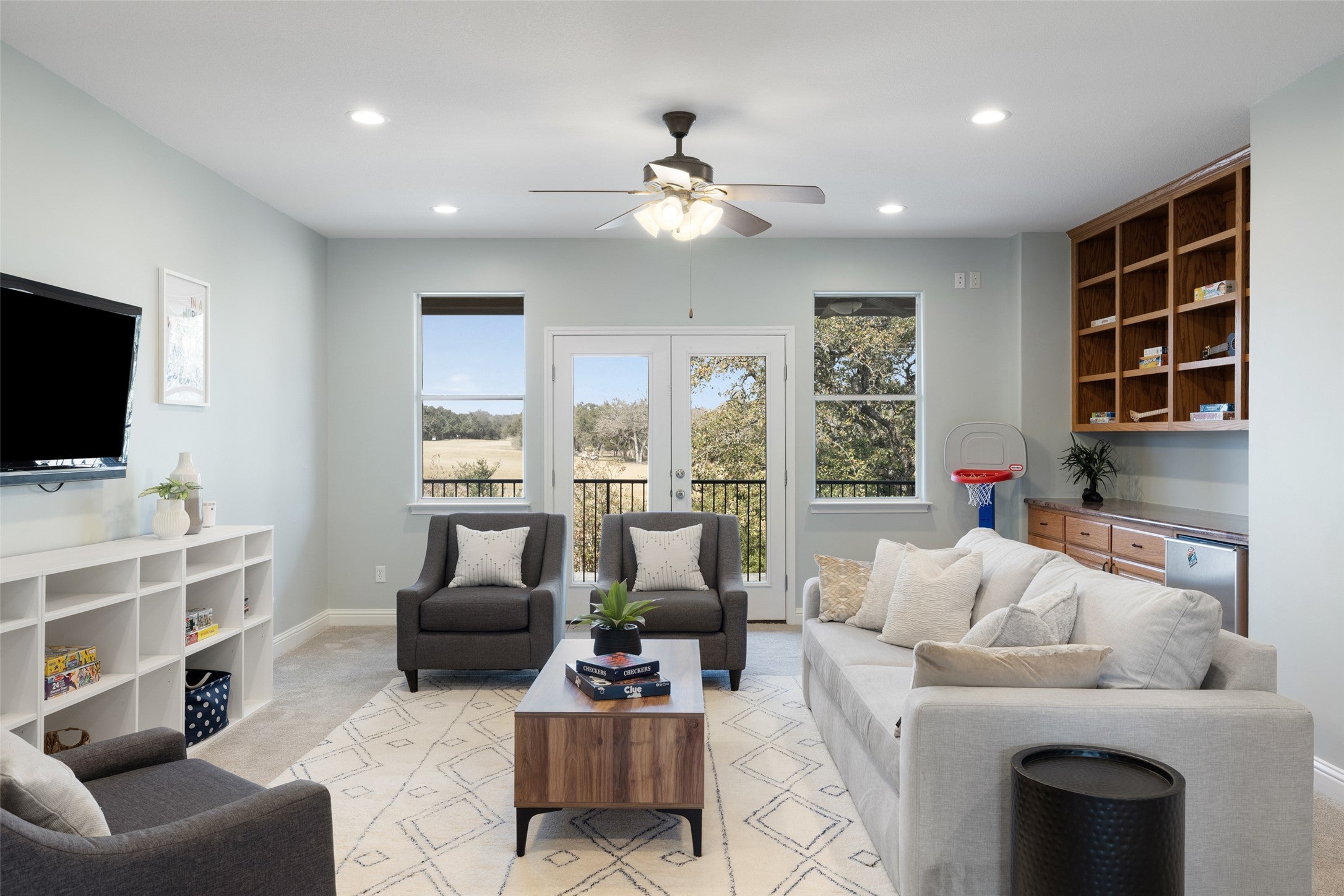 It is rare to find this level of privacy, space, and golf course frontage in one property. Tucked away on a quiet cul-de-sac and spanning nearly 4,700 square feet, this five bedroom home backs directly to the 6th tee of Grey Rock, offering peaceful views and an expansive backyard designed for poolside gatherings and quiet evenings outdoors. Inside, extensive renovations bring a fresh, inviting feel throughout. At the center of the home, the fully remodeled kitchen is where everything naturally comes together. Outfitted with GE Monogram Professional appliances including three ovens and a built in refrigerator, quartz countertops, a farmhouse sink, prep sink, pot filler, an oversized island, and custom pull out storage, the space is designed to host with ease while still feeling inviting for everyday life. The kitchen opens seamlessly to the main living areas, where large windows draw your eye to the backyard and pool. Outdoor living extends effortlessly with a covered patio, fireplace, built in kitchen, and pergola shaded dining area. The pool and spa anchor the yard, complete with a dramatic bridge separating the beach entry from the deep end. Beyond the pool, generous lawn space offers room for games, pets, and gatherings of all sizes. The primary suite is a true retreat, tucked away on the main level, with a completely renovated spa style bath featuring custom cabinetry, designer lighting, and a double shower. Also on the first floor, a dedicated guest suite and a soundproof office with built ins provide comfort and functionality. Upstairs, a large game room and separate media room offer additional living space, along with three secondary bedrooms, including one with a private bath and two connected by a fully remodeled Jack and Jill. Located in the gated Muirfield section of Circle C, residents enjoy access to community pools, trails, parks, golf, shops, restaurants, and highly regarded schools. This is a place you will want to stay awhile.