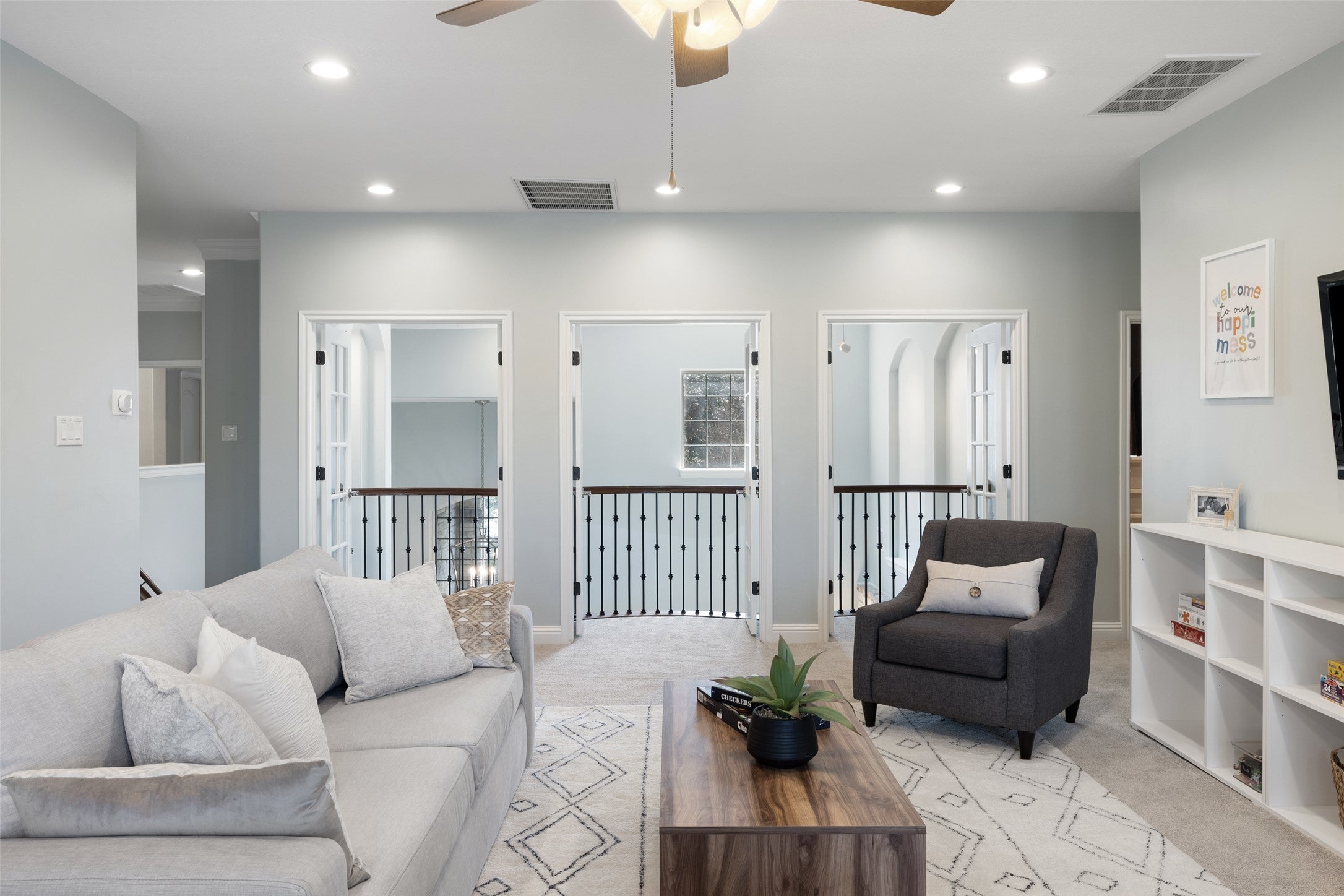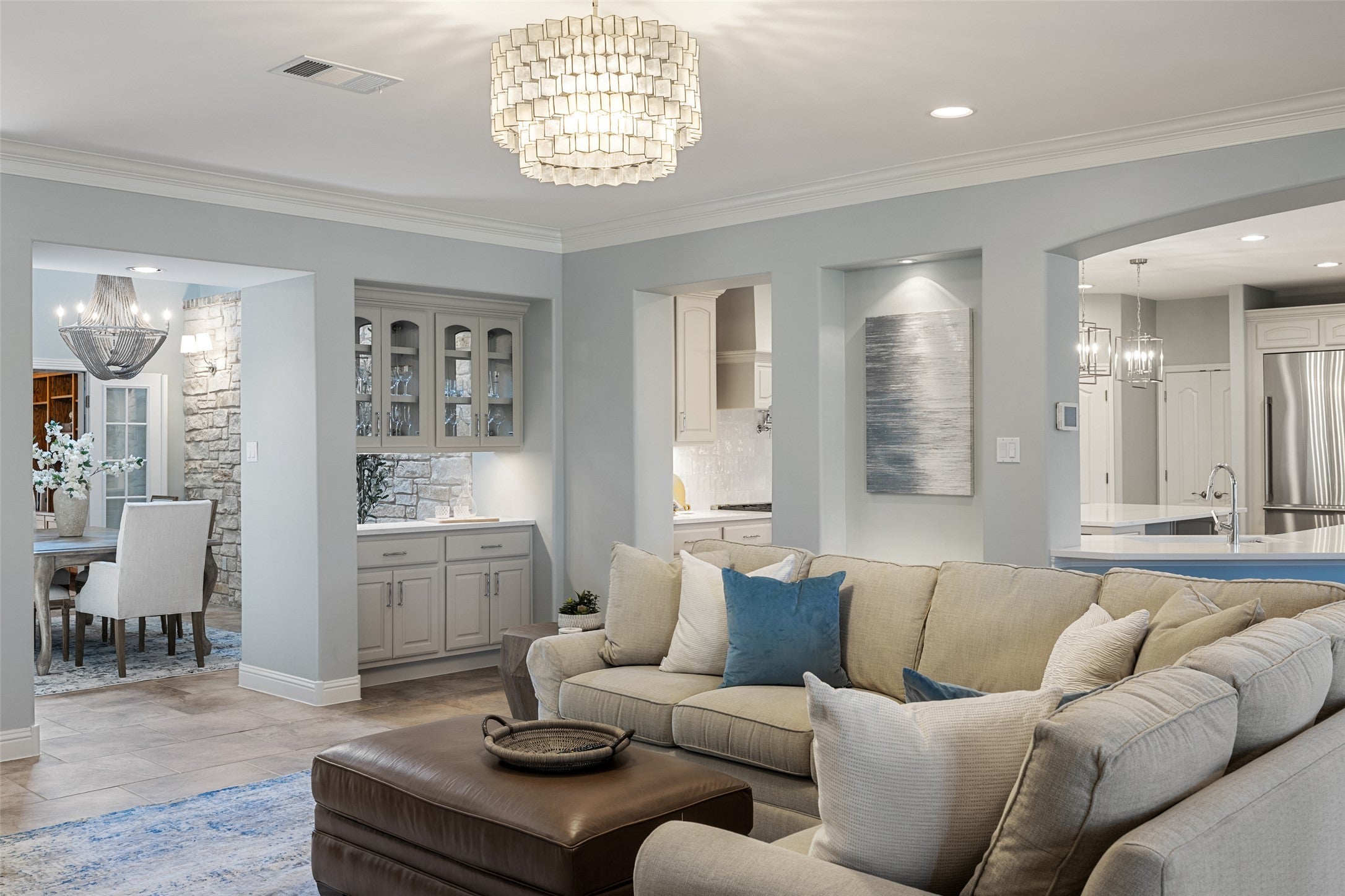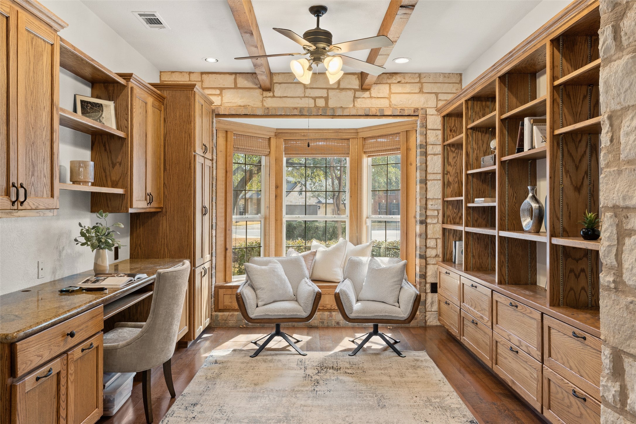 It is rare to find this level of privacy, space, and golf course frontage in one property. Tucked away on a quiet cul-de-sac and spanning nearly 4,700 square feet, this five bedroom home backs directly to the 6th tee of Grey Rock, offering peaceful views and an expansive backyard designed for poolside gatherings and quiet evenings outdoors. Inside, extensive renovations bring a fresh, inviting feel throughout. At the center of the home, the fully remodeled kitchen is where everything naturally comes together. Outfitted with GE Monogram Professional appliances including three ovens and a built in refrigerator, quartz countertops, a farmhouse sink, prep sink, pot filler, an oversized island, and custom pull out storage, the space is designed to host with ease while still feeling inviting for everyday life. The kitchen opens seamlessly to the main living areas, where large windows draw your eye to the backyard and pool. Outdoor living extends effortlessly with a covered patio, fireplace, built in kitchen, and pergola shaded dining area. The pool and spa anchor the yard, complete with a dramatic bridge separating the beach entry from the deep end. Beyond the pool, generous lawn space offers room for games, pets, and gatherings of all sizes. The primary suite is a true retreat, tucked away on the main level, with a completely renovated spa style bath featuring custom cabinetry, designer lighting, and a double shower. Also on the first floor, a dedicated guest suite and a soundproof office with built ins provide comfort and functionality. Upstairs, a large game room and separate media room offer additional living space, along with three secondary bedrooms, including one with a private bath and two connected by a fully remodeled Jack and Jill. Located in the gated Muirfield section of Circle C, residents enjoy access to community pools, trails, parks, golf, shops, restaurants, and highly regarded schools. This is a place you will want to stay awhile.