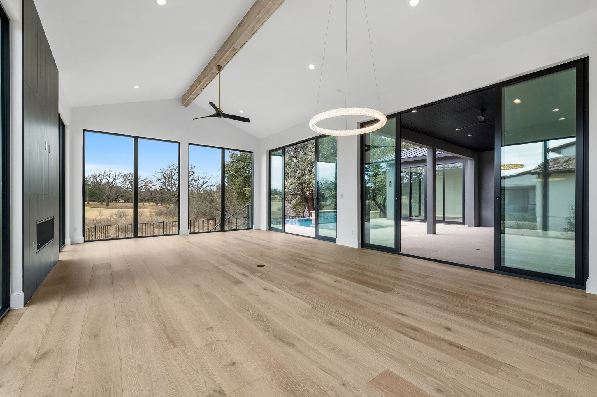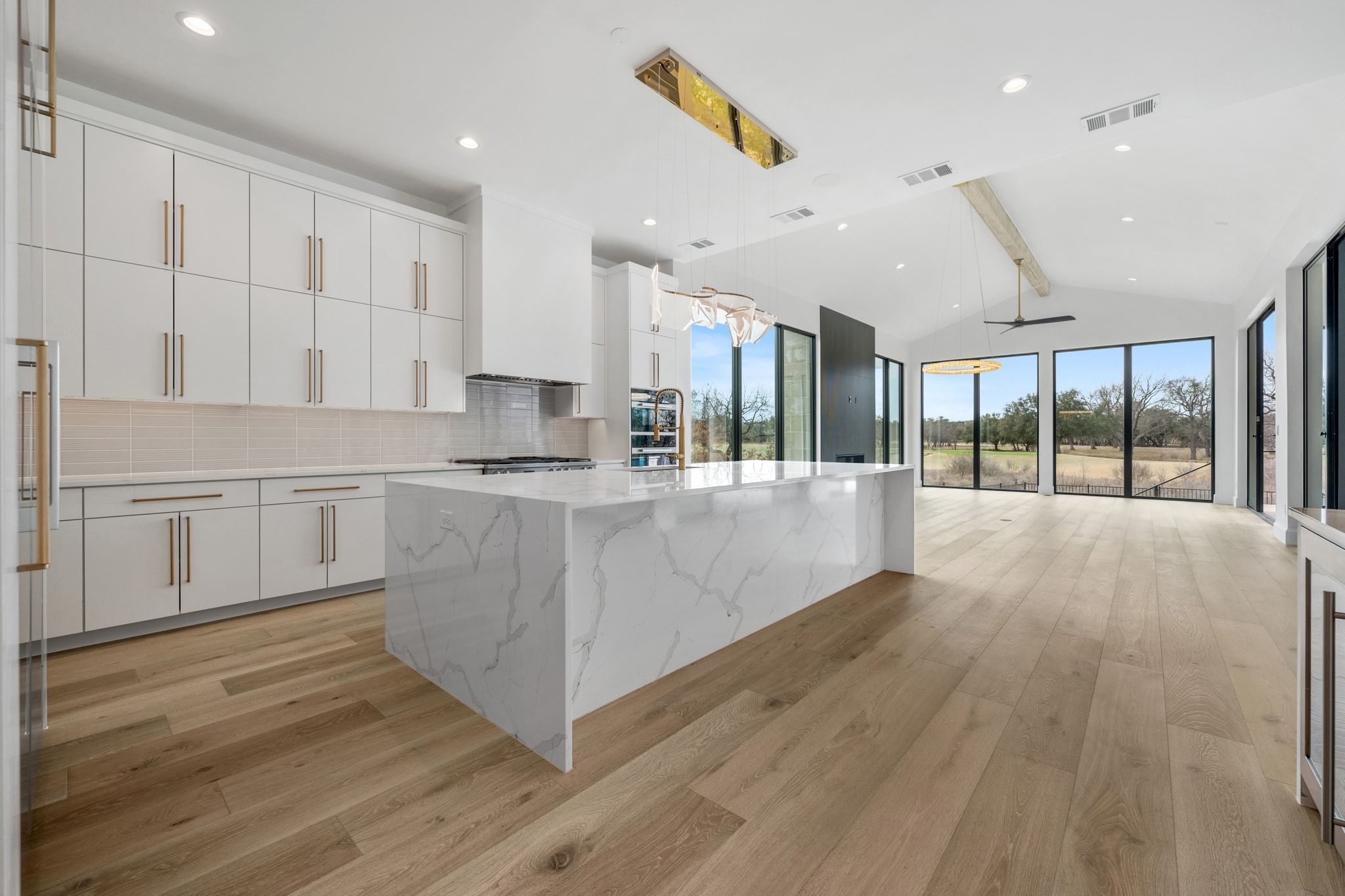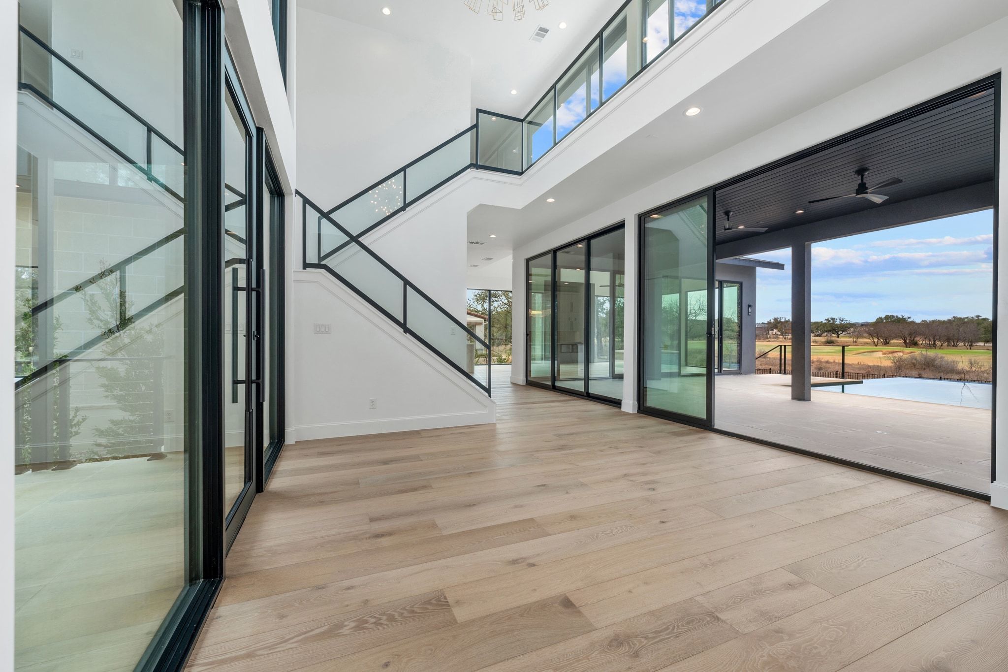 Welcome to 111 Orange Plume in the coveted Summit Rock community of Horseshoe Bay—where contemporary architecture and breathtaking golf course views converge in extraordinary fashion. This newly constructed residence captures sweeping southeastern vistas of the 14th green of the Summit Rock Golf Course, creating a serene and ever-changing backdrop. Designed to blur the line between indoor and outdoor living, the first floor is framed by expansive full glass walls that flood the home with natural light and invite the outdoors in. The result is an open, airy atmosphere that fully embraces the beauty of the surrounding landscape while maintaining refined sophistication. The thoughtfully crafted floor plan offers four spacious bedrooms, including two luxurious primary suites—one on each level—perfect for multigenerational living or hosting guests with privacy and ease. A dedicated study downstairs provides a quiet, polished workspace, while the upstairs game room offers an ideal setting for entertainment and relaxation. Dual laundry rooms—one on each floor—add a layer of everyday convenience rarely found. The three-car garage features sleek epoxy flooring and abundant storage. Outdoors, a sparkling pool and hot tub overlook the course, complemented by a fully equipped outdoor kitchen—creating the ultimate setting for effortless entertaining, sunset dinners, and weekend gatherings. Inside, designer finishes, and high-end Miele appliances elevate every space with intentional elegance.