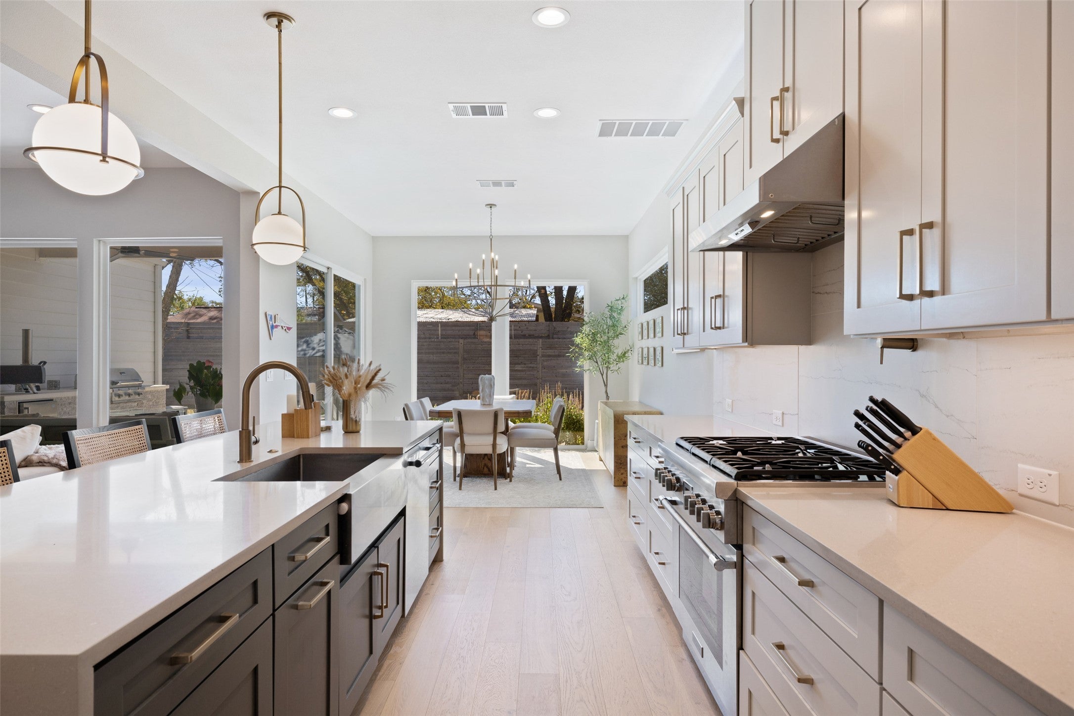 Modern design meets effortless comfort—and resort-style outdoor living—in this 5-bedroom, 3-bath residence spanning 2,898 square feet, thoughtfully built by Drew Homes with intention and quality throughout. Designed for livability and flexibility, the main level features both a private primary suite and a dedicated guest bedroom, ideal for hosting, multigenerational living, or a main-floor office without compromise. The primary suite offers a serene retreat with a spa-like bath and generous closet space, while the additional first-floor bedroom provides true separation and convenience. At the heart of the home, open, sun-filled living spaces flow seamlessly between the living, dining, and kitchen areas. A sleek chef’s kitchen anchors the main level with a large island, designer finishes, and clean architectural lines balanced by warm, organic materials—creating a space that feels both contemporary and comfortable. Expansive glass sliders blur the line between indoor and outdoor living, opening directly to the backyard oasis. The inviting backyard retreat is built for year-round enjoyment, featuring a pool, covered patio, and full outdoor kitchen—perfect for entertaining or relaxing evenings at home. Upstairs, additional bedrooms provide flexibility for family, guests, or work-from-home needs. Positioned just north of Crestview, the home enjoys an unbeatable location just blocks from the Crestview Shopping Center, with Fresh Plus grocery, Violet Crown Wine Bar, artisan coffee shops, and more. You’re also within walking distance of highly rated schools and Brentwood Park, known for its dog-friendly atmosphere, walking paths, sports courts, playground, and public pool. 1507 Villanova Dr delivers a rare combination of main-level living, modern architecture, resort-style amenities, and urban convenience—an elevated home designed for how people actually live.