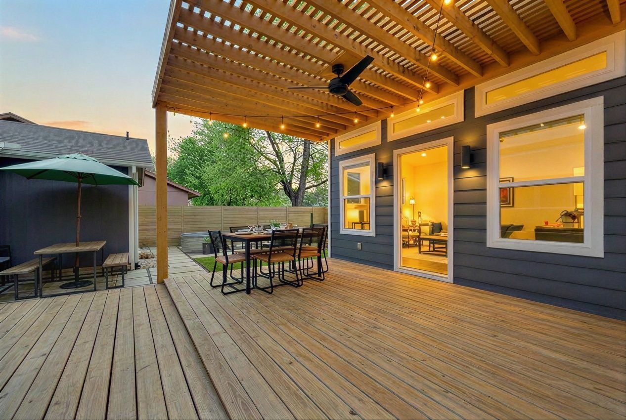 Discover modern luxury in this stunningly remodeled Southwest Austin home, featuring an open-concept layout with high ceilings, a rock-faced fireplace, and engineered wood flooring. The interior shines with quartz countertops and designer tiles imported from Spain and Clay Imports. Unique to this property is a 188-square-foot detached flex-space—fully insulated with A/C, heat, and recessed lighting—perfect for a home office or gym. This versatile studio is included in the total 1,560 square footage. The functional floor plan includes a walk-in shower, new windows, and an indoor utility room. Outside, enjoy a private oasis featuring a spacious covered deck and a sparkling 8-foot cowboy pool, with yard maintenance provided by the landlord for a truly headache-free lifestyle. Perfectly located near Mopac and the Violet Crown Trails, you're minutes from Whole Foods, Costco, and premier dining.