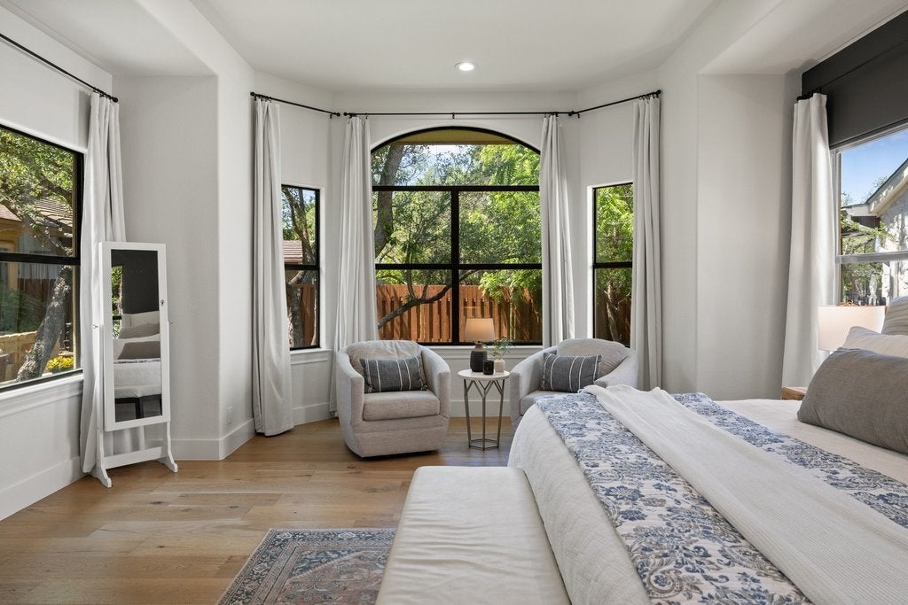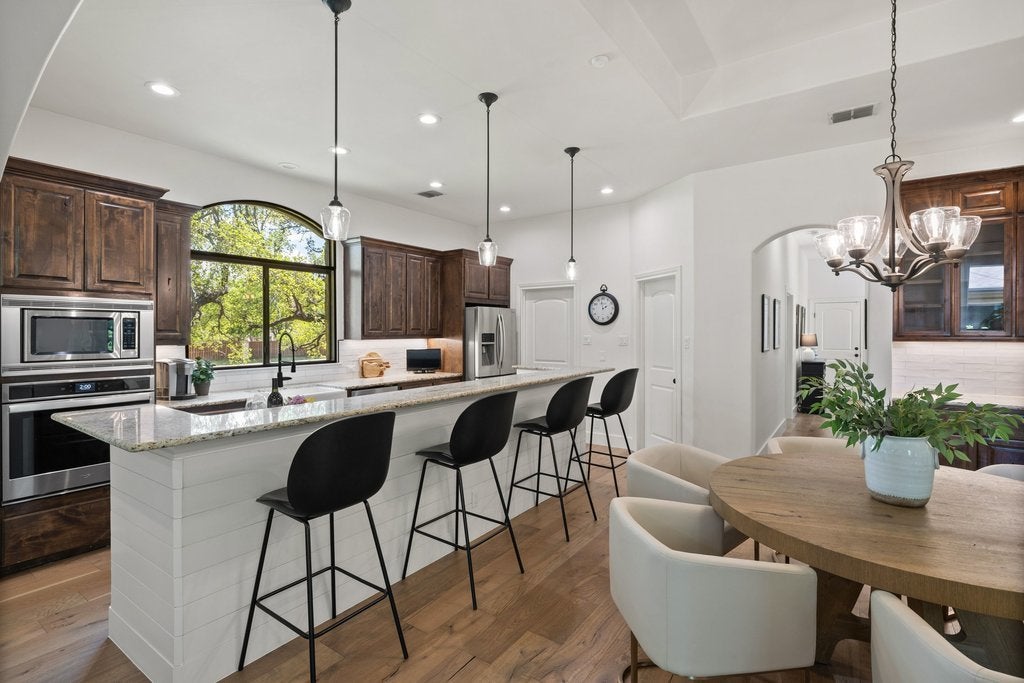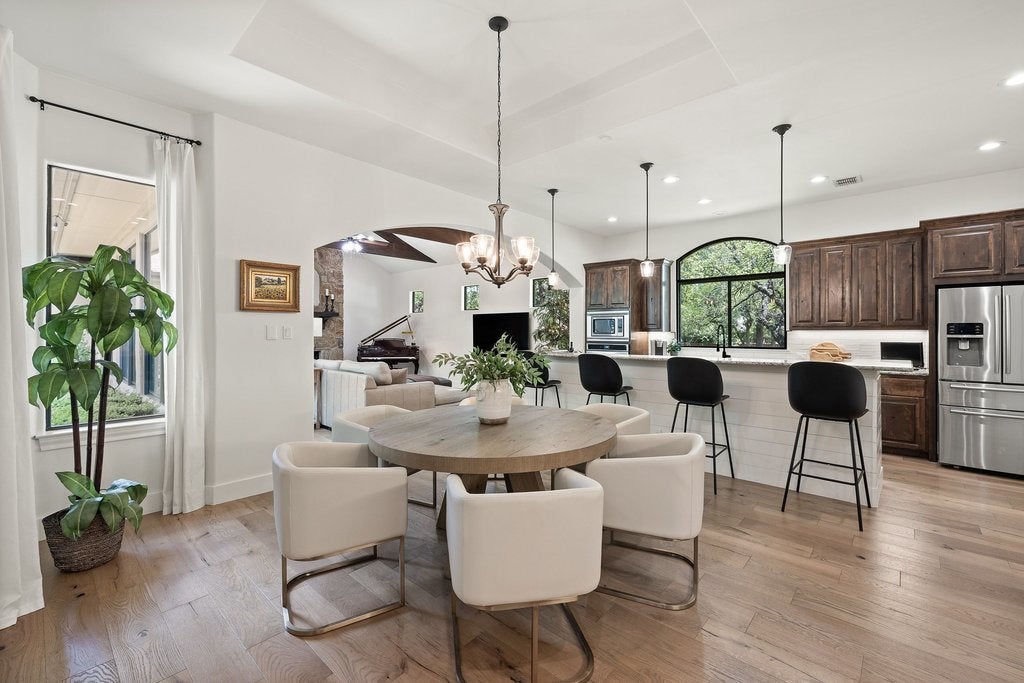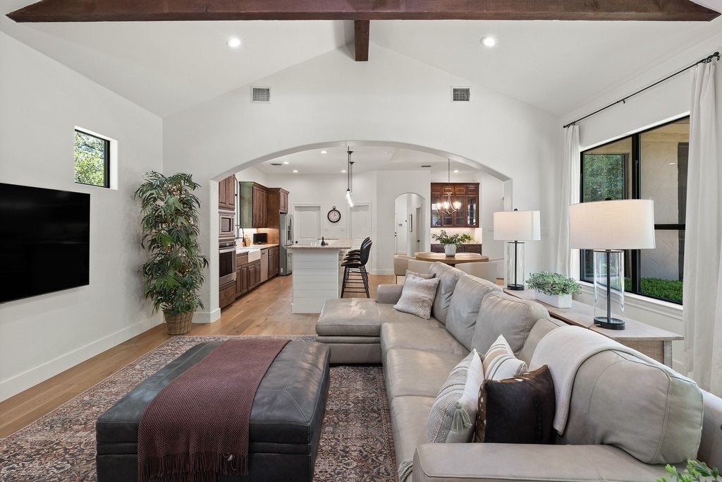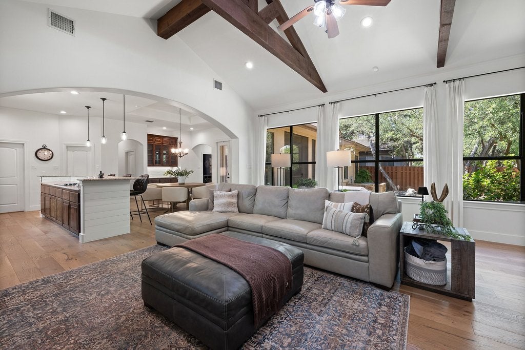 In the heart of Old Lakeway, beneath a canopy of mature trees, this beautifully reimagined single story home offers a rare blend of thoughtful design, everyday functionality, and inviting outdoor living, all just steps from miles of hike and bike trails and walkable neighborhood amenities. Inside, vaulted ceilings with exposed cedar beams and wide plank European white oak floors set a warm, elevated tone. The layout is exceptionally well designed, with flexible living spaces that adapt to the way you live. Whether you need a dedicated office, media room, or additional living area, every inch of this home has purpose. Custom cabinetry, designer finishes, and smart storage are thoughtfully integrated throughout. The home naturally draws you outdoors, where a fully screened porch and extended patio create a private, peaceful setting for daily living and entertaining. It is a space that invites you to slow down, whether starting your day with coffee or unwinding in the evening. The backyard feels tucked away and quiet, while the front and side landscape lighting add a stunning architectural presence after sunset. Thoughtful upgrades, including sound reducing window enhancements, contribute to a comfortable interior experience. The home’s position also offers immediate access to the vibrant trail system just beyond, creating a unique connection to the active Lakeway lifestyle right outside your door. The kitchen and baths have been beautifully updated with timeless finishes, including quartz countertops and custom tile work, and the home features smart technology and key system improvements that make it as functional as it is refined. Located within acclaimed Lake Travis ISD and just minutes from Lake Travis, golf, dining, shopping, and medical facilities, this home offers a lifestyle that is both connected and quietly removed. Magnificent neighbors convey. Owner/Agent.