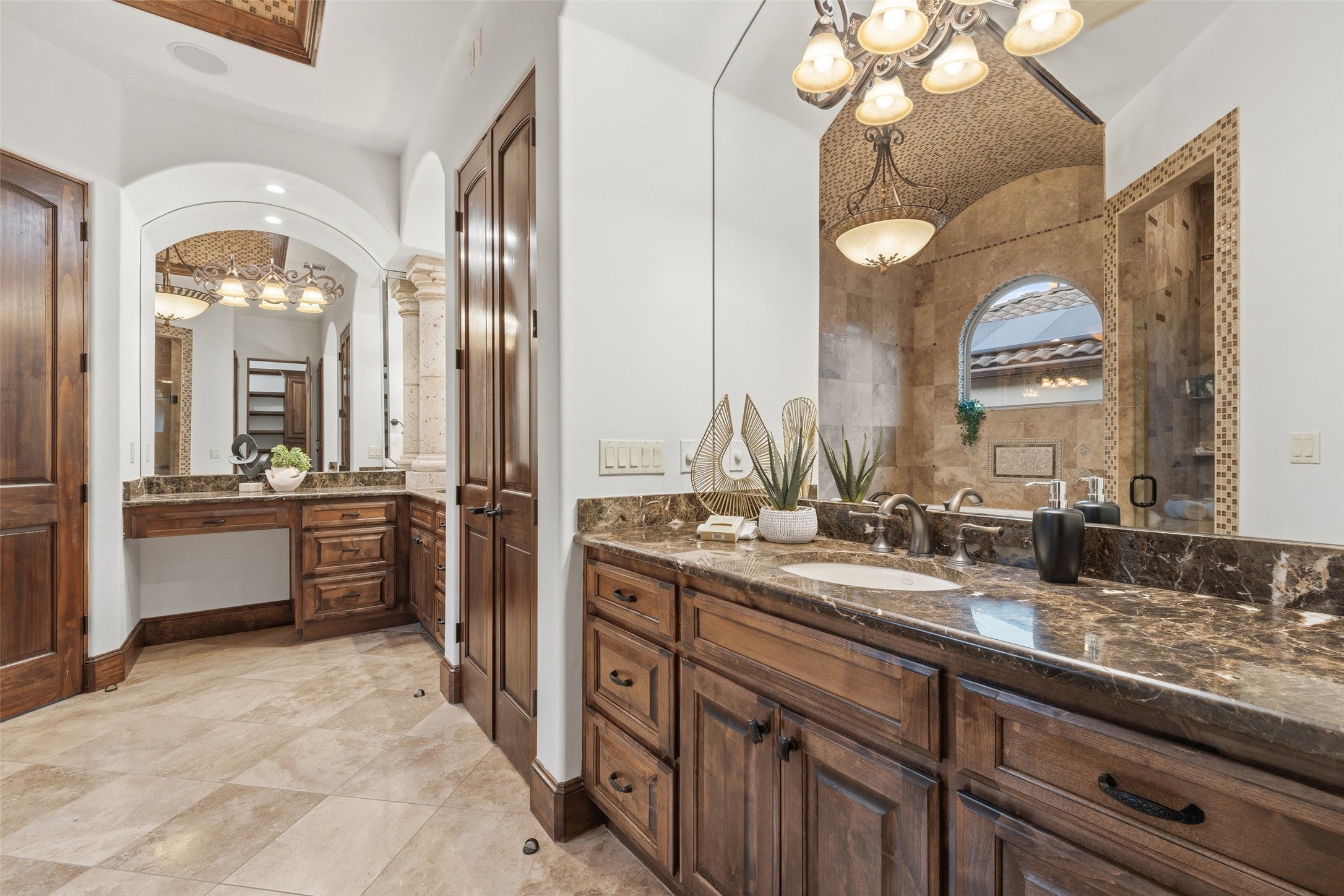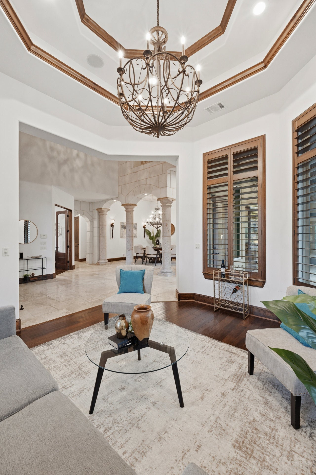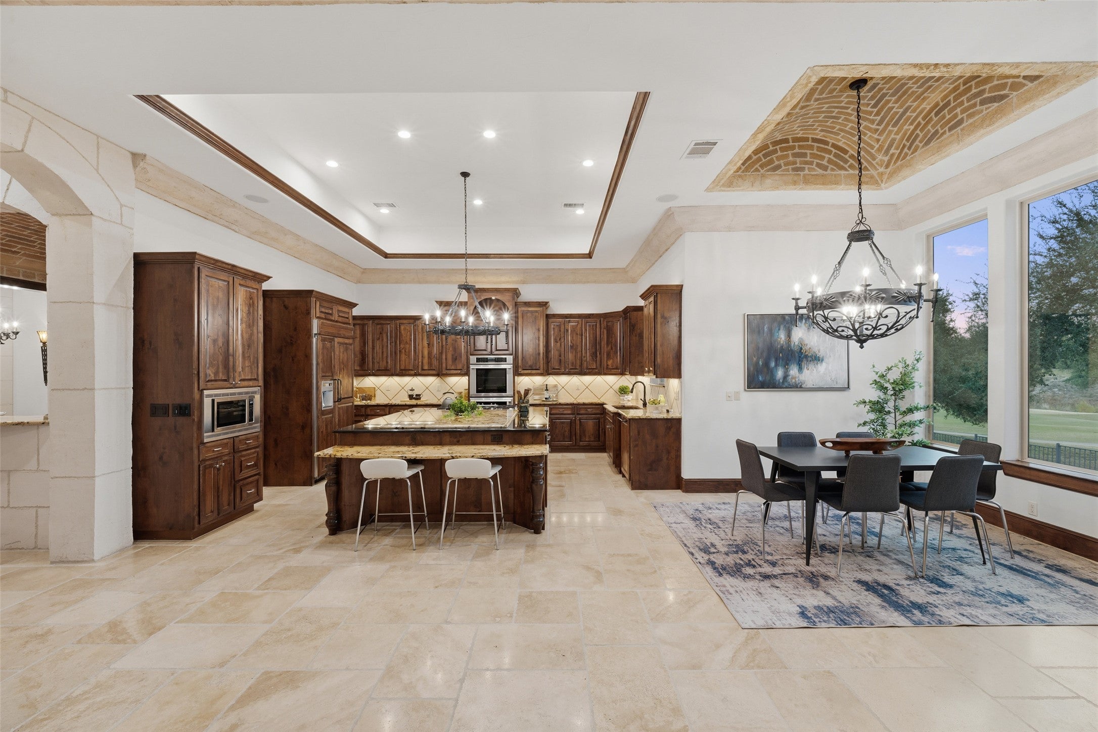 As you pass through the double gates of Flintrock Falls, where private serenity meets refined country club living, a sense of calm and belonging begins to take hold. The winding drive to 504 Black Wolf Run, shaded by mature oaks and set against a backdrop of golf course views and Texas skies, leads to a residence that feels more like a Mediterranean resort than a home. Built by acclaimed custom builder Zbranek & Holt, this architectural masterpiece blends timeless elegance with everyday livability across more than 5,500 square feet of thoughtfully designed space. Your days begin with coffee in the sun-drenched courtyard, warmed by the outdoor fireplace and serenaded by the gentle sound of the pool’s cascading fountain. Inside, groin-vaulted ceilings, hand-chiseled stone, and arched entries evoke the ambiance of a European estate, while expansive living areas, formal and informal dining, a chef’s kitchen, and a separate casita offer versatility for entertaining or multigenerational living. The main level features three of five total bedrooms, including the serene primary suite—a luxurious sanctuary with spa bath, soaking tub, and dual walk-in closets. Upstairs, a bonus living area with two additional bedrooms offers space to unwind, work, or host with ease. Step outside to grill in the covered pavilion, host twilight dinners on the rear terrace, or relax under stars beside the pool and fireplace. Residents enjoy exclusive access to both Flintrock and The Hills country clubs, each offering championship golf, tennis, pickleball, social events, dining, and full-service fitness. Just minutes from Lake Travis marinas, Lakeway Market, Baylor Scott & White Medical Center, and Bee Cave’s Hill Country Galleria, this home is also zoned to highly acclaimed Lake Travis ISD schools, offering access to an exceptional academic and athletic foundation. It’s more than a home—it’s a lifestyle of intention, connection, and ease in the heart of Texas Hill Country.
