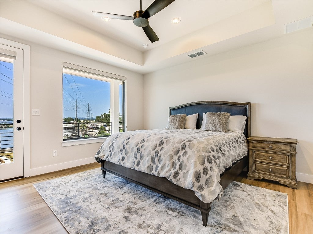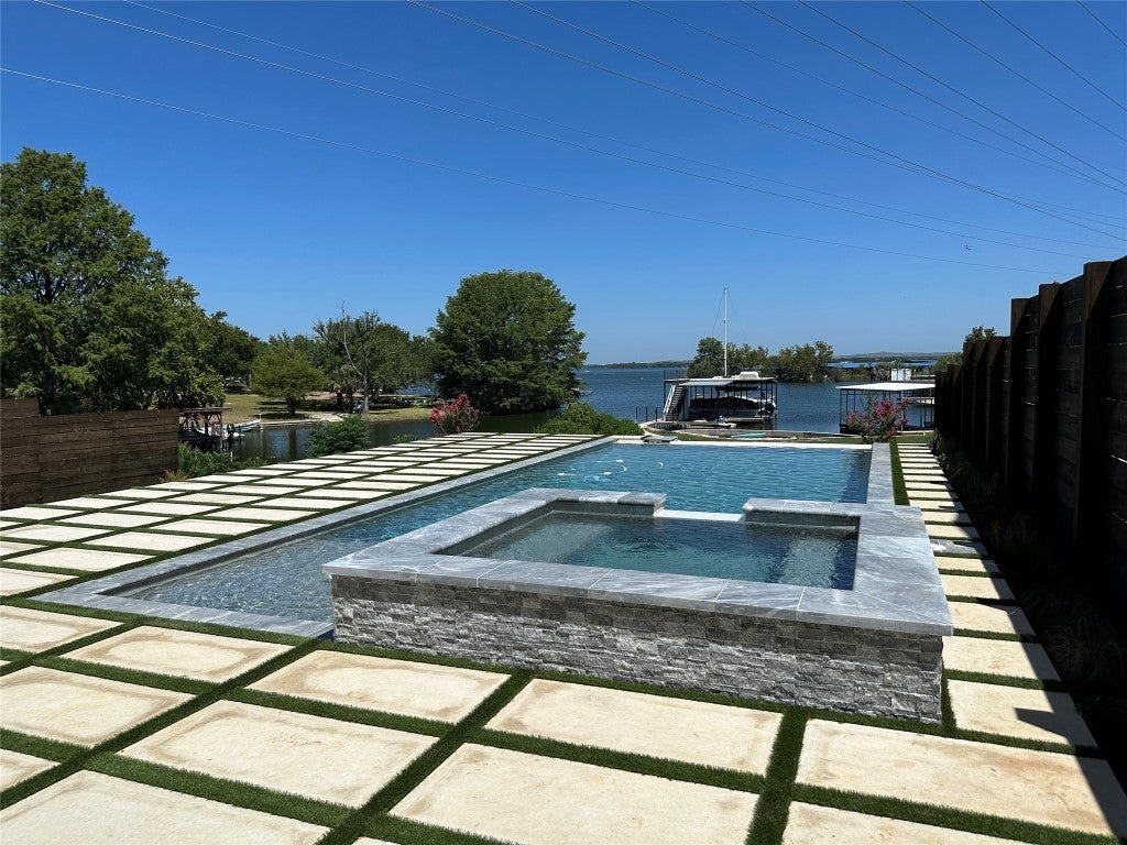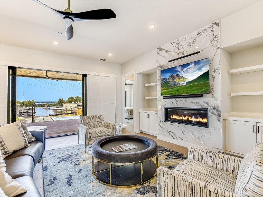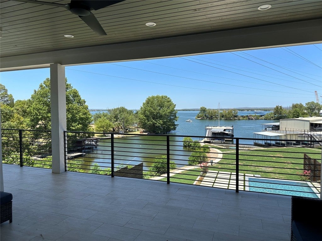 Enjoy lakeside living with this stunning home on Lake LBJ in the gated waterfront community of Captains Cove. Whether you're looking for a private retreat or a lucrative investment, this waterfront beauty delivers. Designed for both comfort and style, this lake house boasts an open living area with floor-to-ceiling windows, gas fireplace, ceramic plank flooring and breathtaking water views. The island kitchen is an entertainer's dream, featuring soft-close cabinetry, granite countertops, dine-in breakfast bar and top-tier appliances, including double ovens and a 6-burner gas cooktop. The spacious main-level primary suite offers a sitting area, dual sinks with quartz countertops, a soaking tub and a beautifully tiled frameless glass shower. A lockable guest suite with a private entrance is perfect for short-term rentals. Upstairs, your visitors will love two well-appointed guest bedrooms, each with its own bath, a secondary living area with theater seating and a covered deck overlooking the pool. Thoughtful upgrades include designer lighting, tankless water heater, automatic blinds, Sonos sound system and more. Outdoor amenities are just as impressive, featuring a covered patio with gas fireplace, built-in grill, pool, hot tub and 200+ ft of NW-facing water frontage. Boaters will appreciate two 27' boat slips. All TVs, electronics and furniture convey with the sale. With short-term rental potential, this property offers a fantastic opportunity to generate income while enjoying the best of lakefront living.