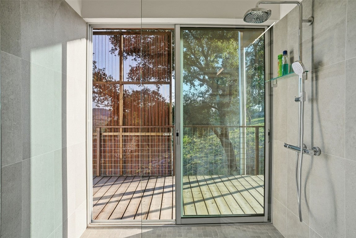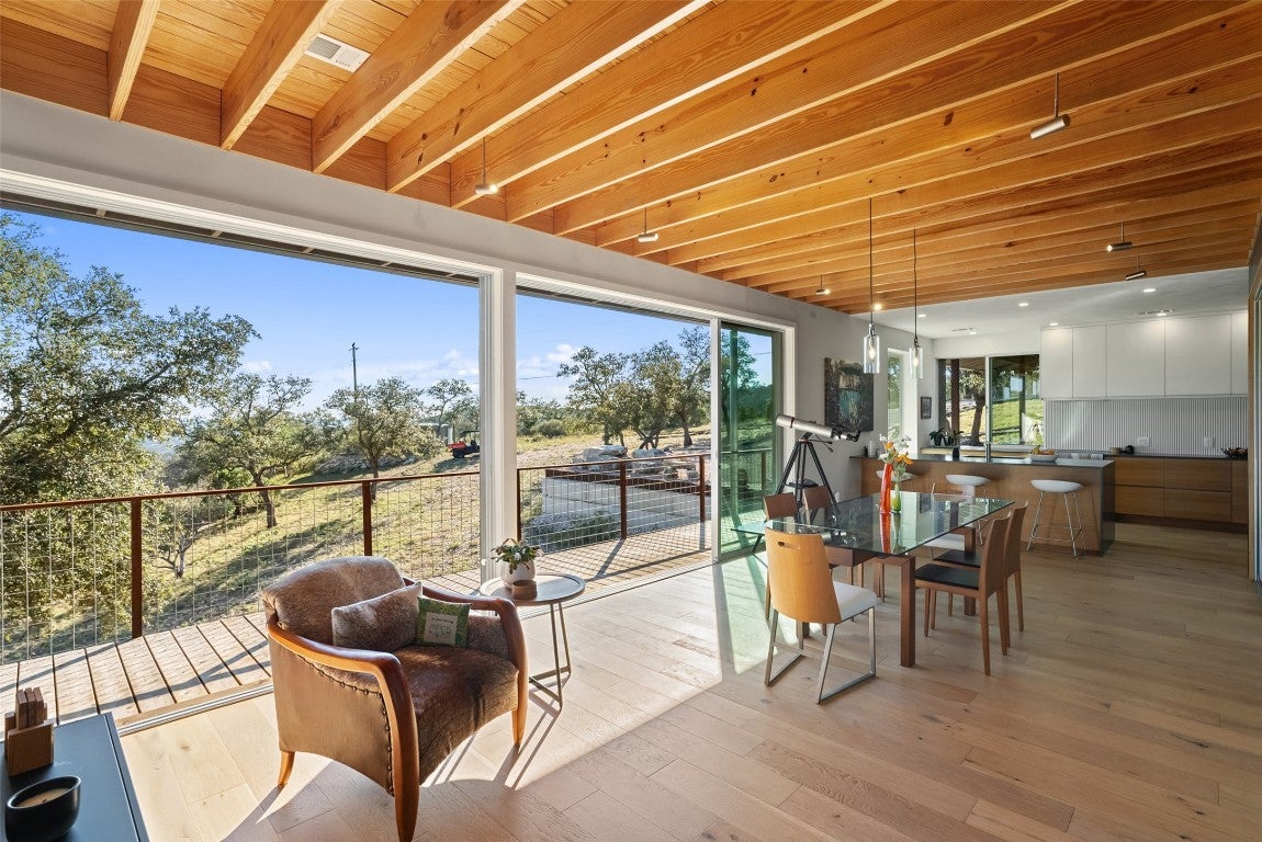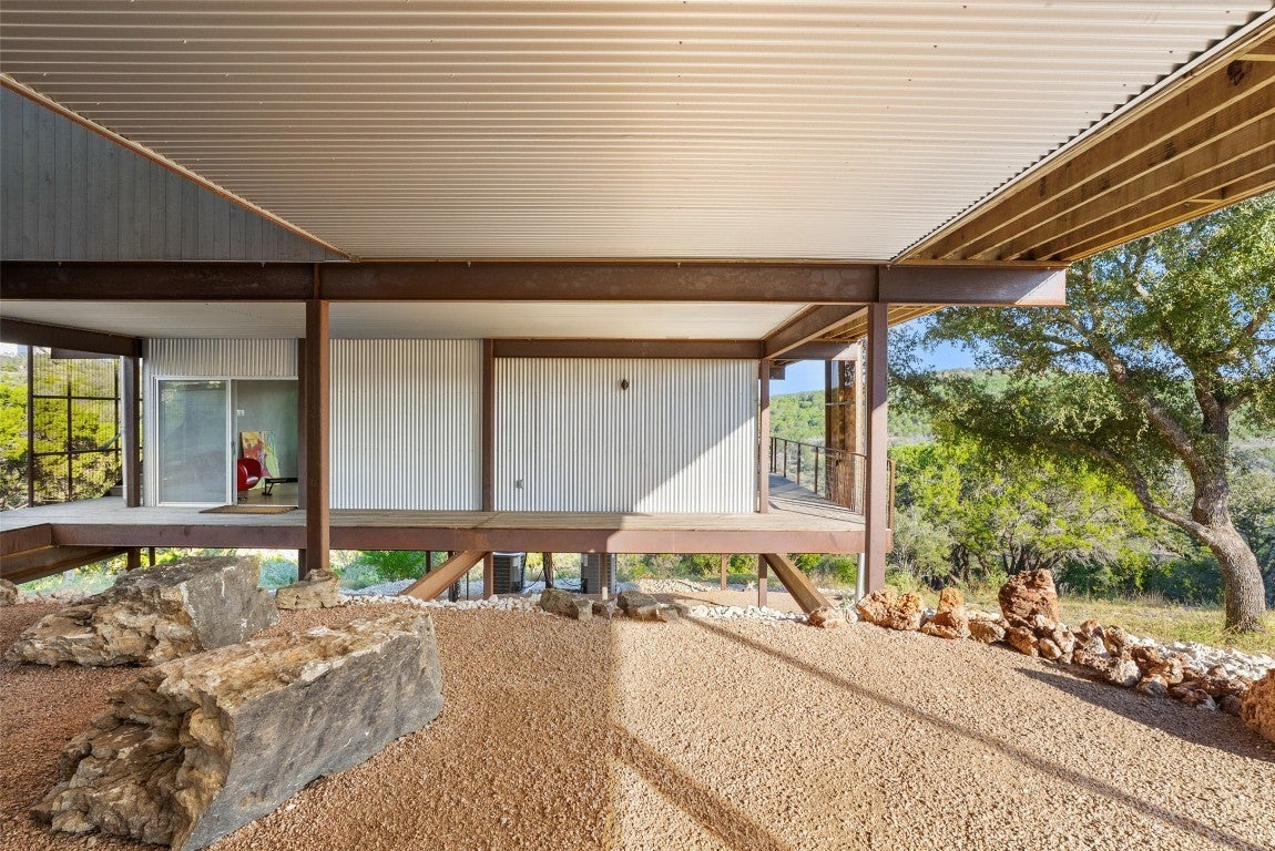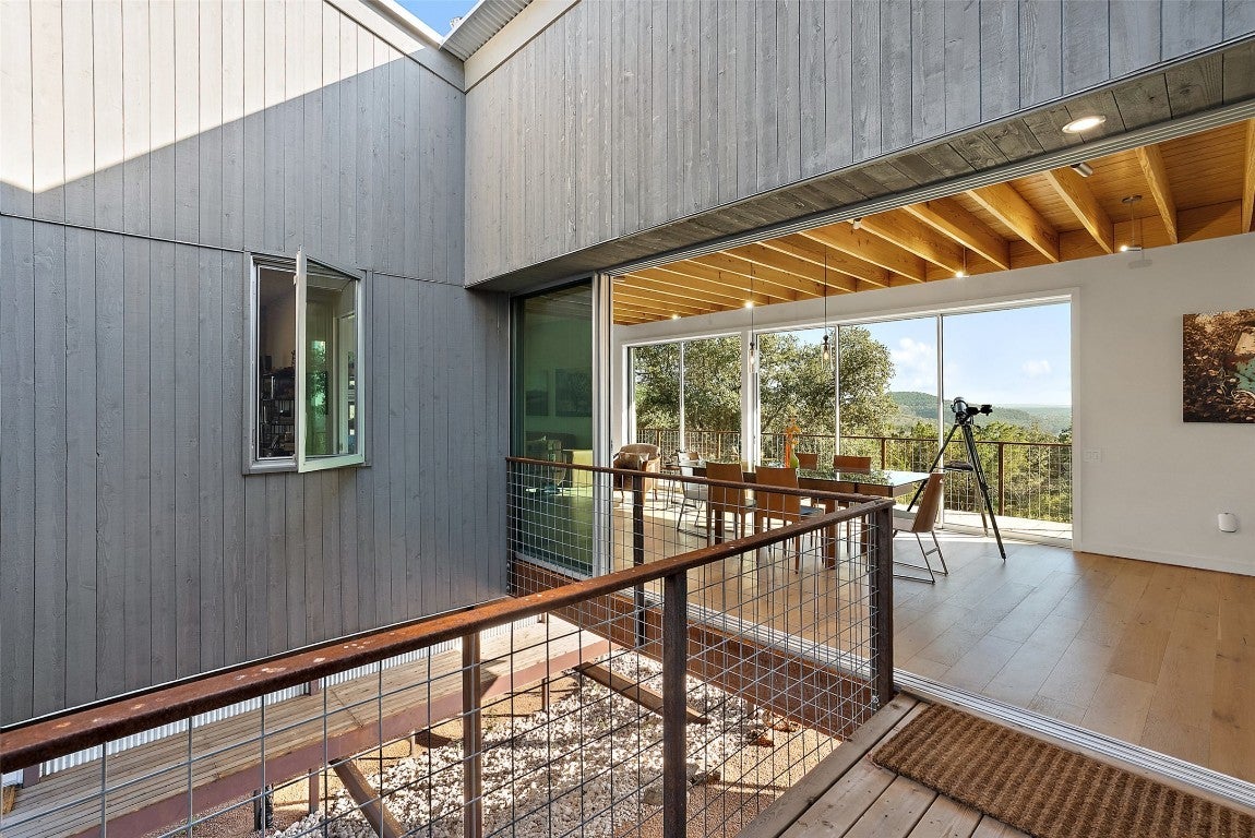Perched above the rolling hills and limestone outcrops of the gated Wolf Creek Ranch community, this home by LOWDO captures vistas of valleys, trees, and ridgelines near Lake Buchanan. Designed to harmonize with its surroundings, the residence rests on a steel pier-and-beam foundation, minimizing land impact while maximizing views, light, and airflow. A private drive leads through 23.07 acres where free-ranging cattle maintain the property’s Agricultural Exemption. Wildlife is abundant. The home features a 29,000+ -gallon rainwater collection system capturing about 2,510 gallons per inch of rainfall, with a complete filtration system. Built on a south-to-north orientation, it is solar-array ready for future off-grid use. Entry through an exterior “potting room” foyer transitions from outdoors to in. An open-air courtyard floods the interior with natural light and breezes. The main level includes Reform Cabinets from Denmark, engineered wood flooring, and a slider window to a bar and carport area. Sliders on nearly every wall open to wraparound porches with panoramic views. Covered porch square footage is 1750 sqft. The living area features a STUV fireplace. Constructed with foam-insulated walls and ceilings, 2x6 framing, red iron beams, and exterior NickelGap siding, Galvalume silver, corrugated steel, and Corten steel with perforated Galvalume detailing. There is a seperate entrance for the bottom floor. Enjoy sunsets, misty mornings, the Lake Buchanan HOA dock, ATV access to cliffs with easement to Morgan Creek, and the East Lake Buchanan Boat Ramp five minutes away. Designed for sustainability, this Wolf Creek Ranch retreat offers elevated Hill Country living in balance with nature.