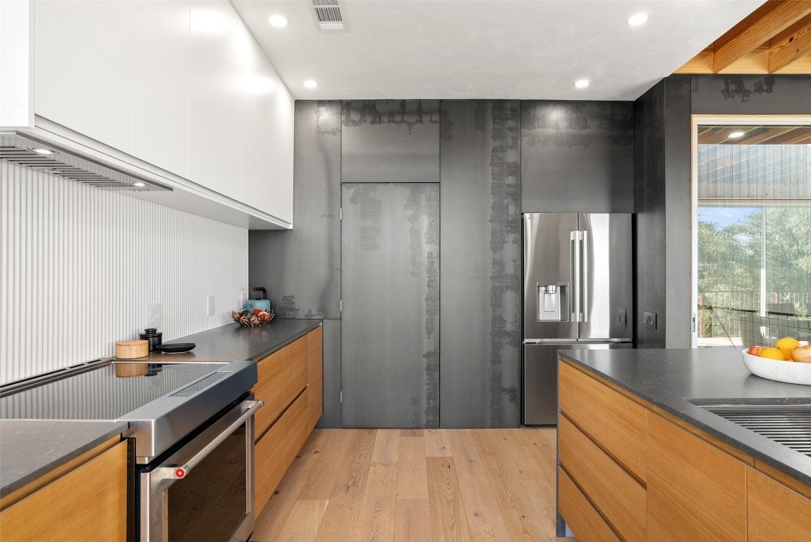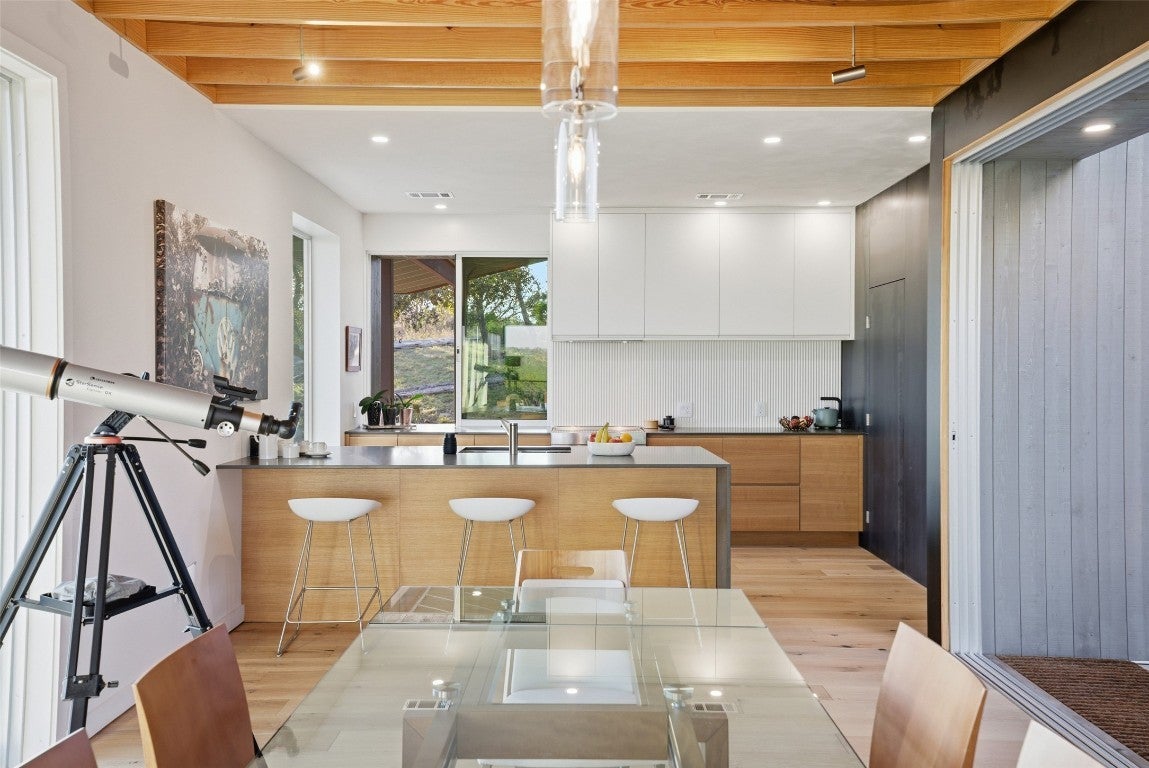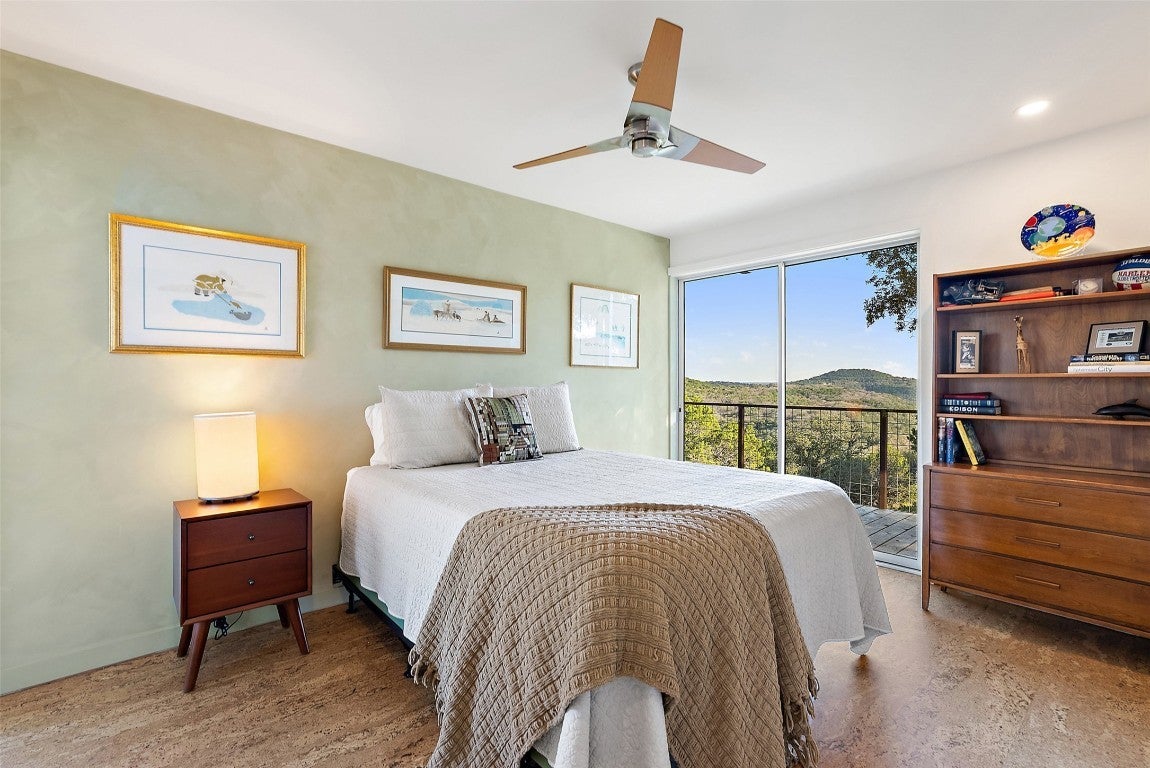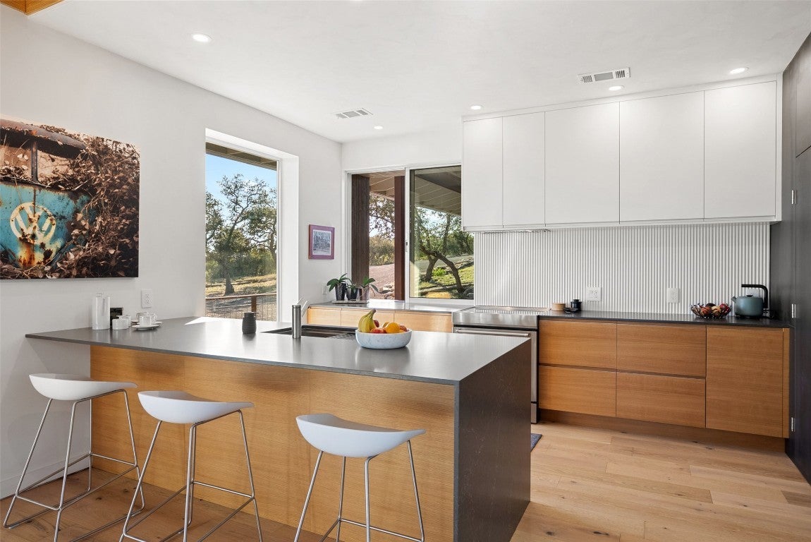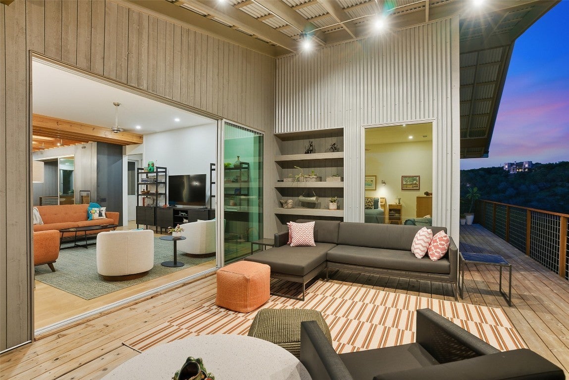 Perched above the rolling hills and limestone outcrops of the gated Wolf Creek Ranch community, this home by LOWDO captures vistas of valleys, trees, and ridgelines near Lake Buchanan. Designed to harmonize with its surroundings, the residence rests on a steel pier-and-beam foundation, minimizing land impact while maximizing views, light, and airflow. A private drive leads through 23.07 acres where free-ranging cattle maintain the property’s Agricultural Exemption. Wildlife is abundant. The home features a 29,000+ -gallon rainwater collection system capturing about 2,510 gallons per inch of rainfall, with a complete filtration system. Built on a south-to-north orientation, it is solar-array ready for future off-grid use. Entry through an exterior “potting room” foyer transitions from outdoors to in. An open-air courtyard floods the interior with natural light and breezes. The main level includes Reform Cabinets from Denmark, engineered wood flooring, and a slider window to a bar and carport area. Sliders on nearly every wall open to wraparound porches with panoramic views. Covered porch square footage is 1750 sqft. The living area features a STUV fireplace. Constructed with foam-insulated walls and ceilings, 2x6 framing, red iron beams, and exterior NickelGap siding, Galvalume silver, corrugated steel, and Corten steel with perforated Galvalume detailing. There is a seperate entrance for the bottom floor. Enjoy sunsets, misty mornings, the Lake Buchanan HOA dock, ATV access to cliffs with easement to Morgan Creek, and the East Lake Buchanan Boat Ramp five minutes away. Designed for sustainability, this Wolf Creek Ranch retreat offers elevated Hill Country living in balance with nature.
