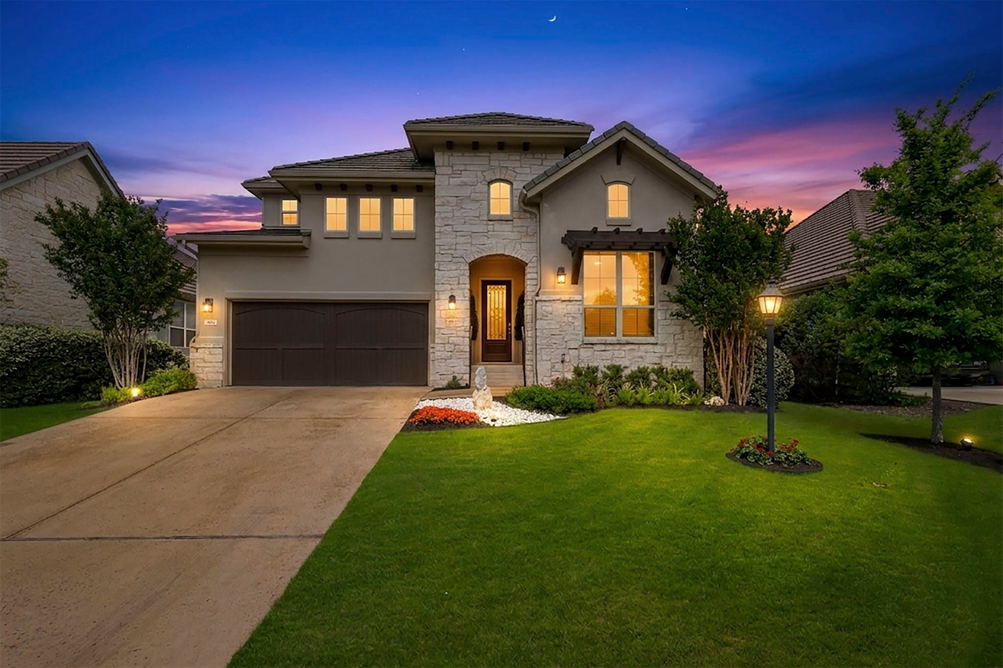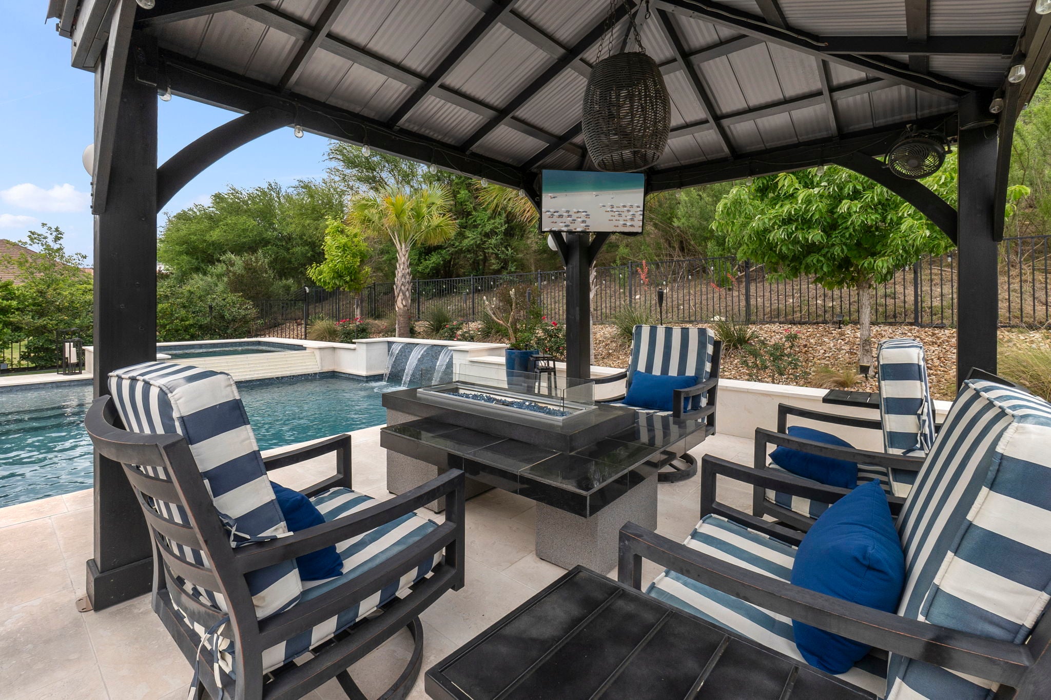 Nestled on a quiet cul-de-sac in the highly sought-after Rough Hollow community, this beautifully designed two-story home offers an exceptional blend of comfort, style, and resort-style living. The thoughtfully planned layout features two bedrooms and two full bathrooms on the main level, with an additional two bedrooms and one and a half baths upstairs—ideal for both everyday living and hosting guests. At the heart of the home, a spacious family room and open-concept kitchen overlook a stunning backyard oasis, completed in 2023. The outdoor space is designed for relaxation and entertaining, featuring a pool, hot tub, gazebo, and elegant travertine decking that stays cool underfoot even in the hot Texas summer heat. Low-maintenance landscaping and premium turf provide year-round backyard beauty without the upkeep. Interior upgrades enhance both look and function, including quartz countertops and a JennAir gas cooktop in the kitchen, additional tile flooring on the main level, and engineered wood flooring throughout the upstairs. The primary bathroom has been luxuriously remodeled with Carrara marble. The staircase is finished with designer carpet. Additional features include a full irrigation system for the front and back yards, an indoor fire sprinkler system, and thoughtfully selected window treatments. The home is located just two miles from Lake Travis and the HOA offers access to a marina and a breathtaking lakeside infinity pool. Residents enjoy an unmatched lifestyle with exclusive access to a private Yacht Club and Marina, a fitness center, lazy river, multiple swimming pools, tennis/pickleball courts, a basketball court, multipurpose field, scenic hiking and walking trails, and a year-round pavilion. In addition to the HOA, the World of Tennis Club and four nearby golf courses are available for membership. This home offers the perfect balance of luxury, recreation, and everyday convenience.