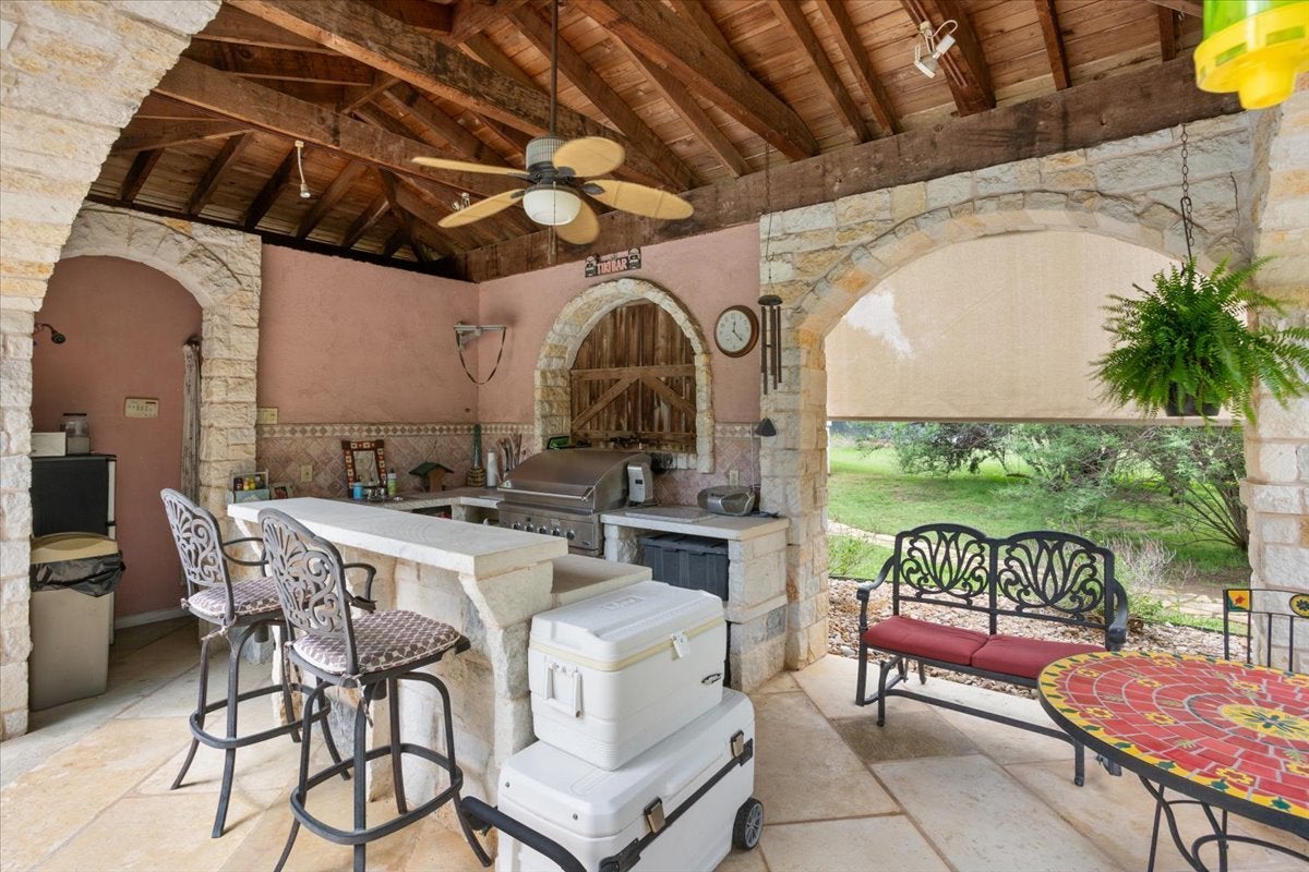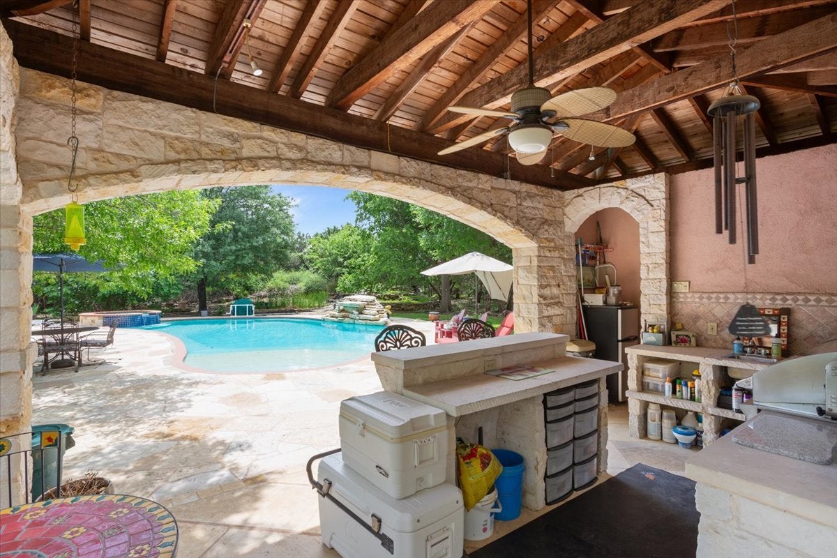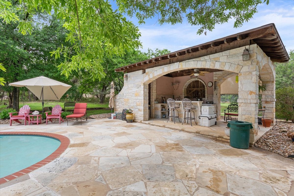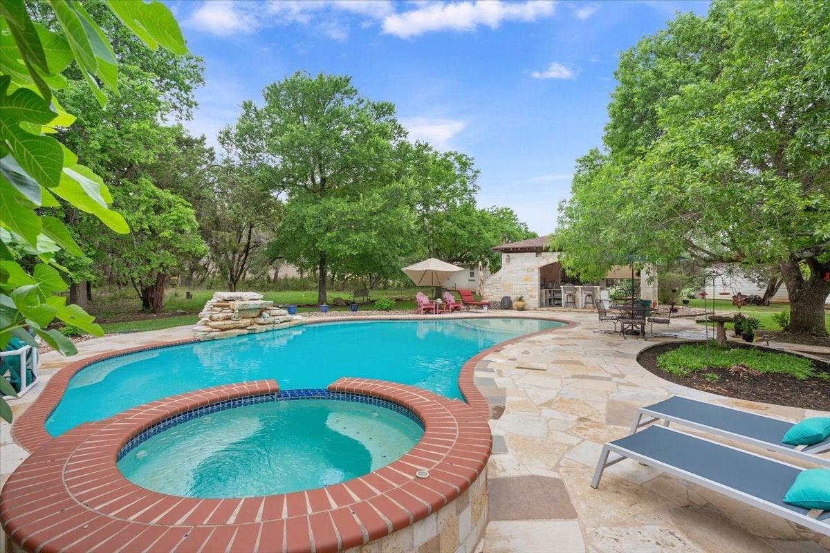 If you’ve been searching for a property that truly has it all, this is the one you won’t want to miss. The beautifully maintained main home offers 1,917 square feet with 3 bedrooms, 2 bathrooms, and two spacious living areas—perfect for both everyday living and entertaining. Step outside to a stunning backyard retreat featuring a large stone patio, sparkling pool, and cabana. Just beyond, you’ll find a peaceful koi pond, private guest quarters, and a versatile barn/workshop—creating your own personal oasis. Situated on 2.7 fully fenced acres, this property offers space, privacy, and endless possibilities. The HOA is just $120 annually and includes access to a private catch-and-release lake just up the street. Additional highlights include: 2,000-gallon water storage tank in the pump house 16-zone sprinkler system New windows AC replaced in 2021 Roof replaced in 2021 Water heater replaced in 2025 Water well installed in 2021 Septic system (2003, recently inspected) Multi-purpose barn/workshop Conveniently located just 1.4 miles from shopping and dining, including Whole Foods at The Parke, and only 2.9 miles to HEB.