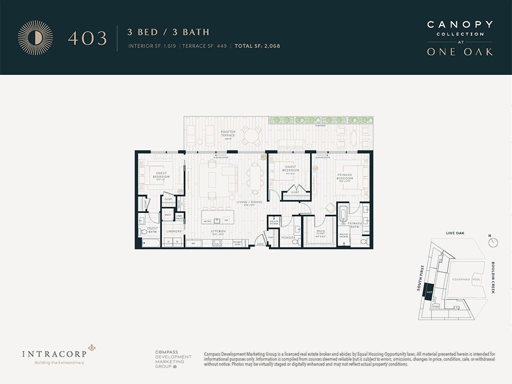 Welcome to One Oak — a premier boutique condominium community perfectly positioned in Austin’s highly coveted Bouldin Creek neighborhood. Just steps from the vibrant South First and South Congress corridors, this top floor Canopy Penthouse Collection residence combines elevated modern design with one of the city’s most walkable, sought-after locations. Inside, the open-concept layout is defined by soaring 10 ft ceilings and floor-to-ceiling windows that fill the home with natural light. The thoughtfully designed floor plan includes three spacious bedrooms and three full bathrooms. The chef-inspired kitchen features custom Italkraft cabinetry, sleek quartz countertops, and a premium Bosch appliance package—offering the perfect balance of style and performance. The primary suite is a private retreat, complete with a spa-like bath featuring a freestanding soaking tub, dual vanities, backlit mirrors, and an oversized glass shower. A sliding glass door opens to a private section of the expansive 400+ sq ft terrace, offering stunning views of the downtown skyline and the lively South 1st corridor—an ideal setting for morning coffee, evening entertaining, or relaxing under the Austin sky. Additional highlights include two dedicated garage parking spaces and access to One Oak’s resort-style amenities: an infinity-edge pool with BBQ grills and fire pit, state-of-the-art fitness center, yoga lawn, owner’s lounge, co-working spaces, and cold storage for deliveries. Contact the listing agent for details on off-market opportunities and interest rate buy-down options. Photos shown are of the staged model residence #402, also available to tour.