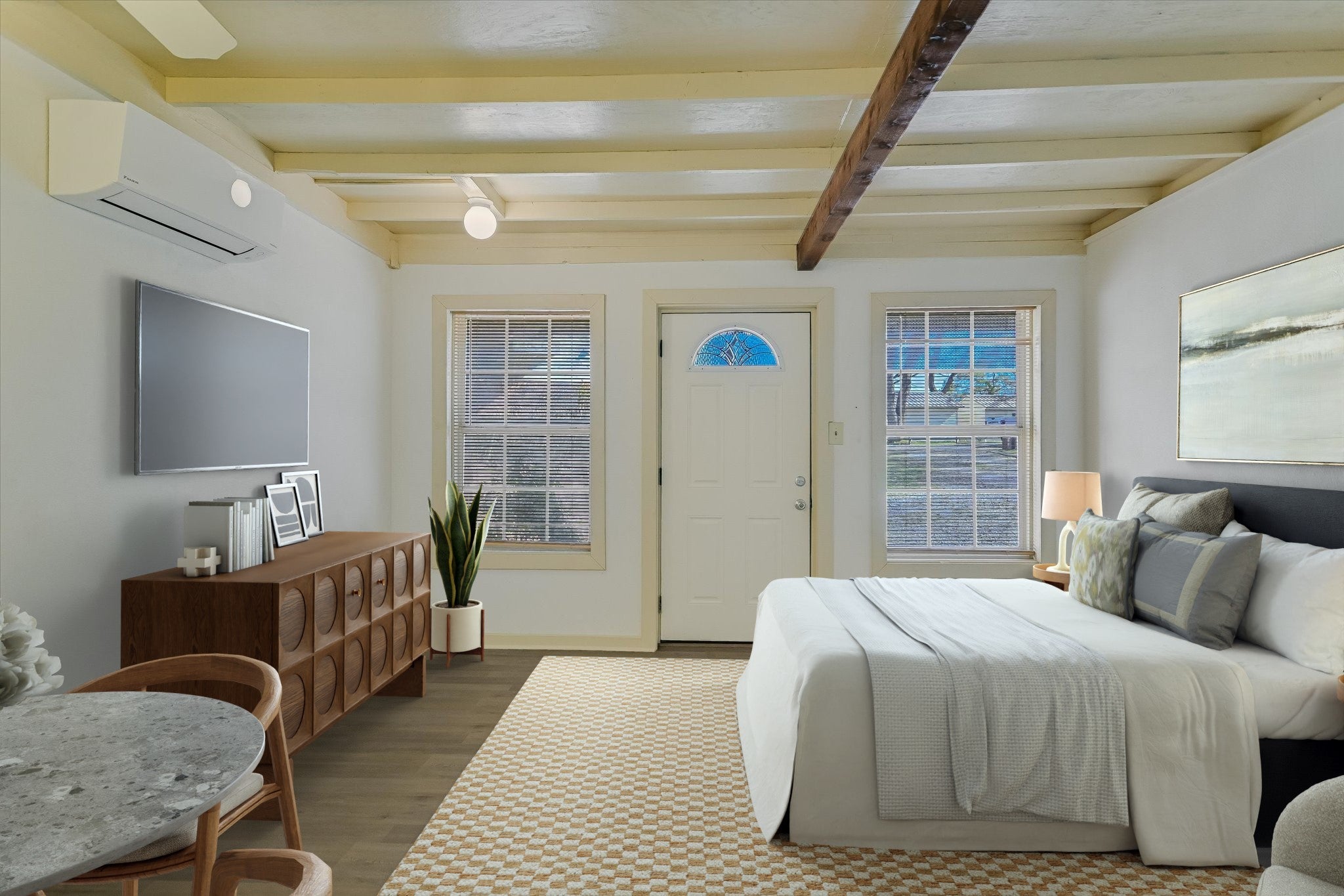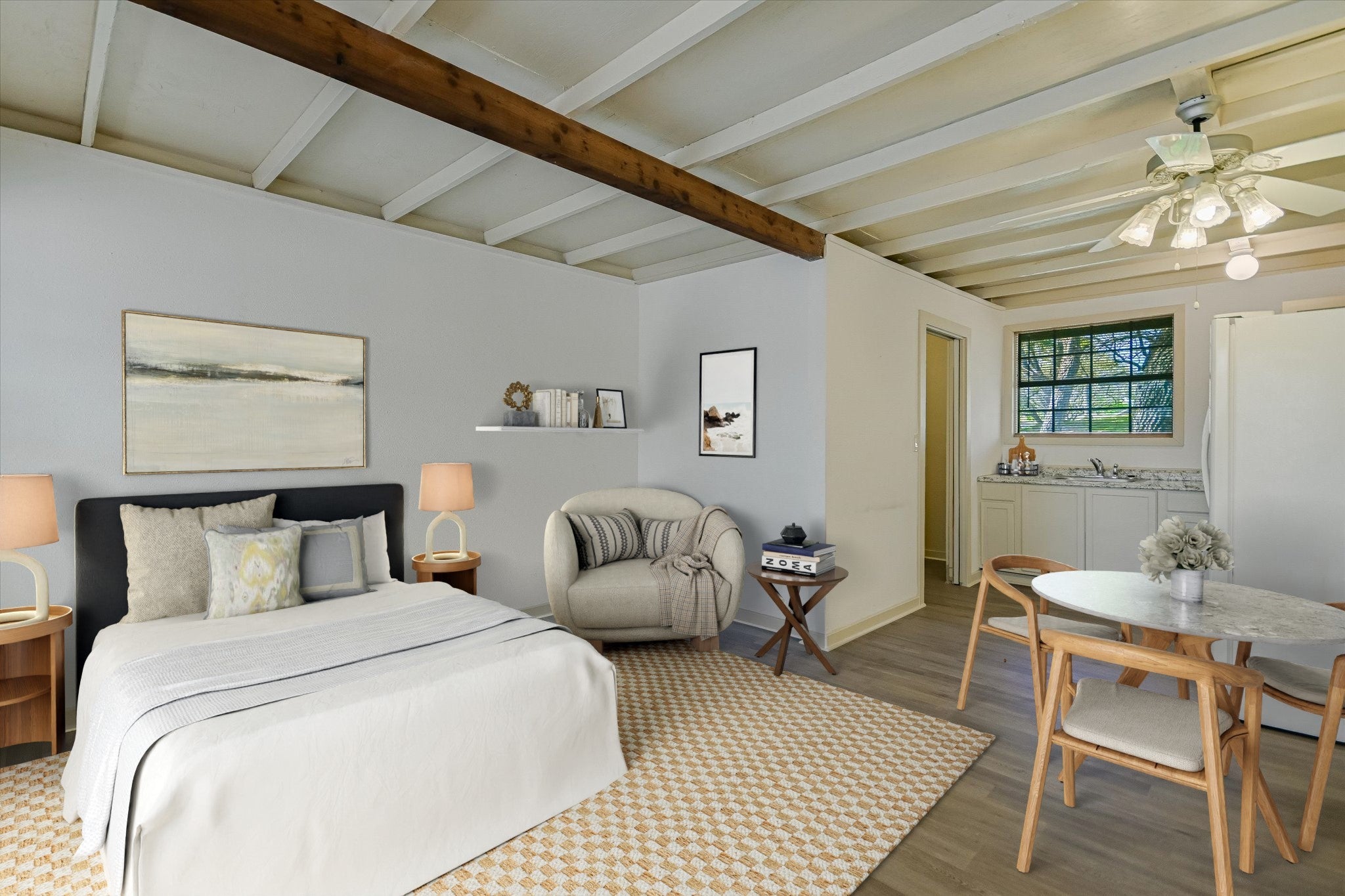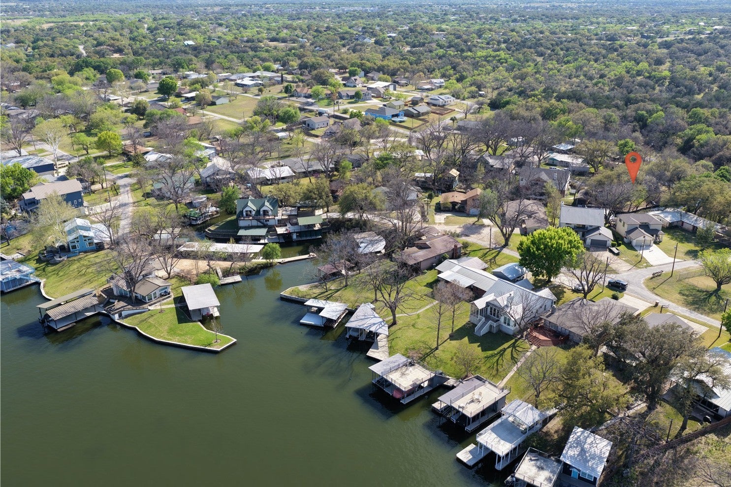 Tucked into a quiet Kingsland waterfront setting on Lake LBJ, this property offers the rare combination of single-level living, a beautifully treed lot, and 155 feet of channel waterfront. Towering, century-old oak trees frame the property, creating a shaded and inviting setting with generous shoreline to enjoy lakeside living. The main home features 2 bedrooms and 2.5 baths with an open-concept layout connecting the living, dining and kitchen areas. Vaulted ceilings elevate the living space, while a wood-burning stove adds warmth and character. Tile flooring runs throughout, offering durability and ease of maintenance. Both bedrooms include private en-suite baths, walk-in closets and direct access to the covered back patio with peaceful channel views leading to the Colorado Arm of Lake LBJ. Outdoor living is a highlight with covered patios at both the front and back, along with a lakeside deck just steps from the water. The expansive waterfront spans two lots, providing space to tie up a boat or Jet Skis, with room to spread out and enjoy the setting. A detached 1-bedroom, 1-bath guest house with kitchenette provides comfortable space for guests or extended stays. It is connected to a 1-car garage and 2-car carport, offering excellent storage and a practical solution for keeping a boat or Jet-Skis protected. A nearby community boat ramp adds convenient access to the lake, completing a setting designed to fully enjoy the waterfront. Schedule your showing today. Interior photos have been virtually staged.