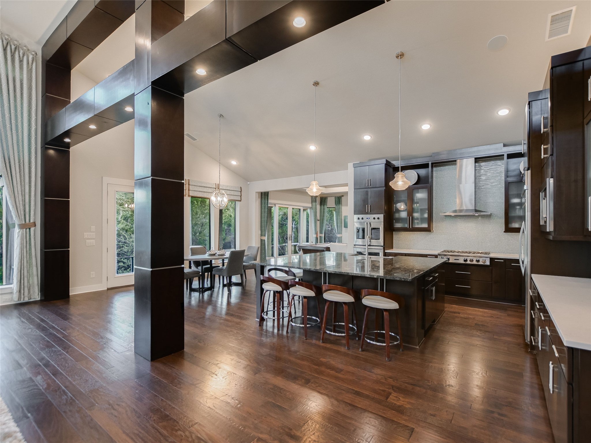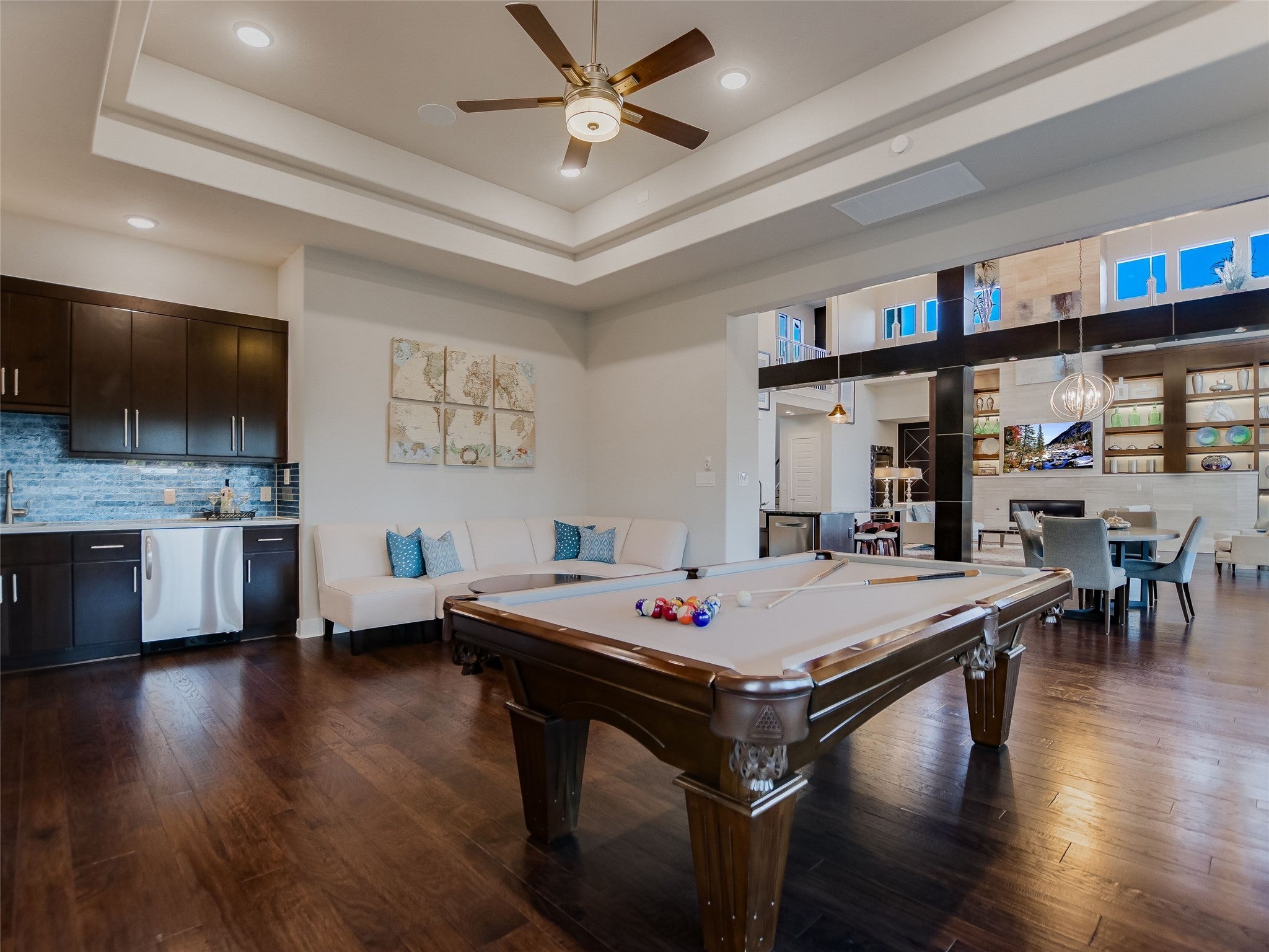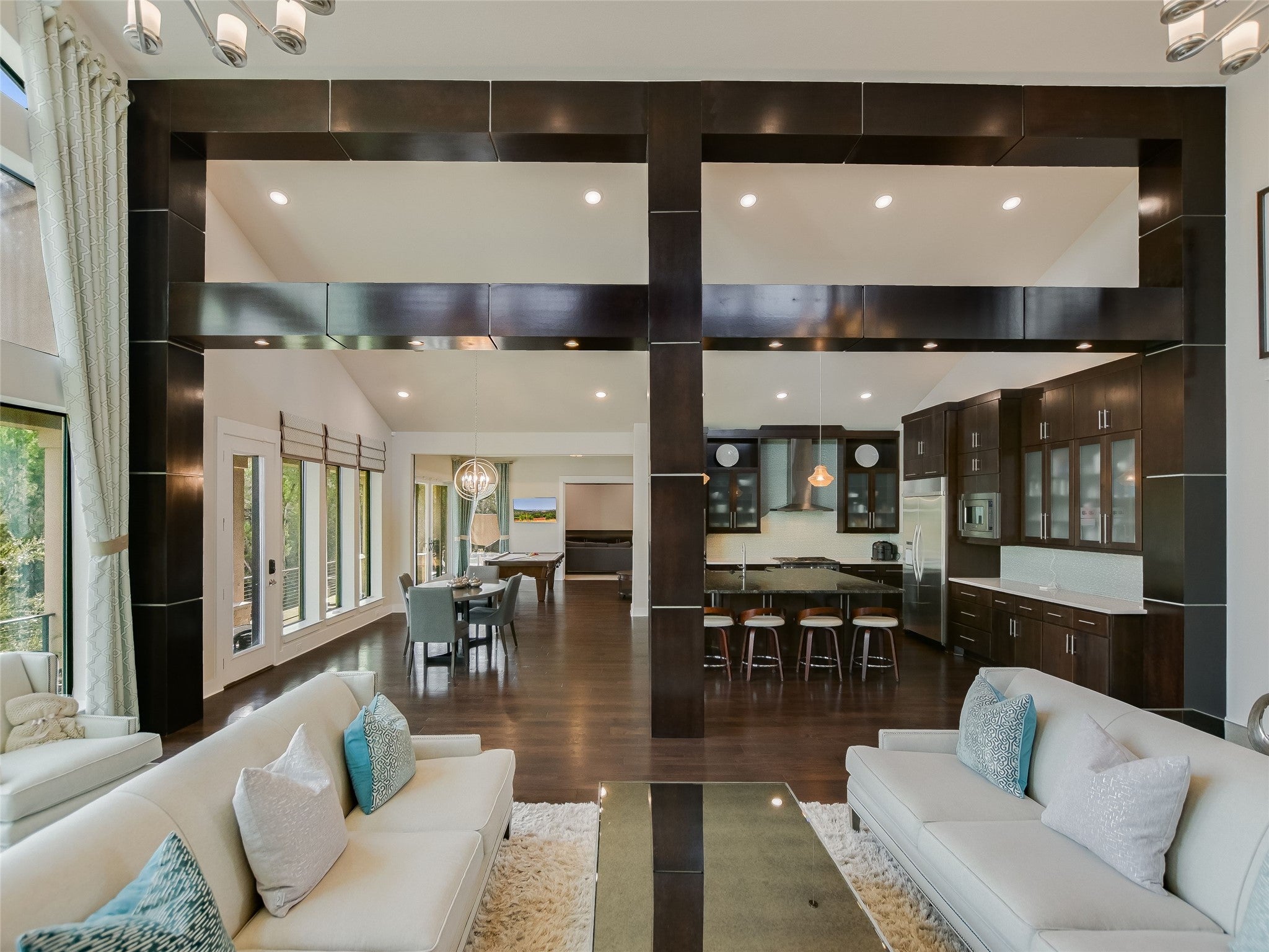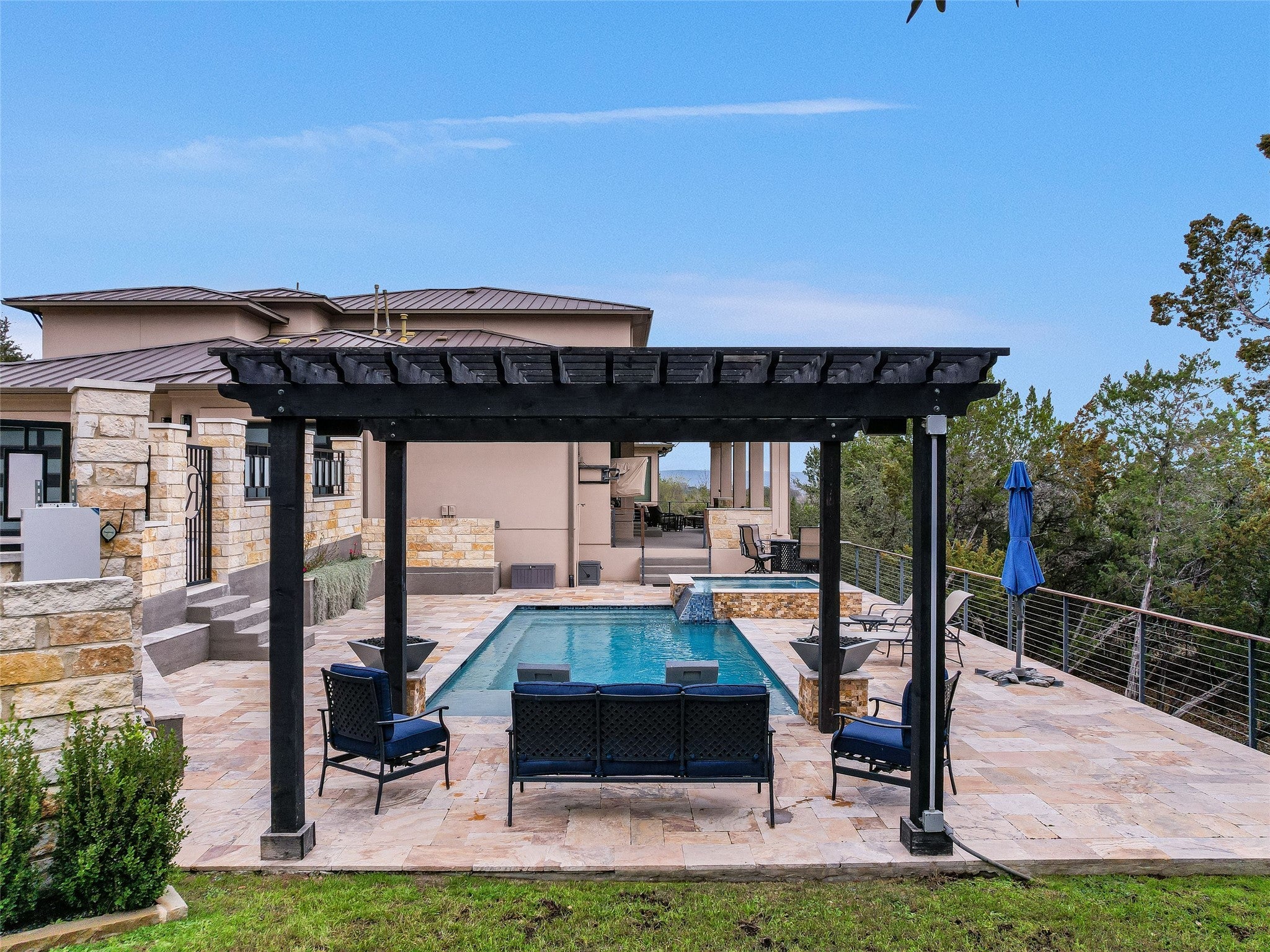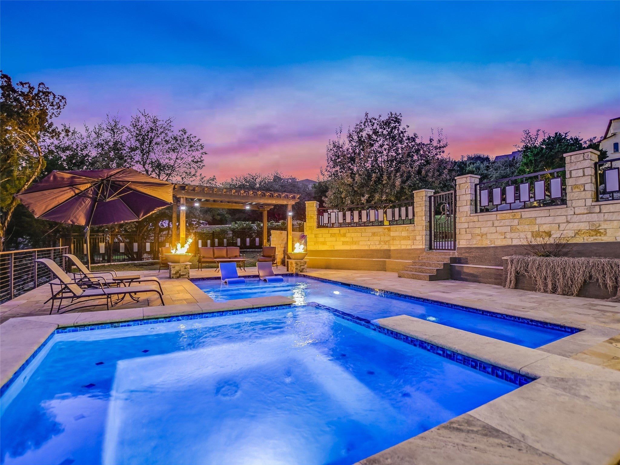 Modern luxury living near Lake Travis on a private one acre homesite in the gated Canyons at Lake Travis community. This custom home blends contemporary architecture, refined finishes and resort style outdoor living, and features a recently added luxury pool surrounded by mature trees and scenic Hill Country views. Designed for entertaining and everyday living, the soaring open floorplan showcases expansive window, abundant natural light and views. The gourmet chef’s kitchen includes an oversized center island that seats 6, a Viking cooktop and French door double ovens, walk in pantry, and flow to multiple dining areas and the main living spaces with billiard and games area and a media room, ideal for hosting and gatherings. The primary suite on the main level offers a private retreat with tranquil views, a large spa inspired bathroom and spacious walk in closet. An additional bedroom and home office are on the main level. Upstairs, two bedrooms, a hall office and flexible living spaces create privacy and versatility. Outdoor living is highlighted by a pool with loggia and hot tub, expansive deck with fireplace, outdoor kitchen with custom grill and exceptional privacy, perfect for a luxury Hill Country lifestyle. The large lot offers space for outdoor entertaining and lounging. Additional features include a three car garage, metal roof, masonry and stucco exterior, dedicated study and high-end finishes throughout. Located in award winning Lake Travis ISD and minutes from Lake Travis marinas, boating, dining, golf, and outdoor recreation. An exceptional opportunity for luxury buyers, second home seekers, and out of state relocation clients seeking modern design, space, privacy, and the Lake Travis lifestyle.
