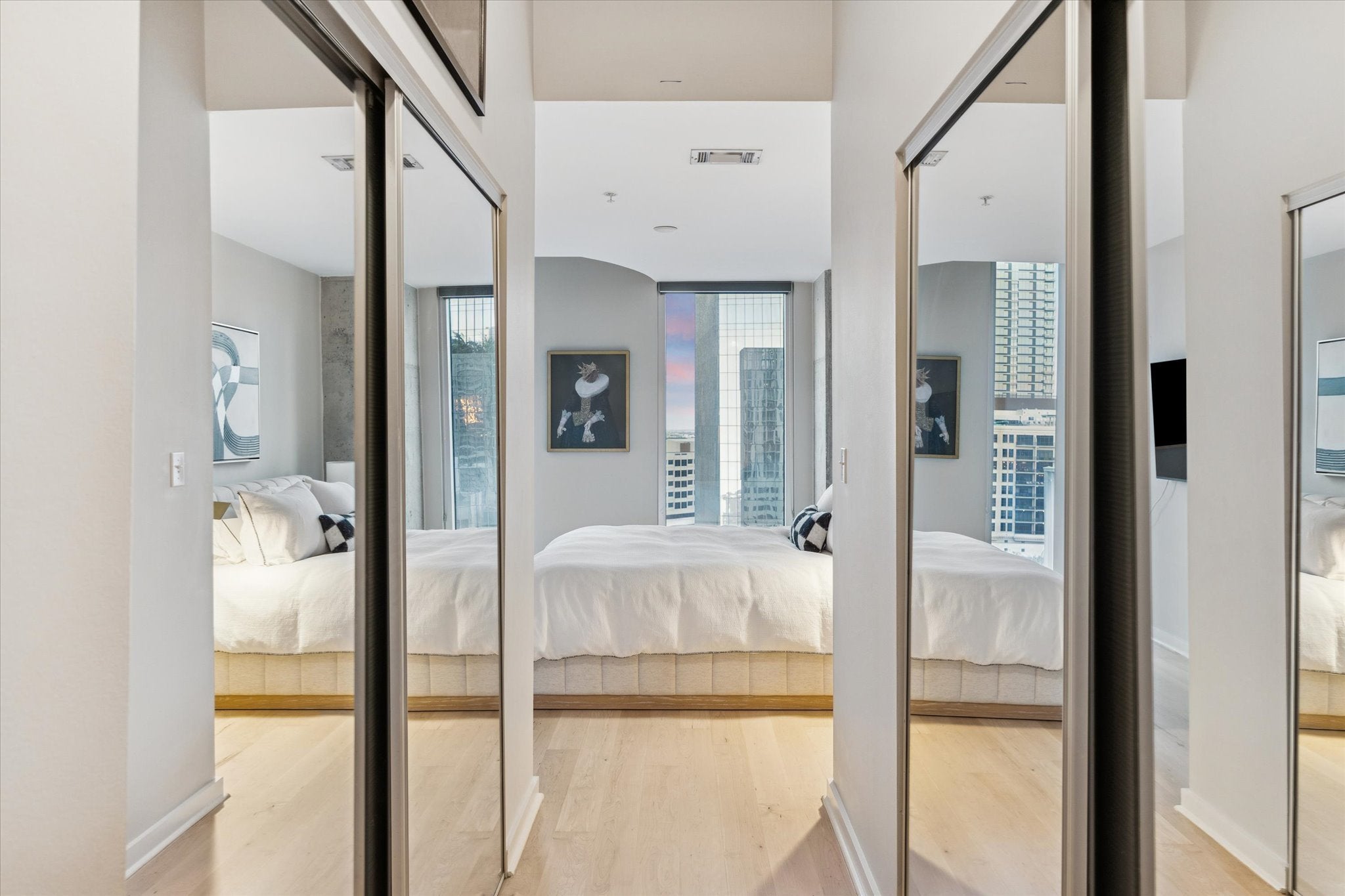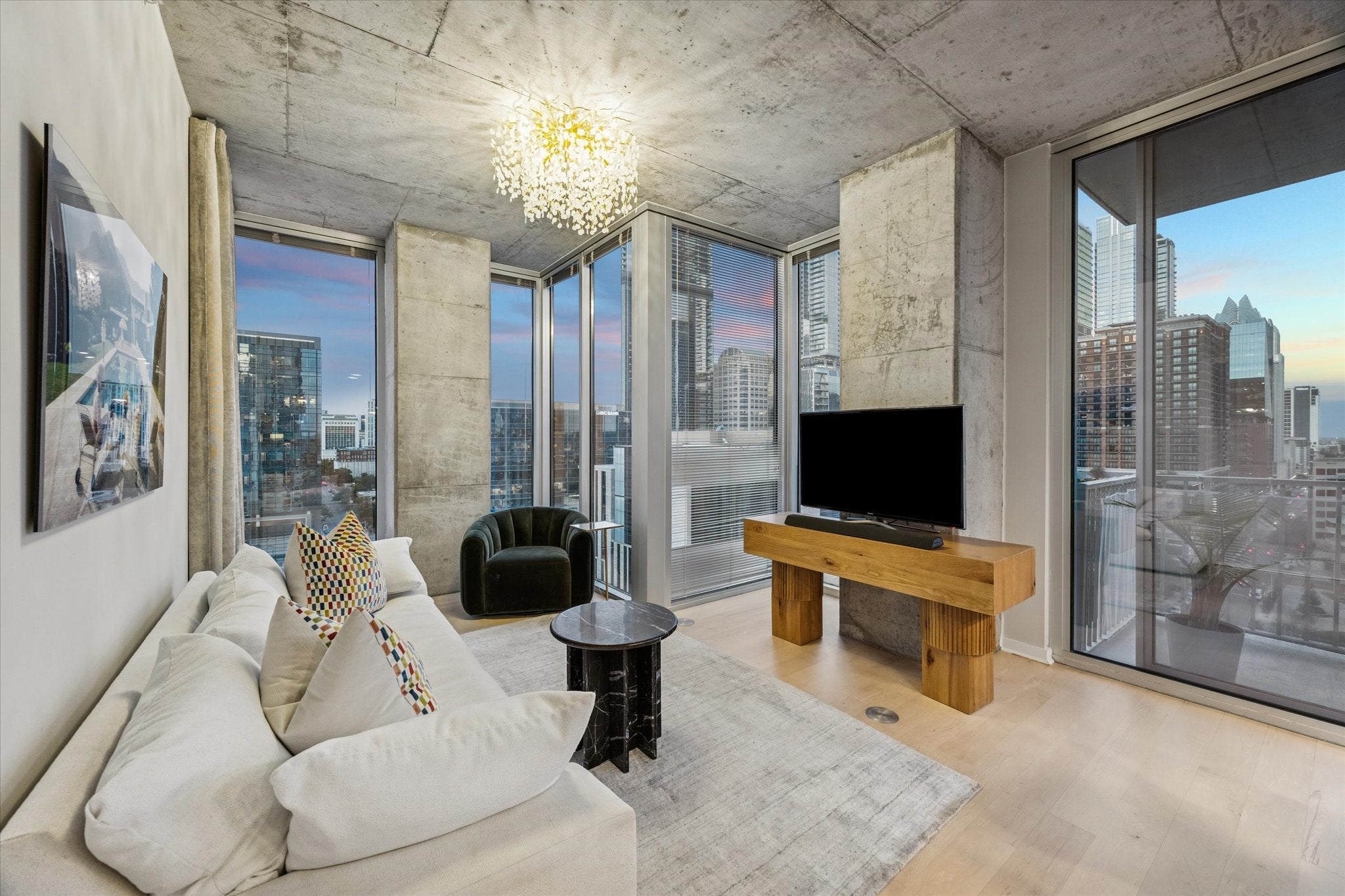 Beautiful completely renovated Northeast corner condo at 360 Condominiums. Every corner of this condo has been updated featuring white oak hardwood flooring throughout, quartz countertops, seamless glass shower with modern tile work, new appliances and so much more. Enjoy floor to ceiling windows with panoramic views of Downtown Austin, bringing in tons of natural light from both the North and East. 2 reserved parking spots. High speed internet included with HOA! Building amenities include 24 hour concierge, fitness center, resort style pool deck, owner's lounge, conference room, game room and dog park. Incredible location in the heart of Downtown Austin! Steps from Lady Bird Lake, Seaholm District, 2nd St District, Whole Foods, West 6th St & all that downtown has to offer.