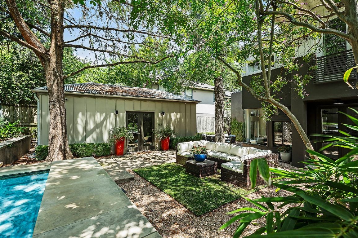 Step into the unassuming, quiet elegance of this professionally designed Bouldin Creek home in the heart of 78704. This updated 1940s bungalow emanates a timeless character while tying seamlessly with its more contemporary home addition. Chic architectural details like stylish built-in storage, display nooks, and recessed window ledges with seating adorn the main living areas. Enjoy beautiful rows of custom built-in storage in the combined formal dining/seating space with ample room for a large dining table or sofa. Functional and inviting custom kitchen with limestone countertops, a Wolfe brand gas range, and a stainless steel appliance suite situated underneath a bright vaulted ceiling. The lovely and luminous secondary living area towards the back of the home features a wood-beamed ceiling and 90-degree window seating with views of the gorgeously green backyard. Upstairs is the one-of-a-kind primary suite featuring custom storage options and an architectural half-wall that envelopes the sleeping area. Truly modern and private ensuite with sky-high ceilings, designer lighting selections, and a stand-alone clawfoot tub. The home’s showstopping backyard is professionally and sustainably landscaped with tiered beds featuring natives and mature trees. This beautiful oasis also incorporates lush grasses and shrubs along stone walkways that lead to a sparkling pool at the corner of the property, your sanctuary from our hot Texas summers. A beautiful detached casita is sure to impress guests with its vaulted light wood ceiling and full bath with a sliding privacy door. Situated just a block away from Auditorium Shores at Town Lake, The Long Center for the Performing Arts, and some of Austin’s best dining, you will enjoy a feeling of seclusion and exclusivity while being a stone’s throw from iconic area amenities and hotspots and just 5 minutes from downtown Austin.