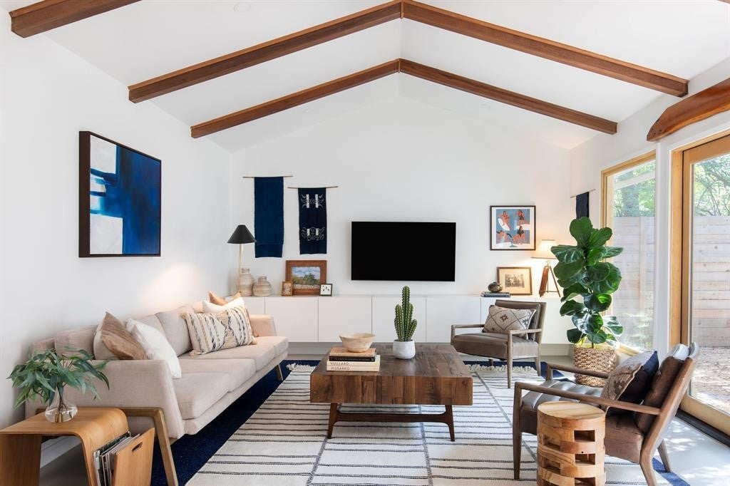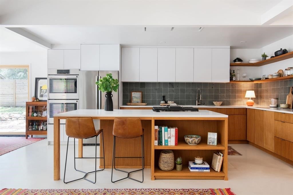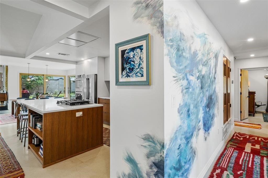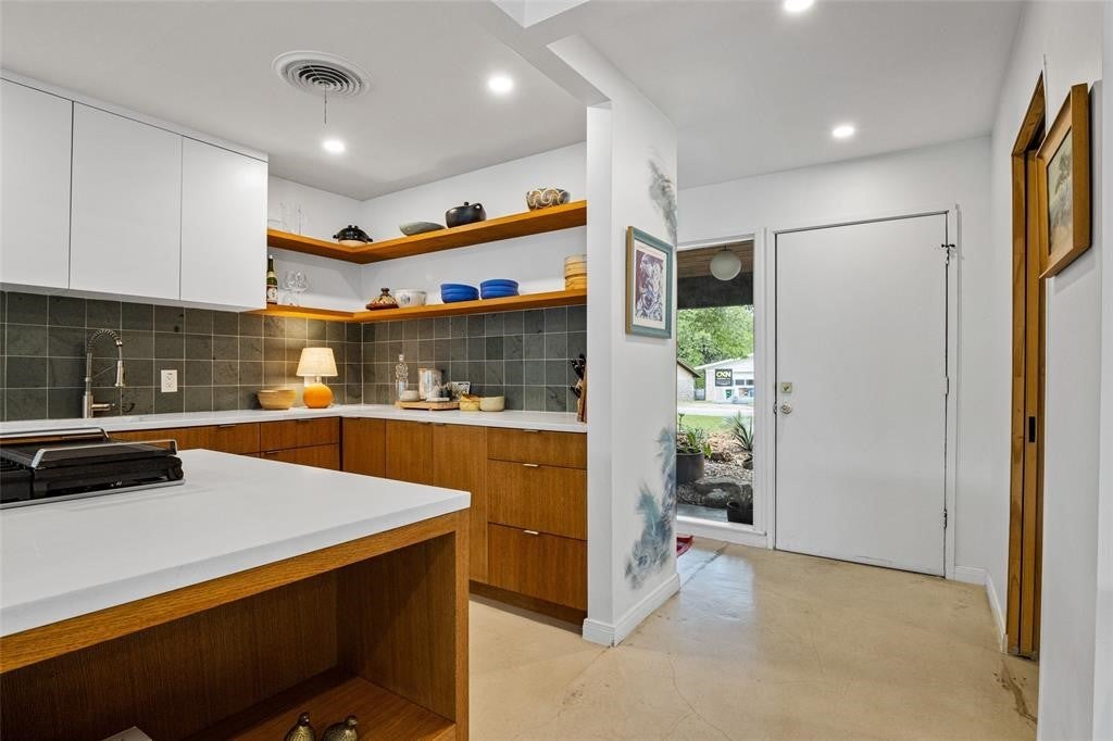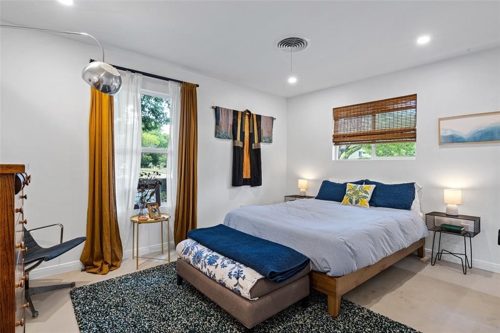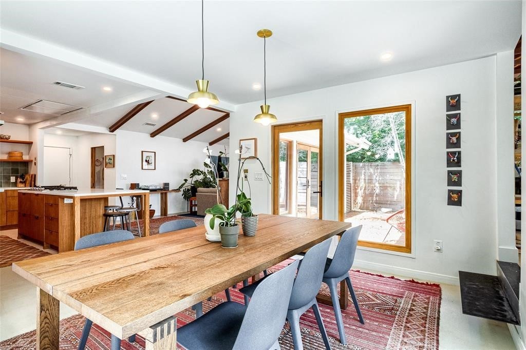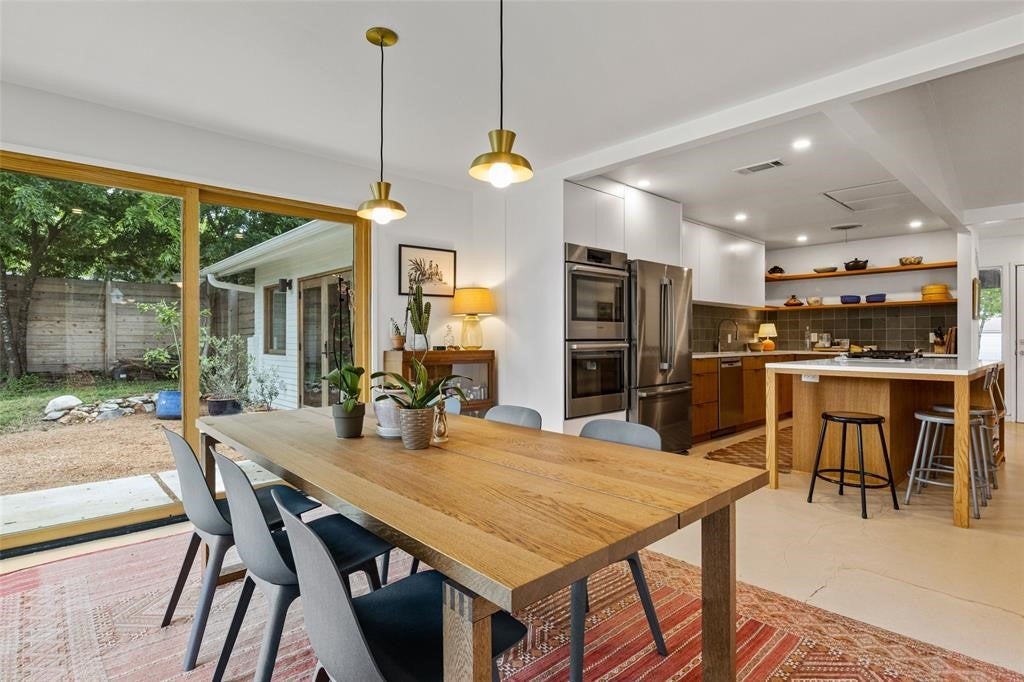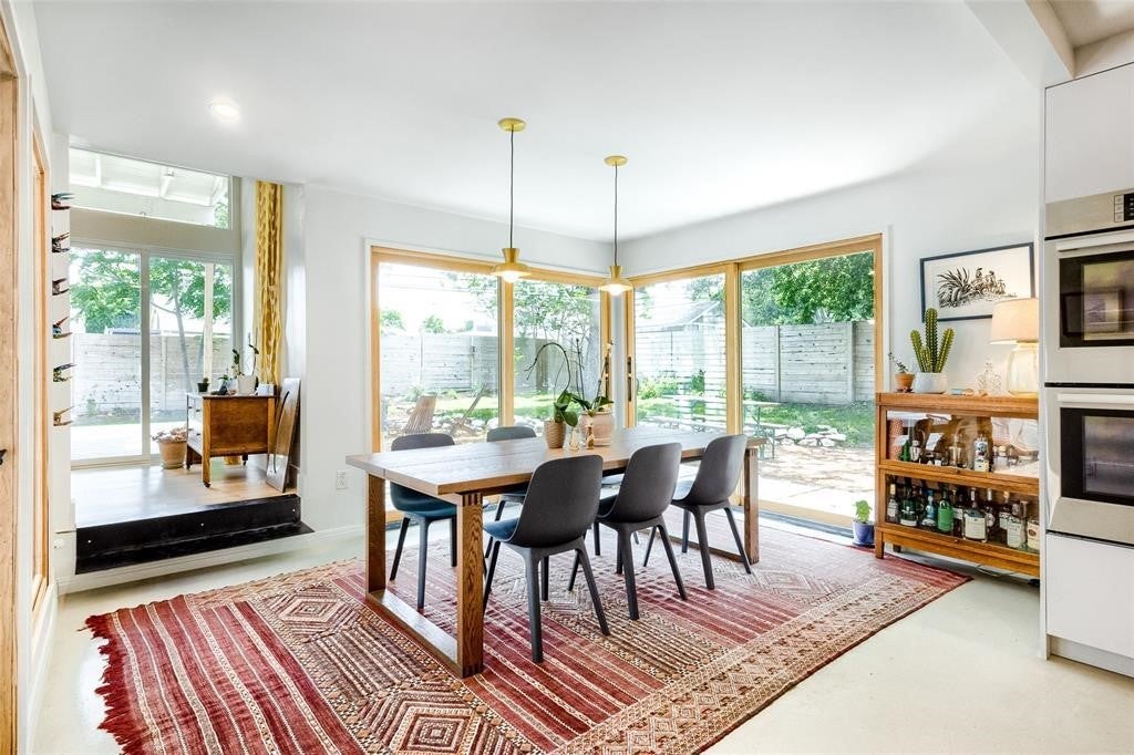 Featured in DWELL Architectural Magazine, this mid-century modern home was thoughtfully renovated and designed by and for the owner. This home is truly unique in a neighborhood that is seeing a lot of investment. Location, location! The East Travis Heights location is as good as it gets; only 5 minutes away from downtown, East Austin, and the Lady Bird Lake Hike & Bike Trail. This mid-century ranch style home preserves the character of its original personality with upgraded aesthetic and functionality for a modern lifestyle. The design features flat, modern walls, concrete flooring and a stunning open kitchen that is a chef's and entertainer's dream. This home boasts incredible natural light throughout the day. The zen garden off the living room is perfect for your morning meditation or evening wind-down. The back "studio" room, currently set up as a work-from-home/artist's room, can easily be transformed into a formal third bedroom (see attached design/construction plans for ideas and contact the agent for more details). The free-standing wood burning stove, tall ceilings with exposed wood beams, and array of windows make this room a jewel of the home. The primary bedroom has a large walk-in closet, backyard access, and an en suite bath with an oversized walk-in shower. The renovation included the build-out of a gorgeous laundry room with plenty of counter space and cabinets, plus a generously sized built-in pantry. As you approach from the street, be sure to take note of the local artist mural which is beautifully showcased by the wall of windows in the front hallway.