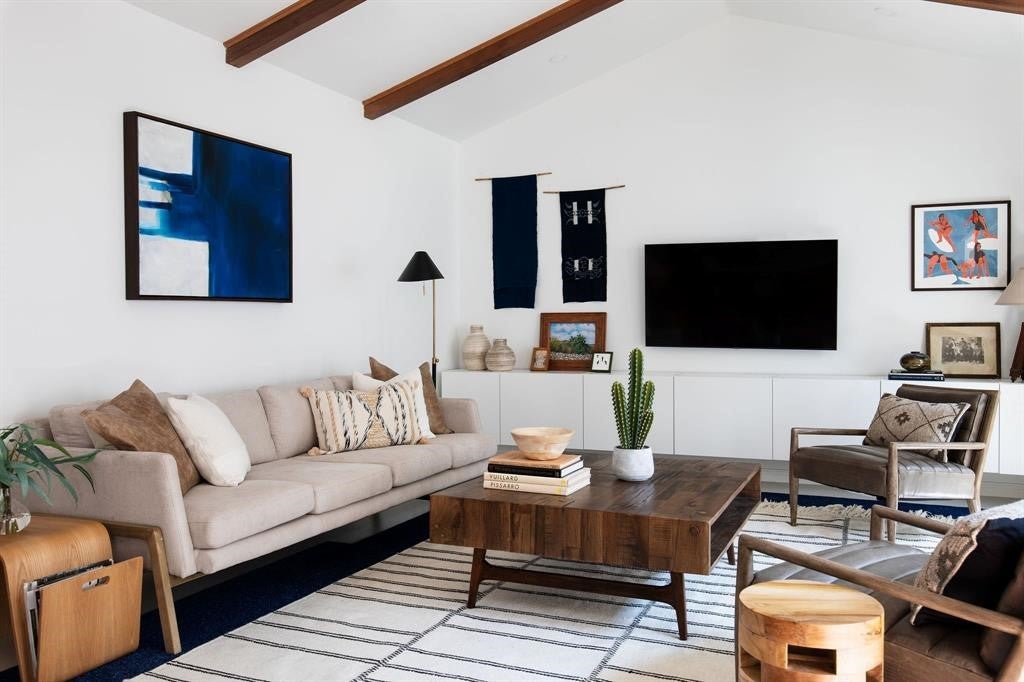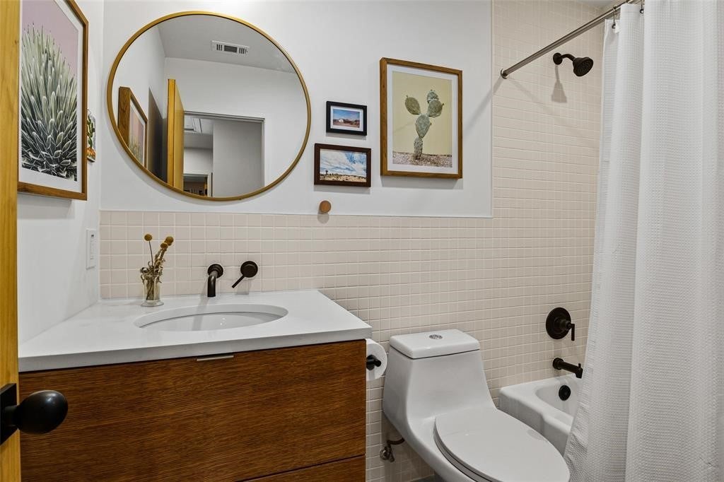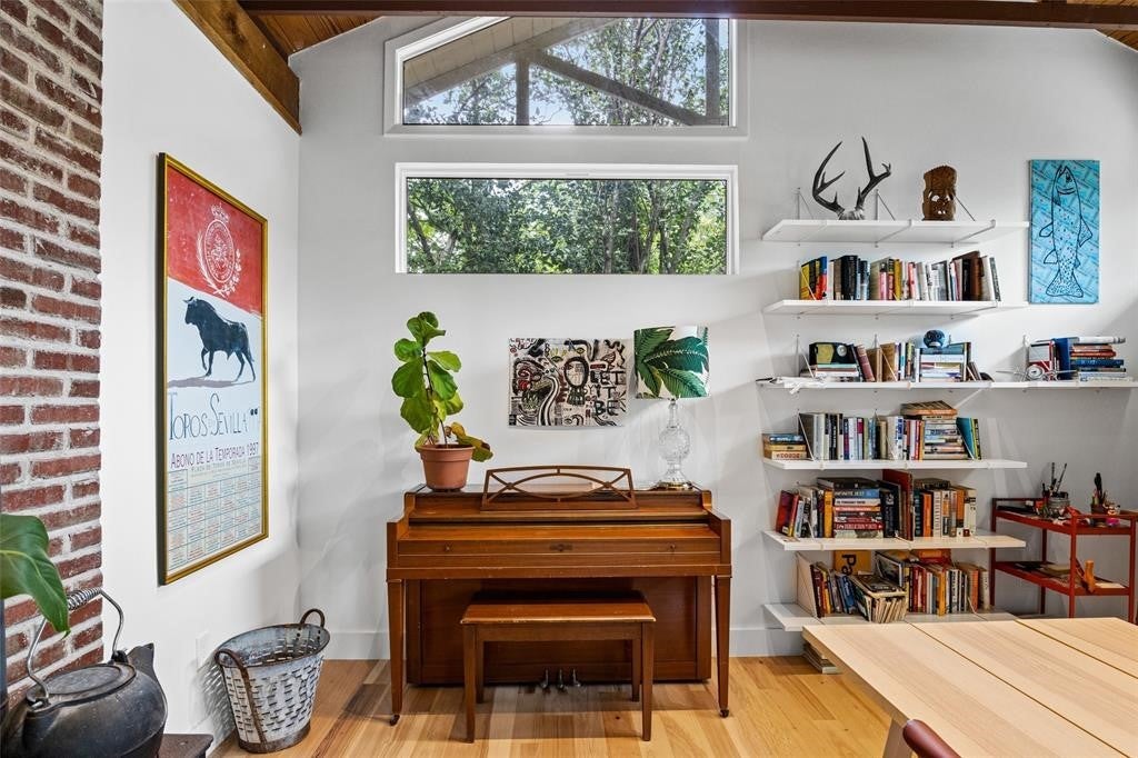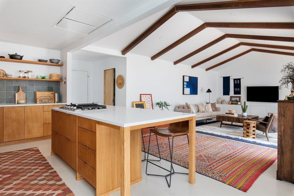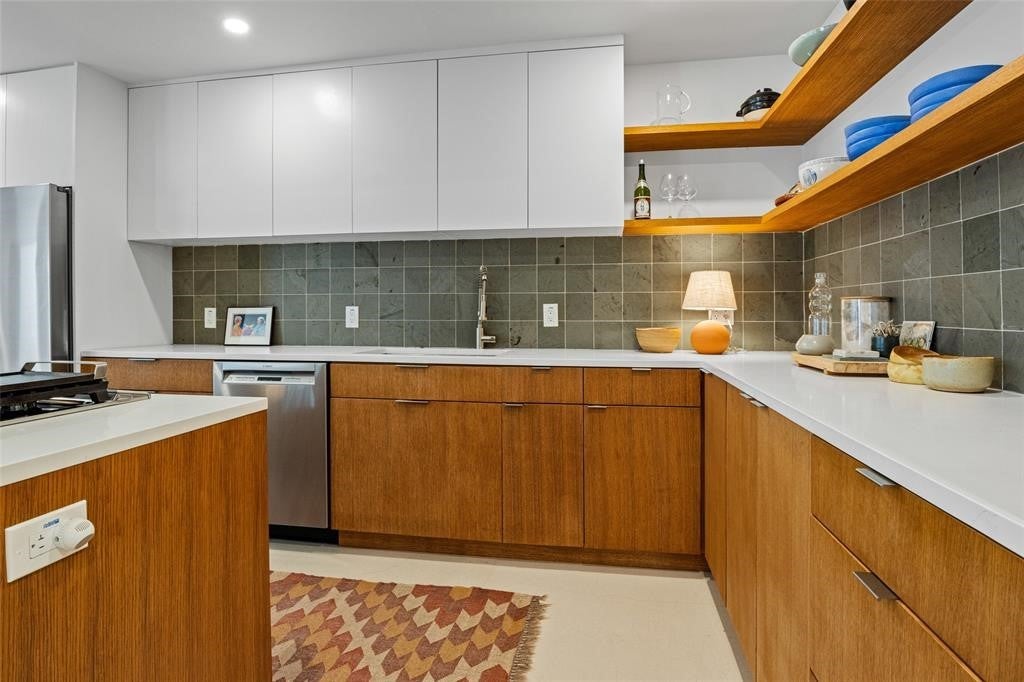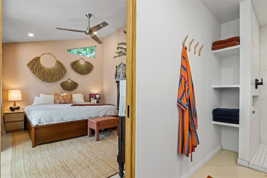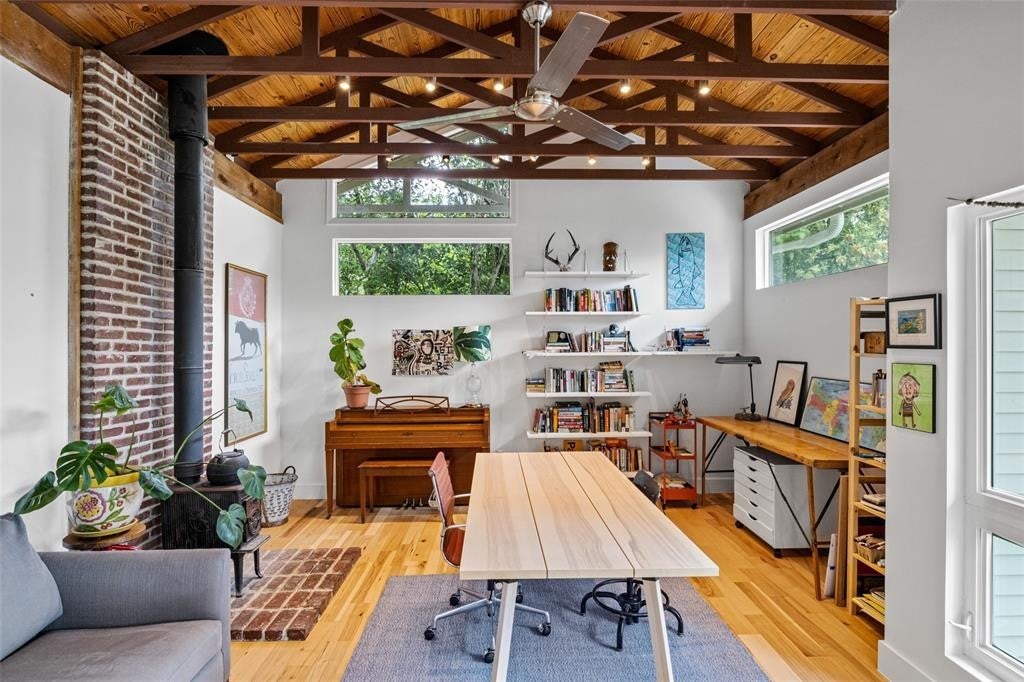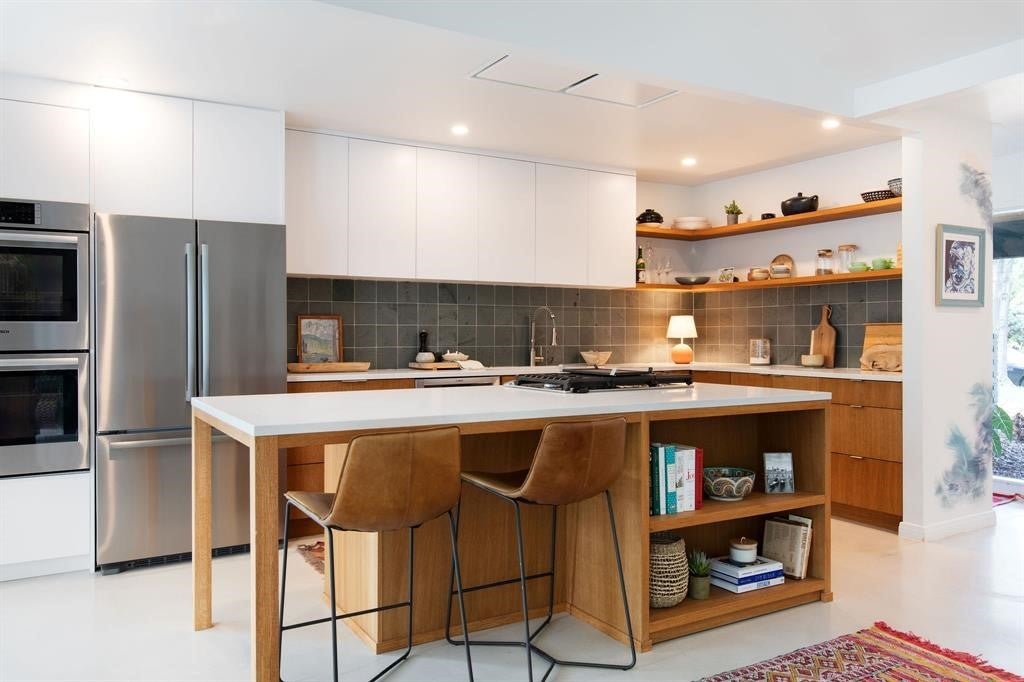 Featured in DWELL Architectural Magazine, this mid-century modern home was thoughtfully renovated and designed by and for the owner. This home is truly unique in a neighborhood that is seeing a lot of investment. Location, location! The East Travis Heights location is as good as it gets; only 5 minutes away from downtown, East Austin, and the Lady Bird Lake Hike & Bike Trail. This mid-century ranch style home preserves the character of its original personality with upgraded aesthetic and functionality for a modern lifestyle. The design features flat, modern walls, concrete flooring and a stunning open kitchen that is a chef's and entertainer's dream. This home boasts incredible natural light throughout the day. The zen garden off the living room is perfect for your morning meditation or evening wind-down. The back "studio" room, currently set up as a work-from-home/artist's room, can easily be transformed into a formal third bedroom (see attached design/construction plans for ideas and contact the agent for more details). The free-standing wood burning stove, tall ceilings with exposed wood beams, and array of windows make this room a jewel of the home. The primary bedroom has a large walk-in closet, backyard access, and an en suite bath with an oversized walk-in shower. The renovation included the build-out of a gorgeous laundry room with plenty of counter space and cabinets, plus a generously sized built-in pantry. As you approach from the street, be sure to take note of the local artist mural which is beautifully showcased by the wall of windows in the front hallway.