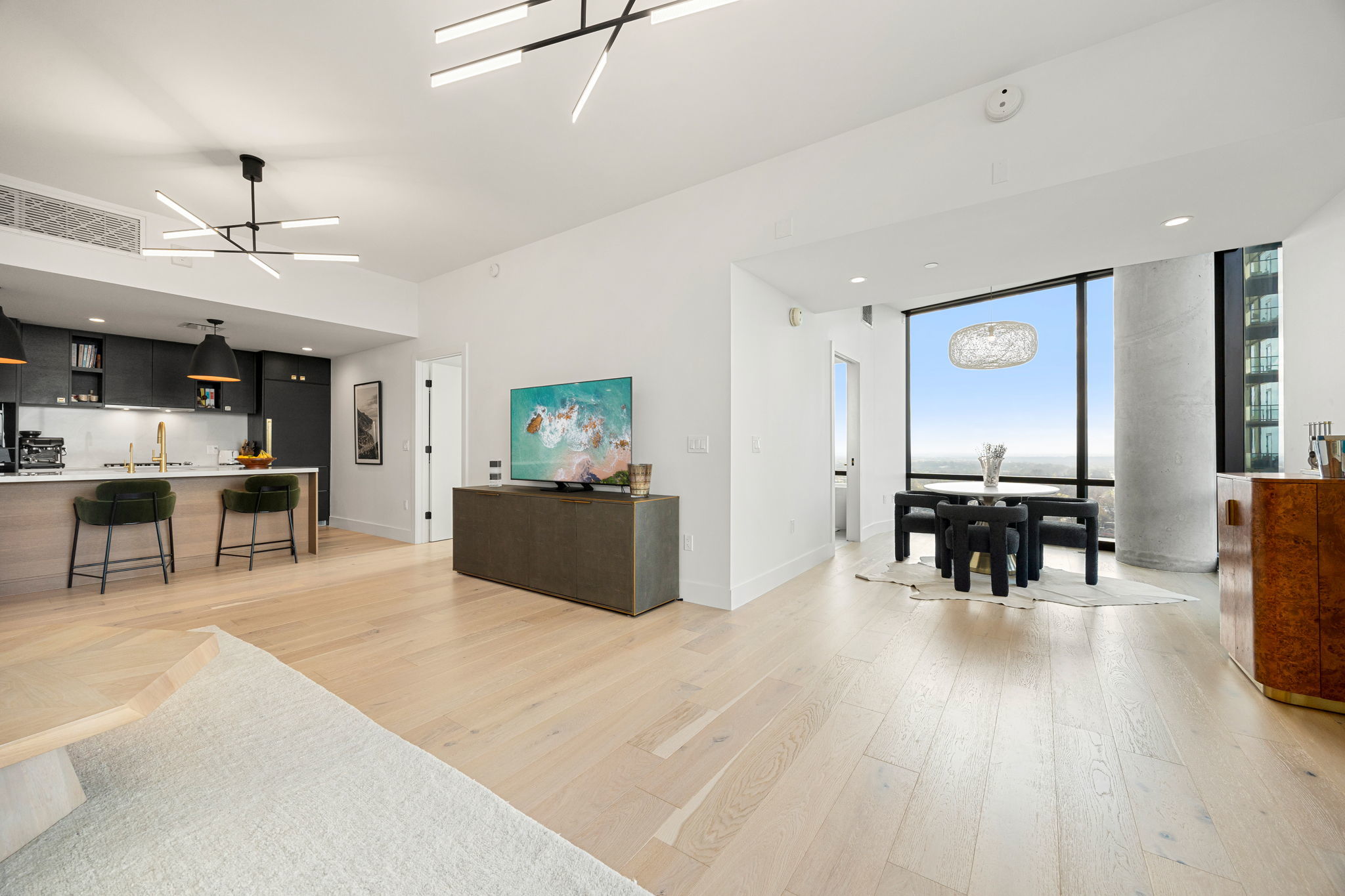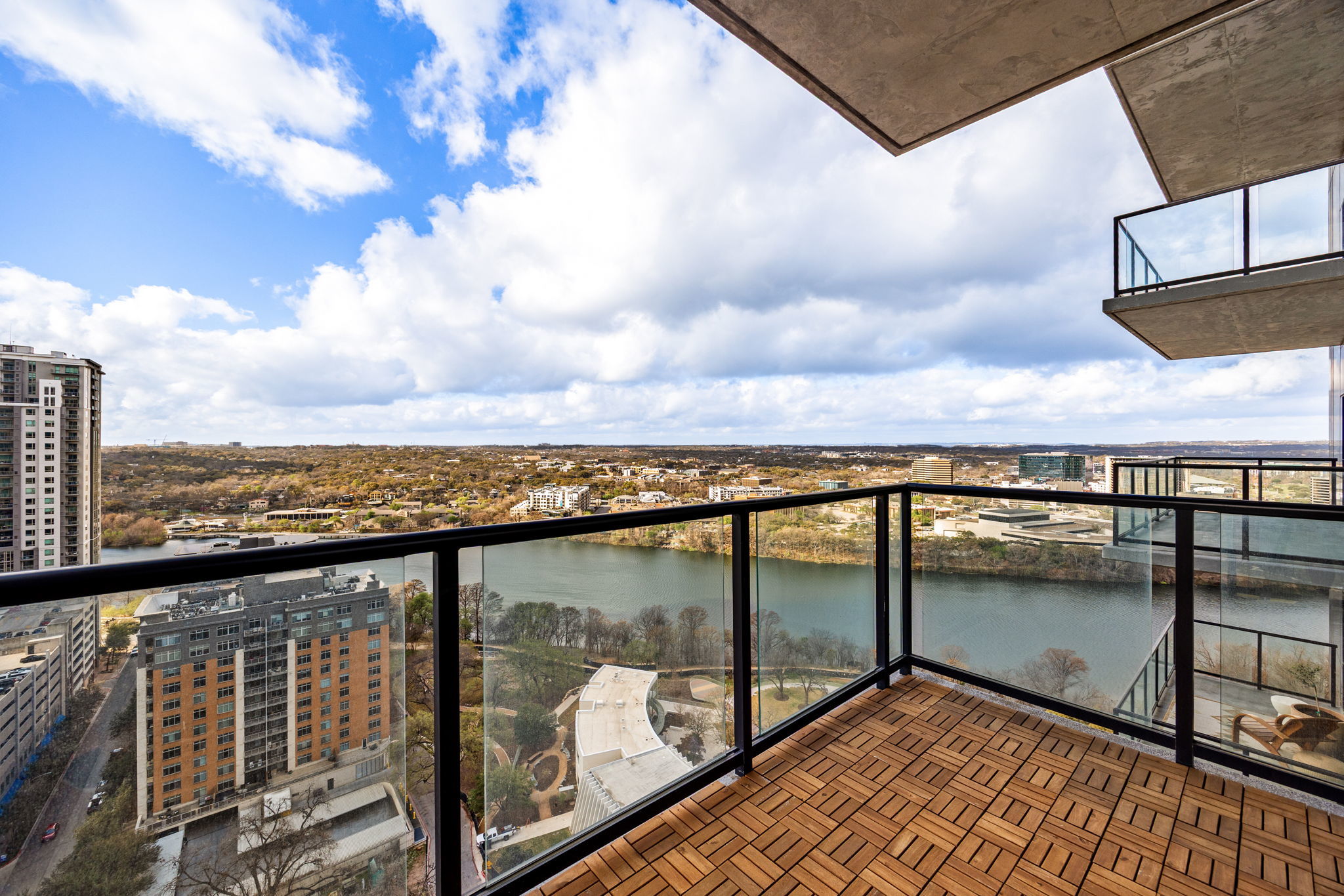 Perched on the 20th floor in the heart of Austin, this rarely available residence offers one of the largest two-bedroom floorplans in the area with sweeping, unobstructed views of Lady Bird Lake. South and southeast-facing floor-to-ceiling windows flood the home with natural light from sunrise over the water to golden sunsets reflecting across the skyline. Located in the heart of the vibrant Rainey Street District surrounded by acclaimed restaurants, nightlife, and boutique shopping while enjoying elevated privacy above it all. Directly adjacent to the beautifully renovated Waterloo Greenway, miles of scenic walking and biking trails, lush landscaping, and waterfront paths are right outside your door. Inside, refined finishes and thoughtful upgrades define the space. Custom kitchen cabinetry with designer hardware pairs seamlessly with top-of-the-line Miele appliances, quartz and marble surfaces, and rich white oak hardwood floors. A smart home system controls HVAC, security cameras, and motorized shades in the bedrooms and bathrooms add effortless comfort. Resort-style amenities include a rooftop infinity pool overlooking the city, hot tub, firepits, a state-of-the-art fitness center with sauna and yoga deck, private theatre, owners lounge, pool table, outdoor grills, dog walk area, and regularly hosted HOA events. A 24-hour concierge and gated garage provide exceptional security and convenience. Turnkey property offered fully furnished with curated pieces from Restoration Hardware, CB2, and Four Hands, this is a true move-in-ready luxury experience above the city.