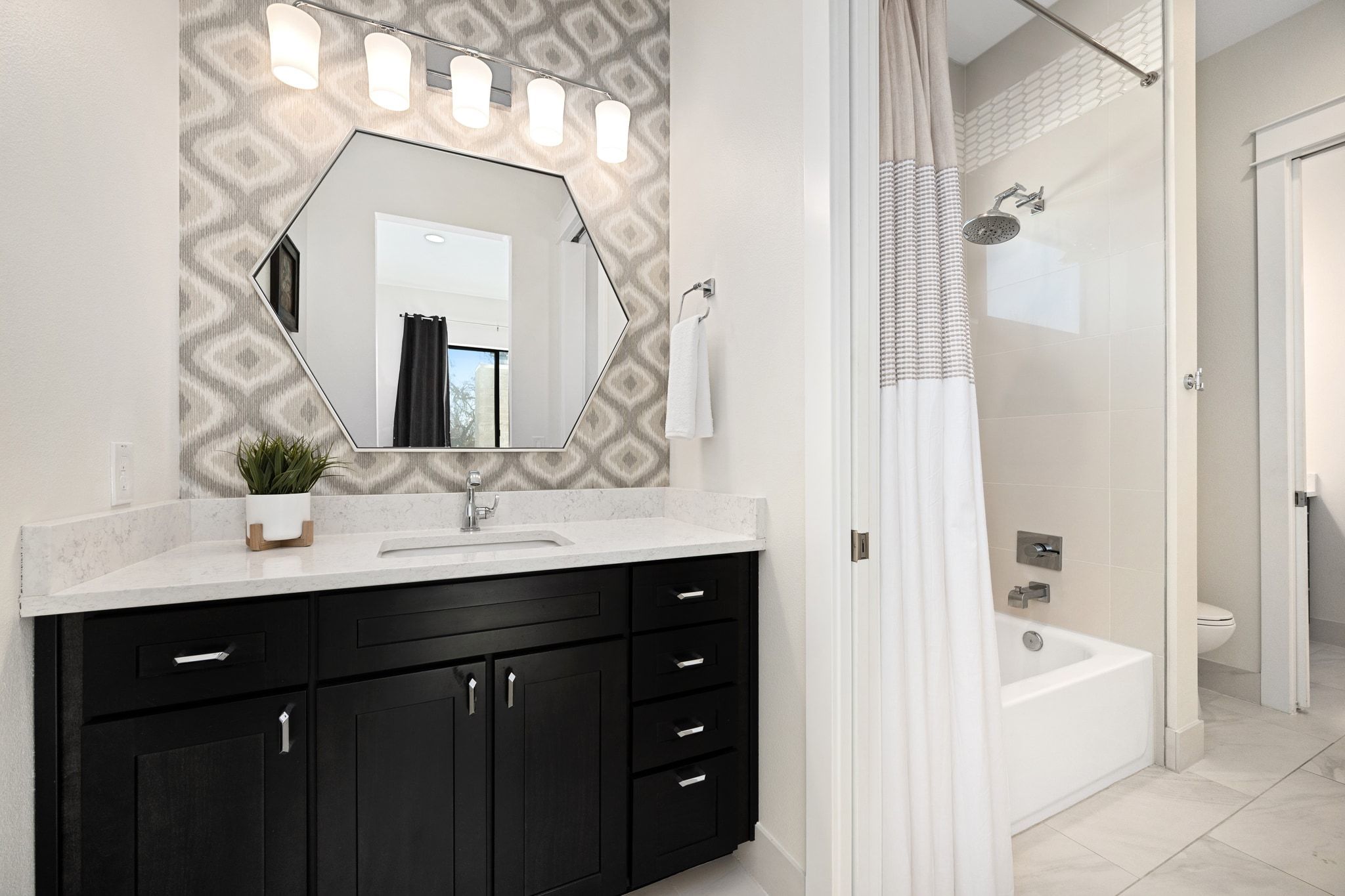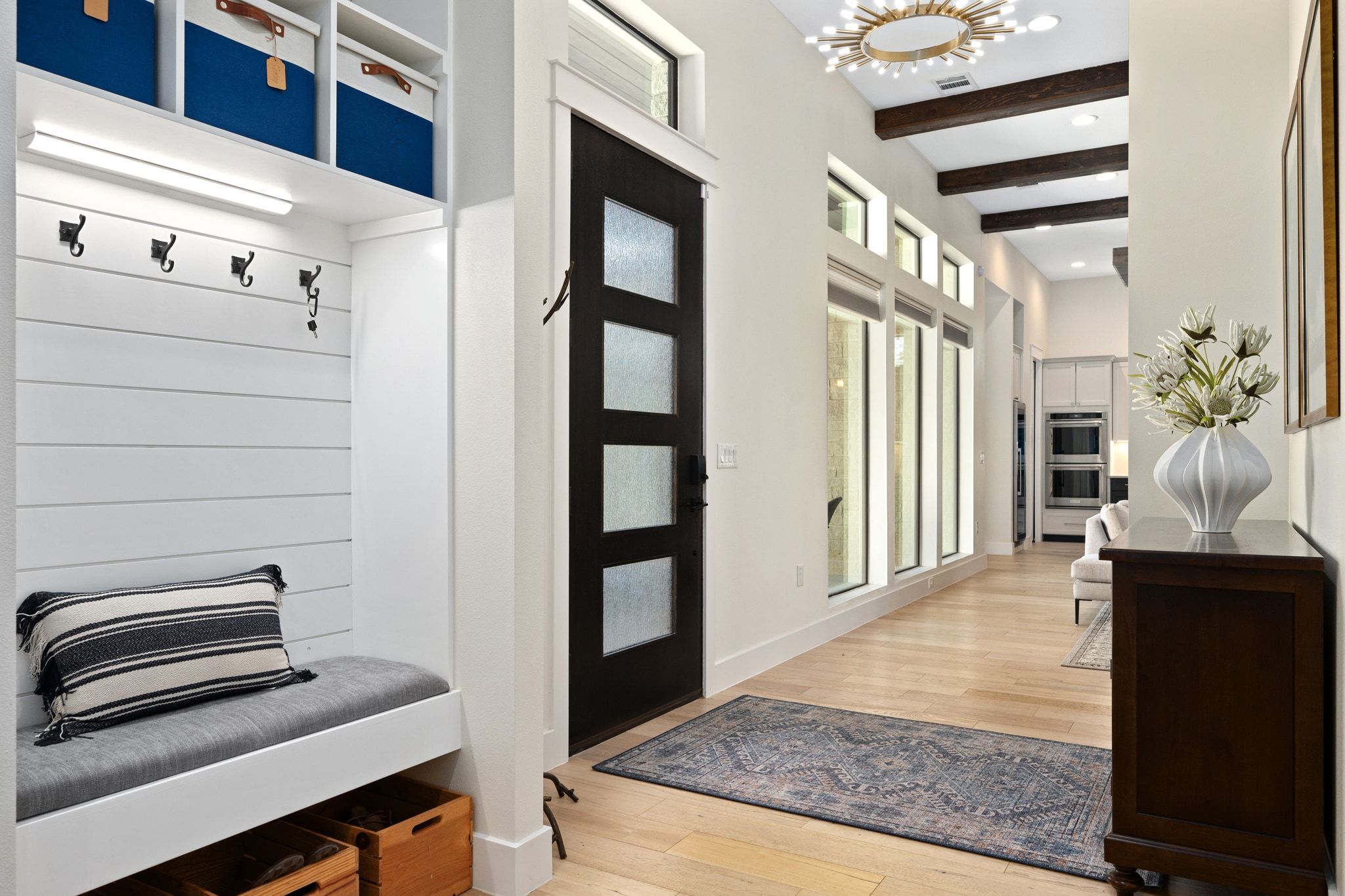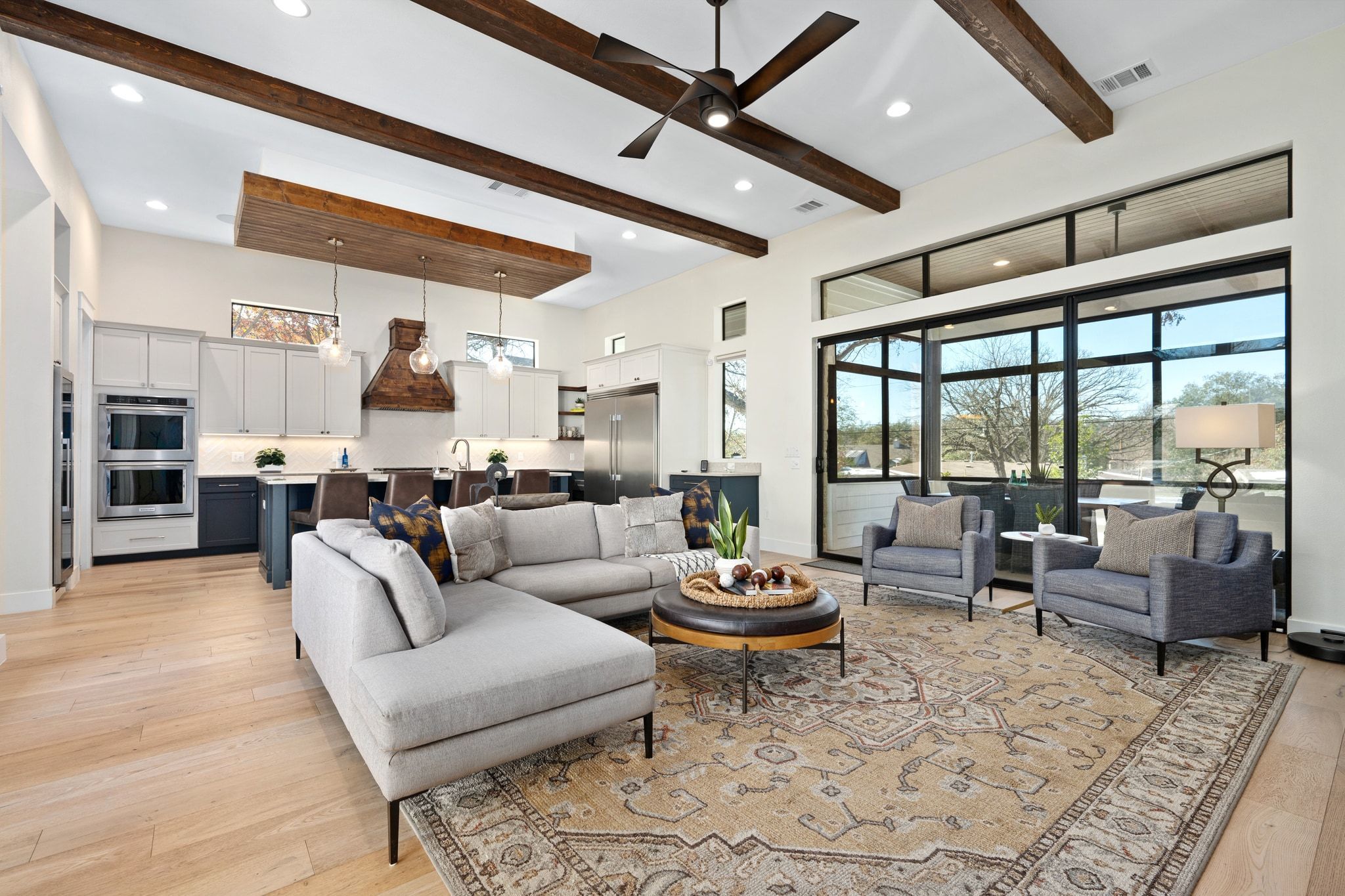 Situated in the heart of Allandale, this stunning 2019 custom-built home seamlessly blends modern design with everyday comfort. Flooded with natural light from dramatic floor-to-ceiling windows, the home showcases an open, yet intentional layout designed for both entertaining and easy living. The living area is highlighted by exposed wood beams and a built-in sound system, while the dining area is set apart in its own dedicated space, perfect for hosting gatherings. At the heart of the home, the chef’s kitchen impresses with quartz countertops, custom cabinetry, a large-capacity wine fridge, and thoughtful finishes that combine beauty with function. Hunter Douglas custom window treatments add both sophistication and privacy, complementing the home’s clean lines and timeless aesthetic. The thoughtful floor plan flows beautifully, featuring a serene primary suite on the main level in addition to a versatile fifth bedroom that doubles perfectly as a private office. Outdoor living is equally exceptional. A large front patio creates a welcoming first impression, while the beautifully screened-in porch and covered outdoor kitchen extend the living space for year-round entertaining. The spacious backyard offers privacy, lush landscaping, and ample room for a future pool while still leaving plenty of space to play. Landscaping was designed and installed by D Crain. Meticulously maintained and truly move-in ready, this home offers custom quality, elevated finishes, and effortless functionality in one of Austin’s most sought-after neighborhoods.
