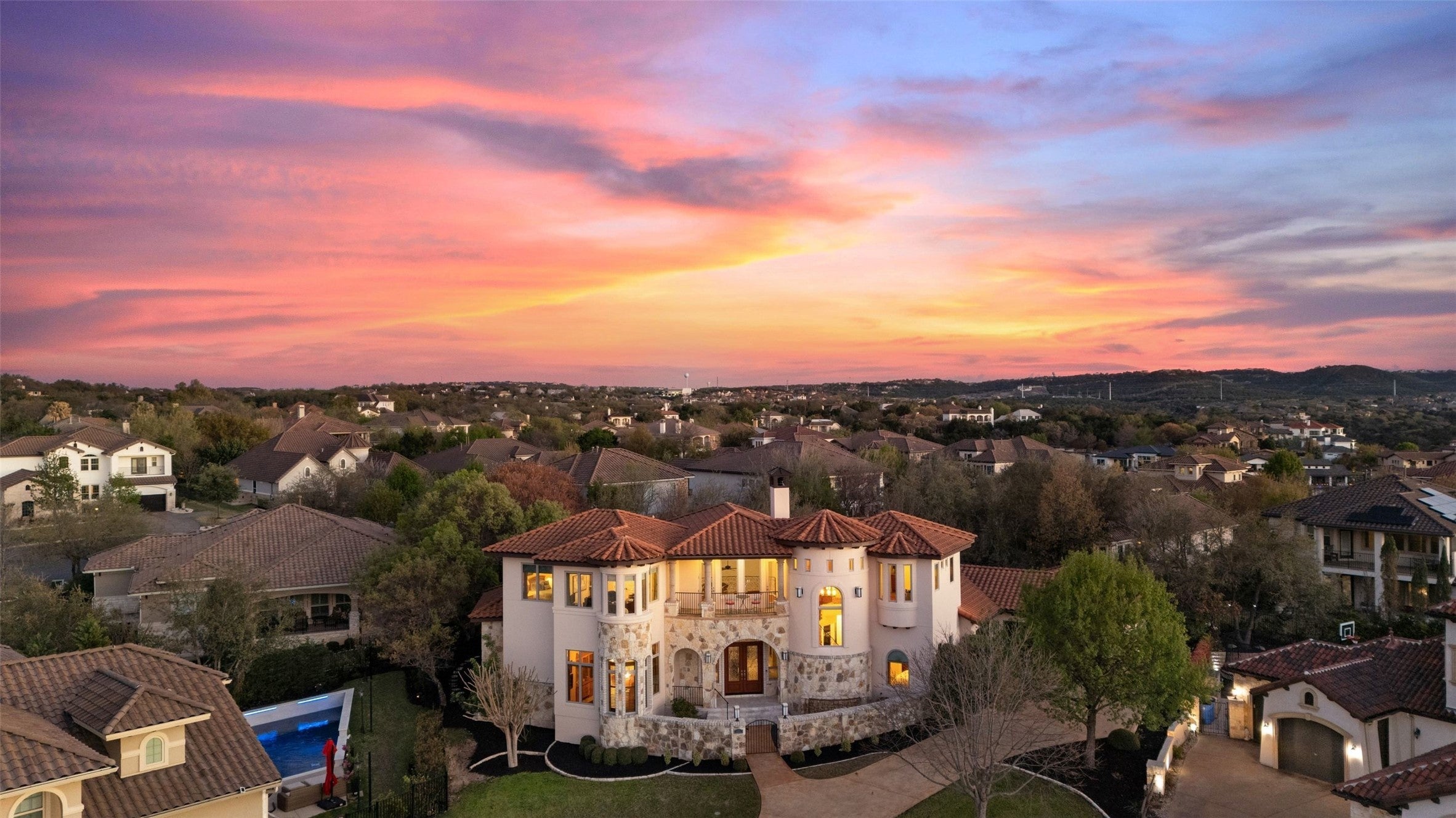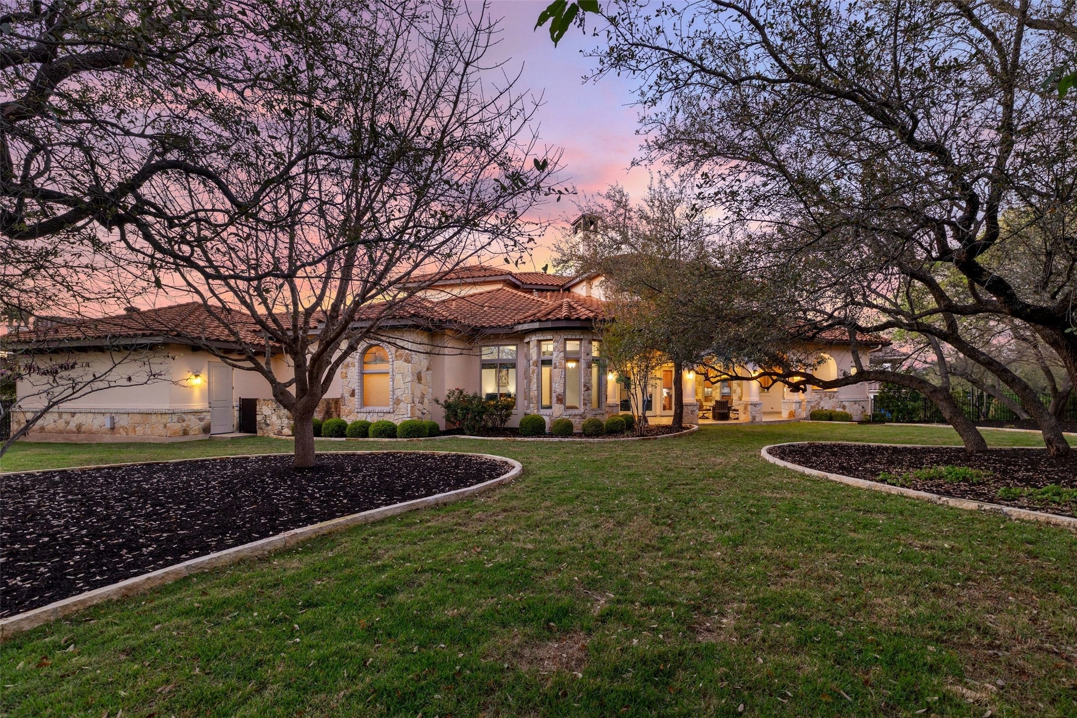 Welcome to Mediterranean-style living at the lake.Designed by Vanguard Studios and built by Masters Touch Builders in 2012, this stone and stucco home features approximately 80 tons of stone, a Mexican concrete tile roof, and a charming courtyard with fountain.The 4,797± sq. ft. residence sits on a beautifully landscaped 0.497-acre wooded lot and offers 5 beds, 4 full baths, and 2 half baths.The main level includes a library, dining room, spacious kitchen with large pantry, breakfast area, living room with fireplace, primary suite, guest suite and laundry room.The kitchen features a tray ceiling with crown molding, recessed lighting, a 9’ x 4’ granite island with vegetable sink, granite countertops, stained wood cabinetry with deep drawers, pull-out spice racks, and specialty storage. Appliances include an LG French door refrigerator, Bosch electric cooktop, microwave, double ovens, and a Whirlpool dishwasher. The library is prewired to convert to a media room. The primary suite features a coffered ceiling, patio access, and a turret-style sitting area with domed ceiling and tall windows overlooking the rose garden. The primary bath includes a walk-in tiled shower with seating, dual vanities and air jet tub. Upstairs, accessible by a spiral staircase or the elevator, are three additional bedrooms and a lofted party room overlooking the living room.One bedroom has an en-suite bath while two share a full bath, with lake views from many rooms including the balcony.The landscaped grounds feature towering live oaks, flowering trees, rose bushes, and space for a future pool.Located about 30 minutes from downtown Austin in The Enclave at Rough Hollow on Lake Travis, residents enjoy lake access, Hill Country views, trails, pools, fitness center, Canyon Grille, and the Rough Hollow Yacht Club/Marina.Rough Hollow offers an unparalleled lakeside lifestyle close to dining, shopping, golf and tennis.It's all here waiting for you to live the "Rough Life."