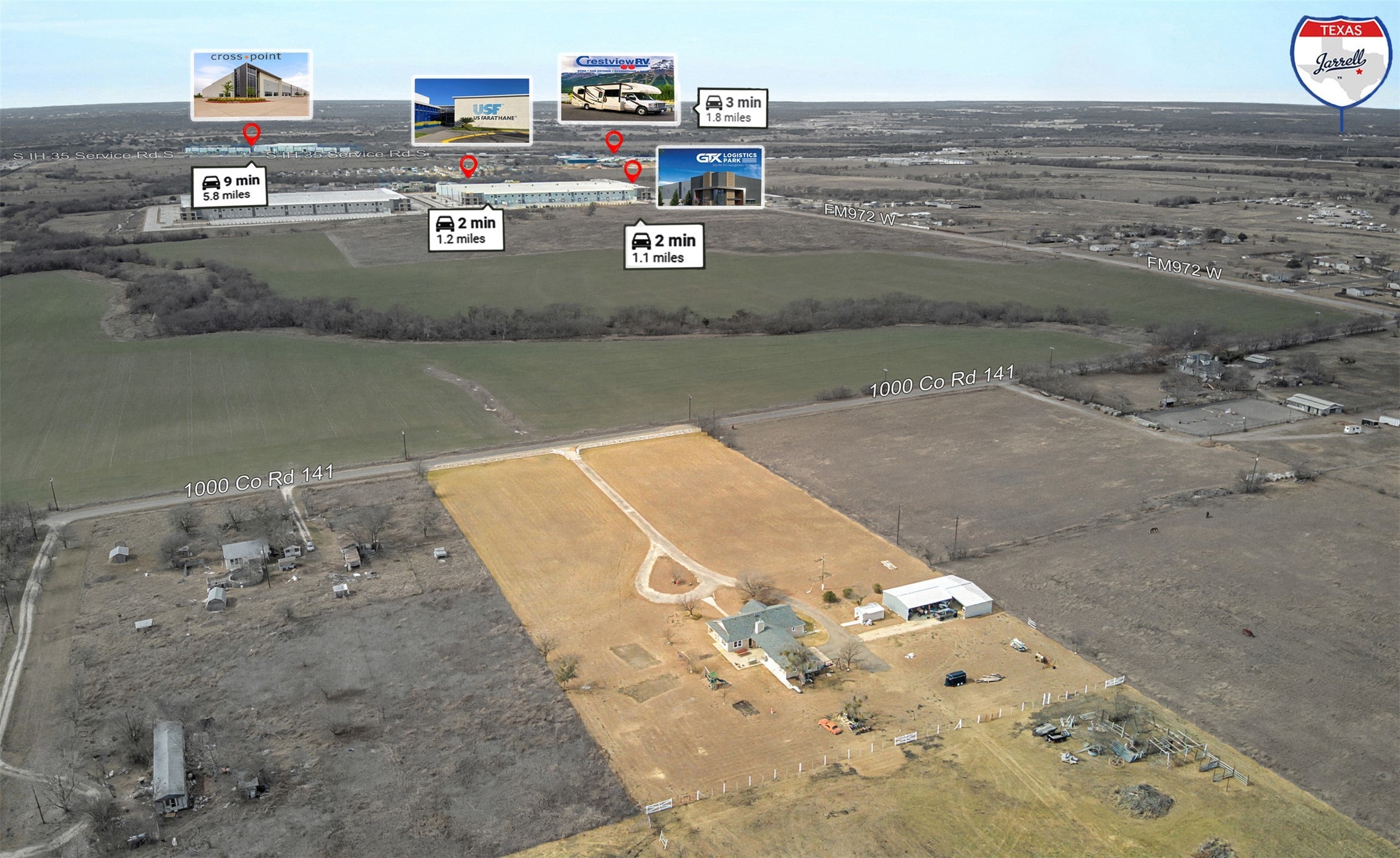 Located just one mile from Interstate 35 in a strong corridor and commercial development area, this 22-acre tract offers a rare opportunity to control a highly flexible development site in the Georgetown ETJ with no zoning restrictions. This property's location makes it ideal for investors, developers, or owner-users seeking scale, access, and long-term upside. It has quick access to I-35, SH 130 tollway, Ronald Reagen, and the Georgetown Municipal Airport. The site stands to benefit from major regional mobility investments, including Williamson County’s future Arterial K and Ronald Reagan Extension. Currently under agricultural use, the site includes a well-maintained 1,713 SF residence suitable for conversion to office, live/work space, or on-site management. Recent updates include new windows and roof (Sept 2025) and a new indoor HVAC unit (Oct 2025). Additional improvements include an approximately 2,500 SF metal equipment/storage building and a detached oversized two-car garage, providing functionality for immediate operations or hold strategies during future planning. Electric service, gas, well, and septic are in place. PEC three-phase power and a Jonah Water line are located directly across the road, supporting future expansion. The land is generally level and conducive to development. An Oncor transmission line crosses the property with an approximately 100-foot easement; however, with more than 1,000 feet of depth on both sides, the tract maintains substantial contiguous buildable area and site planning flexibility. The property can accommodate a variety of concepts including light industrial, flex or warehouse, contractor yard, storage, RV park, manufactured housing, etc. 1050 CR 141 delivers location strength, infrastructure presence, and scalability in one of Central Texas’ most active growth corridors. Buyer(s) and buyer agent(s) should perform their own due diligence square footage, zoning, property type, and all information.