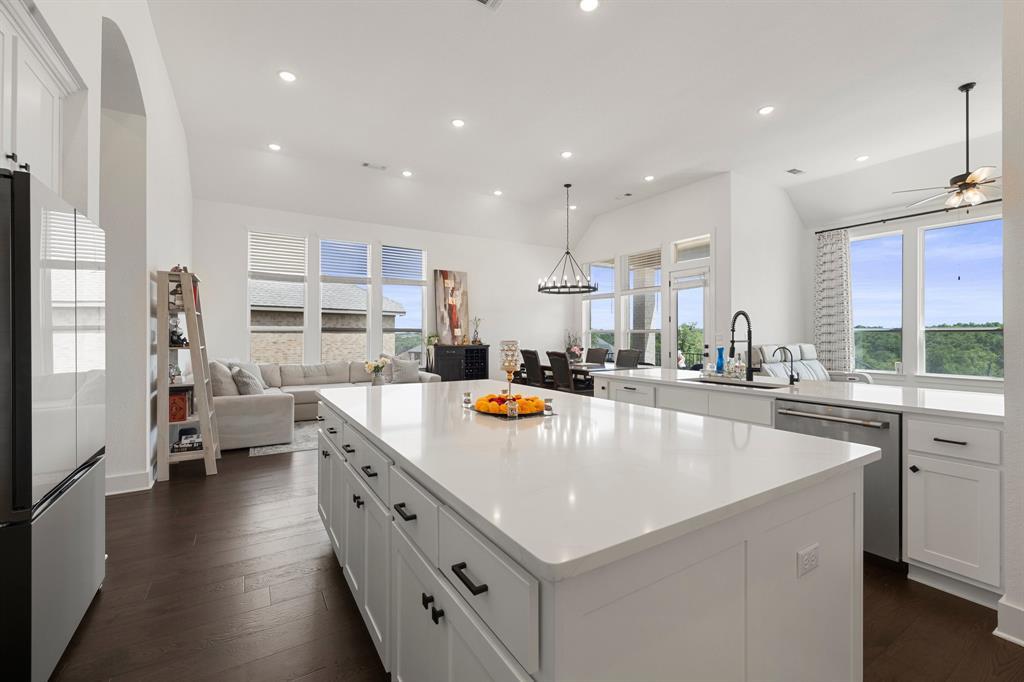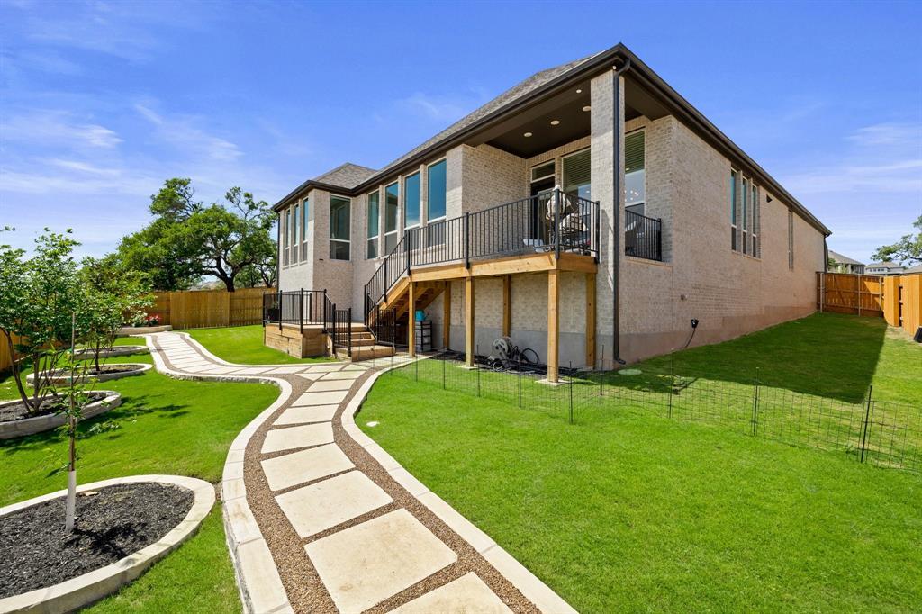 One-story home on an oversized 60’ lot, located on the Leander ISD side of the community. Less than three years old, this Highland Homes Plan 216 offers a functional layout with extensive interior and exterior upgrades. The home is north-facing and designed for comfortable everyday living and entertaining. The kitchen is a standout feature, offering an oversized center island, abundant cabinetry, generous prep space, and an open layout that connects seamlessly to the main living areas. High ceilings and a wide entry enhance the sense of space throughout the home. The floor plan includes multiple living areas, a private office, and a media or flex room, providing flexibility for a variety of needs. Interior upgrades include custom roller shades and blinds throughout and a built-in beverage cooler. The backyard has been professionally improved and features a custom wood deck, extended covered porch, stone walking paths, solar landscape lighting, mature landscaping, and a level, usable lawn. Additional exterior site improvements include a discreet trash bin platform. The 3-car tandem garage has been upgraded with epoxy-coated flooring, custom cabinetry, and additional overhead storage. Approximately $45,000–$60,000 in owner improvements have already been completed, offering immediate usability without post-closing projects. Zoned to Parkside Elementary, Stiles Middle, and Rouse High School, this home presents a well-appointed, move-in-ready opportunity within Leander ISD.