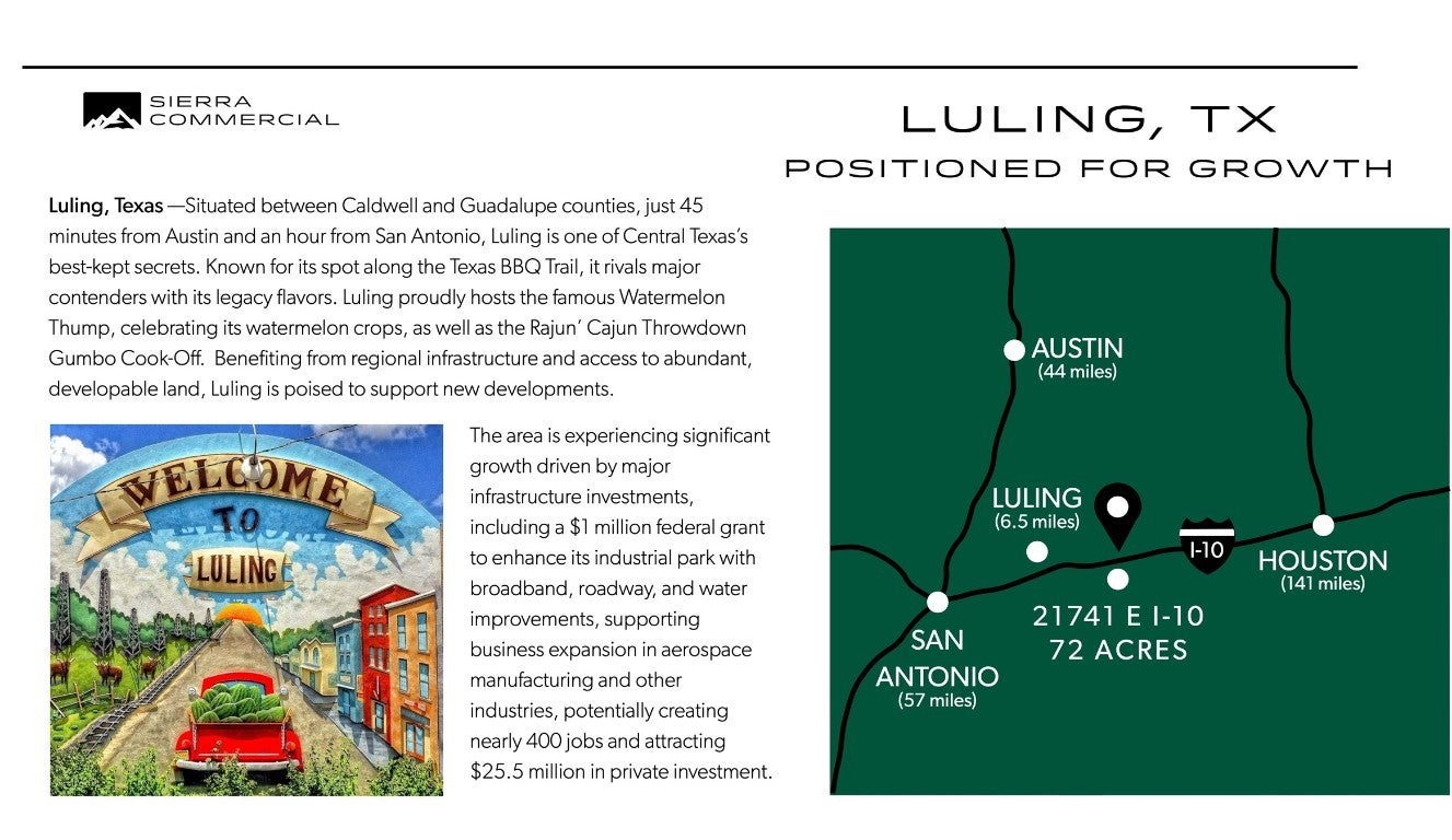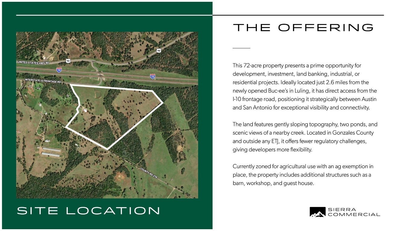 This 72-acre property, currently zoned for agriculture, pasture, and timberland, offers significant commercial potential due to its strategic location off the I-10 frontage road and CR 278 in Gonzales county. Located just 2.6 miles from the new Buc-ee's at 10070 I-10, Luling, TX 78648, this land is poised for future development. Gonzales County Water Corp has water line running along the property line. The Texas Department of Transportation (TXDOT) is expanding the I-10 corridor, with project completion anticipated by the end of 2025, further enhancing the value and accessibility of this prime property. Low tax rate of 1.47%. AG exemption. Ideal for investors and developers looking to capitalize on the growth in the area.