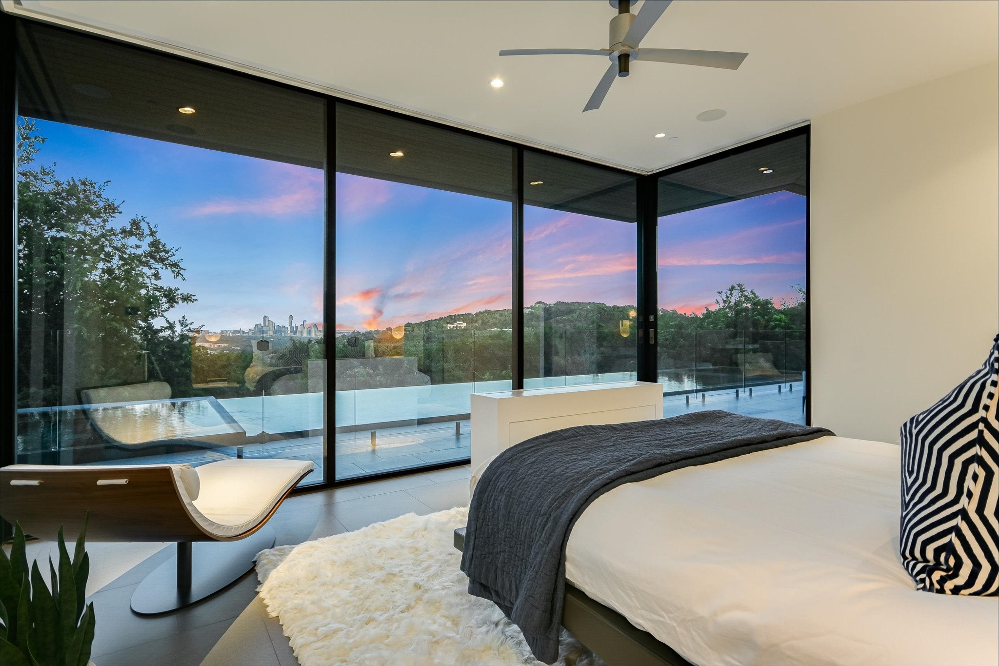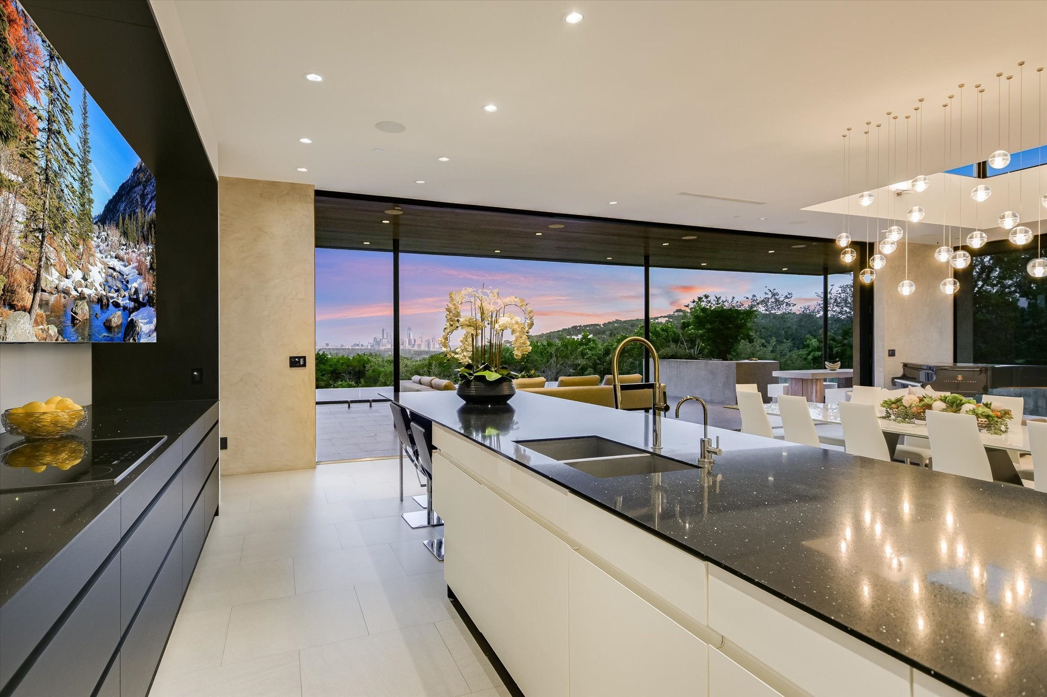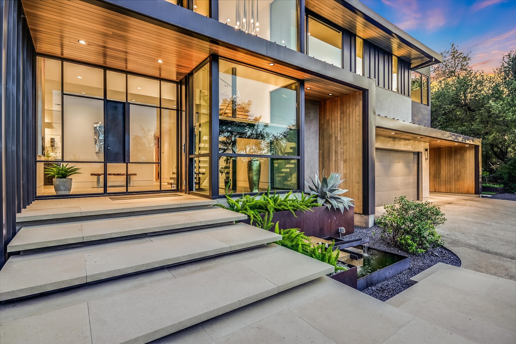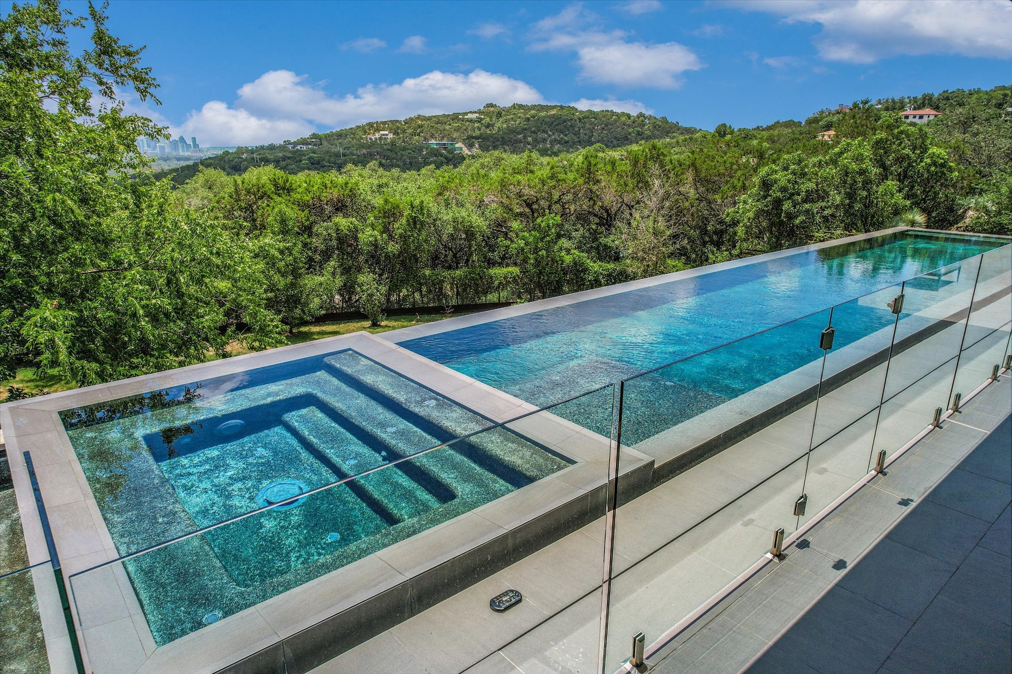 A Modern Masterpiece in Westlake Hills Perched atop one of Westlake Hills’ highest points, minutes from downtown, the Waterfall House embodies the pinnacle of modern luxury. This fully gated estate, designed by the acclaimed Dick Clark Architects, offers an immersive living experience w/sweeping skyline views & a seamless connection between nature, design, and technology. Set on over an acre of landscaped grounds & shaded by heritage oaks, the residence blends clean architectural lines w/soft organic elements. Steel-and-glass Fleetwood doors open the home to more than 1,000 sqft of covered terraces, where downtown Austin becomes part of the visual canvas. Built in 2013 by John Luce with additions made in 2019 The main living features raised ceilings, plaster walls, fireplace, custom Bocci chandelier, Hemlock-paneled ceilings, & Italian porcelain tile floors (that continue outdoors) to heighten the sense of fluidity between interior & exterior. At the heart of the home lies a state-of-the-art kitchen outfitted w/Leicht cabinetry, Miele appliances, wine fridges, galaxy-quartz counters, & Blanco sinks. The home offers a total of six bedrooms (all ensuite), including 2 guest suites on the main level one w/Murphy bed, kitchenette, & private entry, ideal for an office, long-term visitors or home gym. Upstairs, a media room and game room anchor the four additional bedrooms. The primary suite is a private retreat made for slowing down, complete with a Victoria + Albert soaking tub, Kohler rain shower, custom closets, & direct access to the pool terrace. Floor-to-ceiling windows offer cinematic downtown views, while motorized blackout shades ensure restful nights. Outdoors swim beneath the stars, gather on the expansive terrace, or simply listen to the breeze drift through the oaks. Cutting-edge systems ensure comfort & peace of mind, including a full perimeter security system and a 60W Generac generator powered by a 1,000-gallon propane tank.